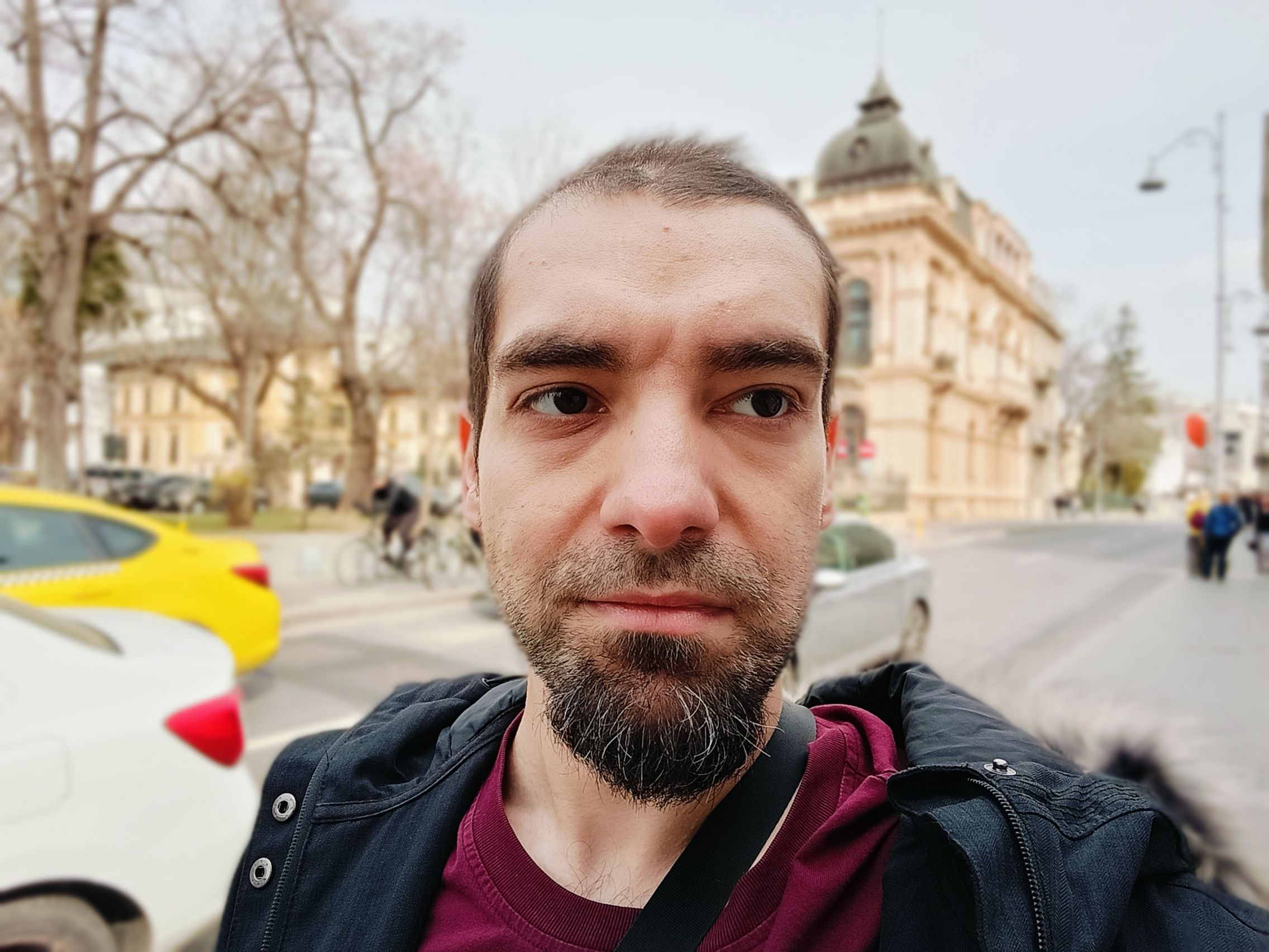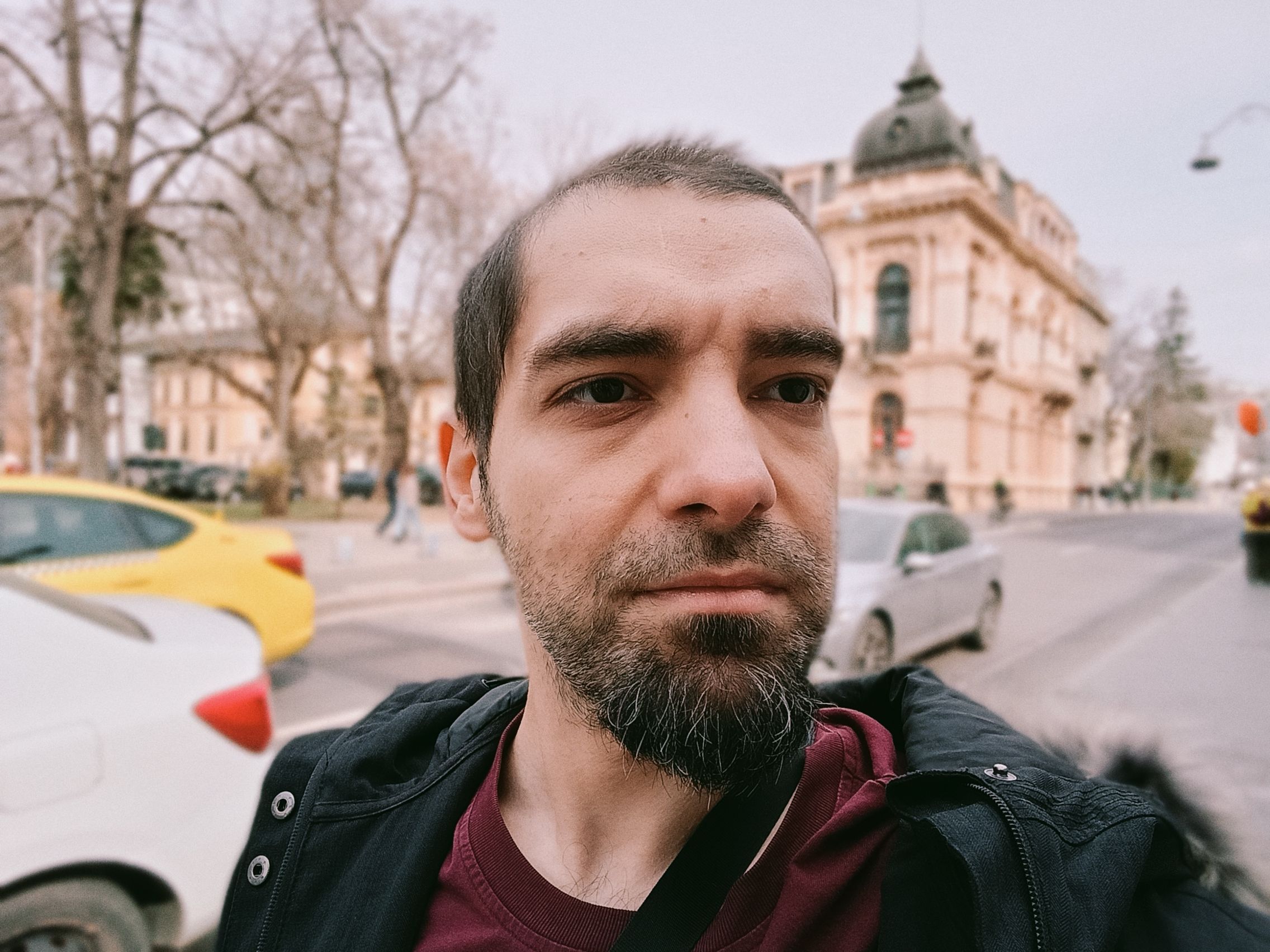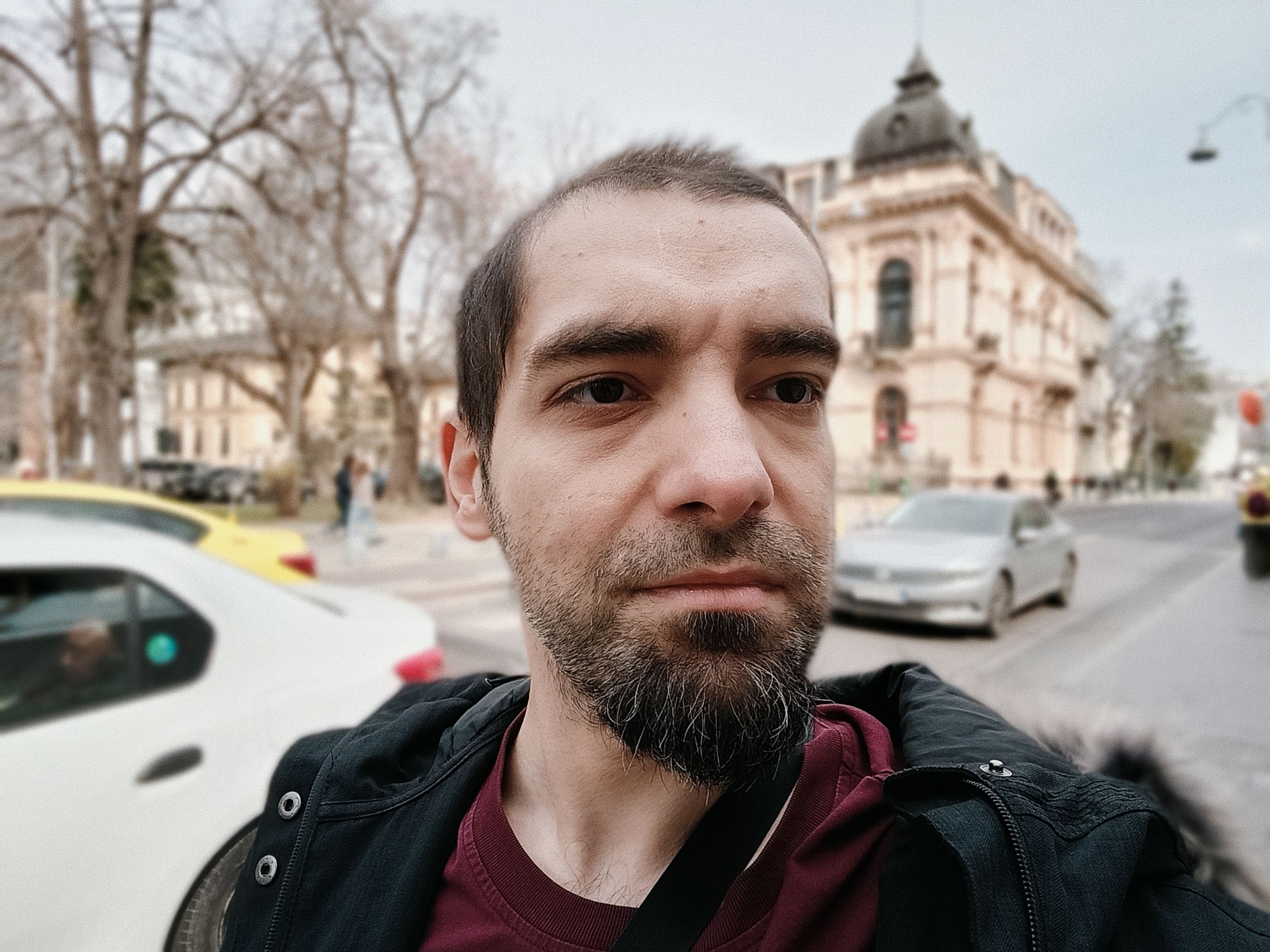 Selfie-urile? Expresive, focalizate decent, dar fără detalii prea multe în fundal. Bokeh corect aplicat, subliniind detaiile faciale, că gropiţe, dungi de expresie, riduri, încruntări sau zâmbete. Sunt şi multe efecte cu care să te joci, dar atenţie la expunerea fundalului. Luciul maşinilor de pe Calea Victoriei e veridic, nimic de rău de zis aici, dar obiectele de la distanţă, dacă nu ai ales captura Hi Res vor păli că detalii.