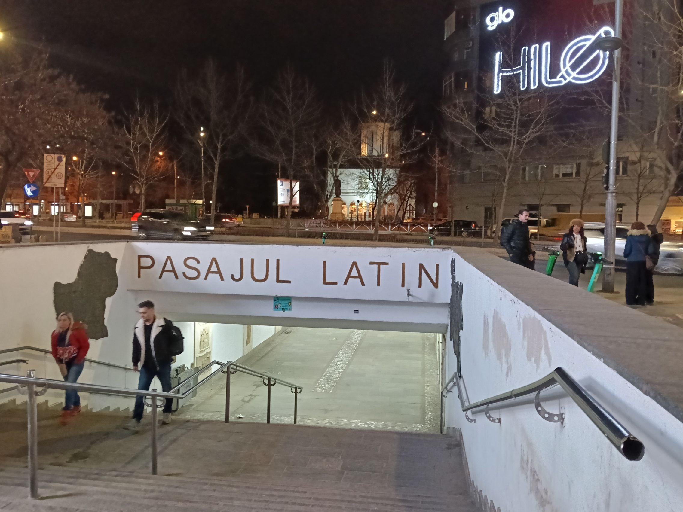 Am filmat şi un cotoi, relativ clar în plan apropiat, apoi camera a fost confuzată de panoul luminos prea puternic şi am pierdut cotârla în neant. Rămânem cu filmarea cu ratonii şi copacul de la magazin, cea mai expresivă de pe timp de noapte. Şi avem şi un lăutar aşa spre final de captură video, în Pasajul Latin, tipic pentru melanjul shaorma-shoturi al unei seri de vineri seara.