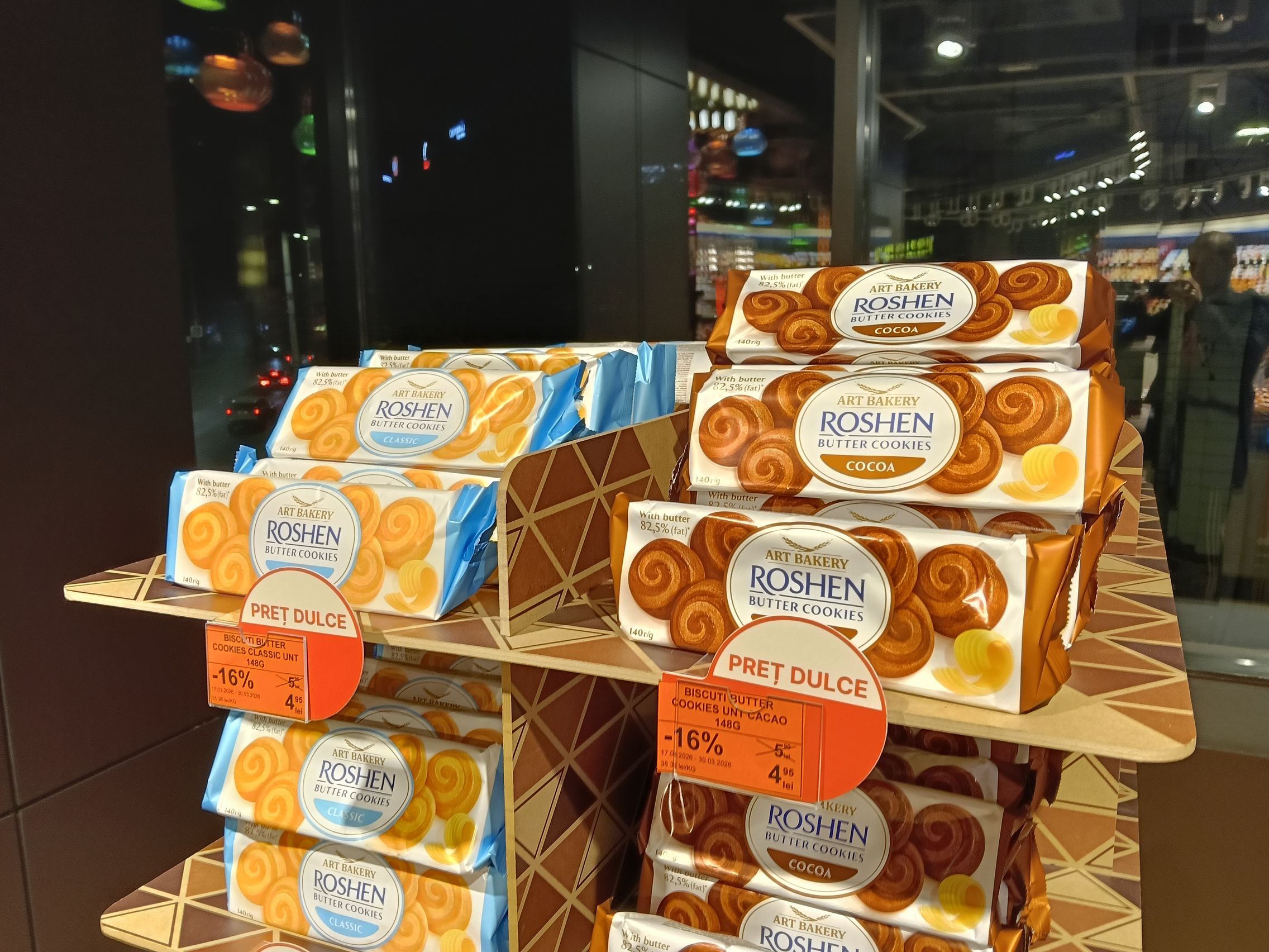 Filmările nocturne la interior se lasă dominate de sursele de lumină. Culorile sunt intense la magazinul de dulciuri Roshen şi totul e lucios. Nu aşa clar ca un Galaxy A totuşi. Sunt şi nişte schimbări abrupte de expunere la un moment dat şi câteva reflexii neplăcute. Testul de stabilizare arată limitările evidente, inevitabile când cobori sub 2000 de lei cu telefonul.