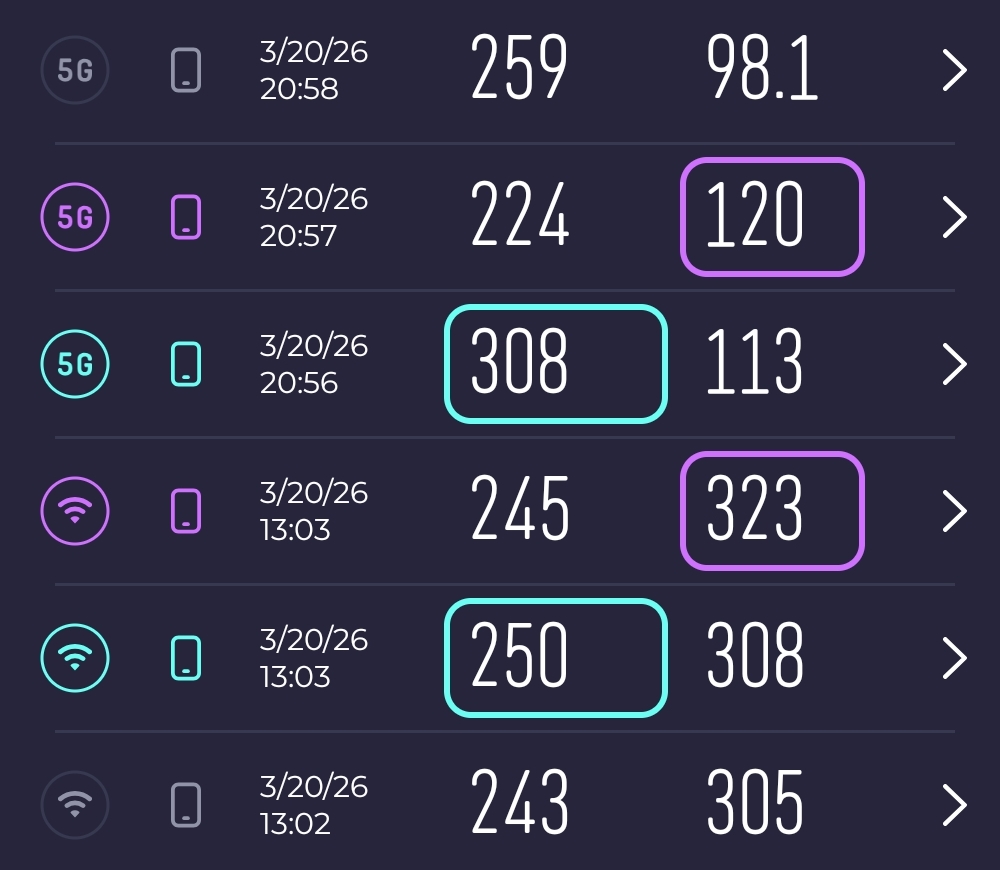 Ca viteze acestea nu sunt spectaculoase din pricina modemului mai cu vechime, iar în SpeedTest am ajuns la 308 Mbps pe 5G la descărcare și 120 Mbps la încărcare date. Pe WiFi 5 pe la 250 Mbps download, 323 upload.
