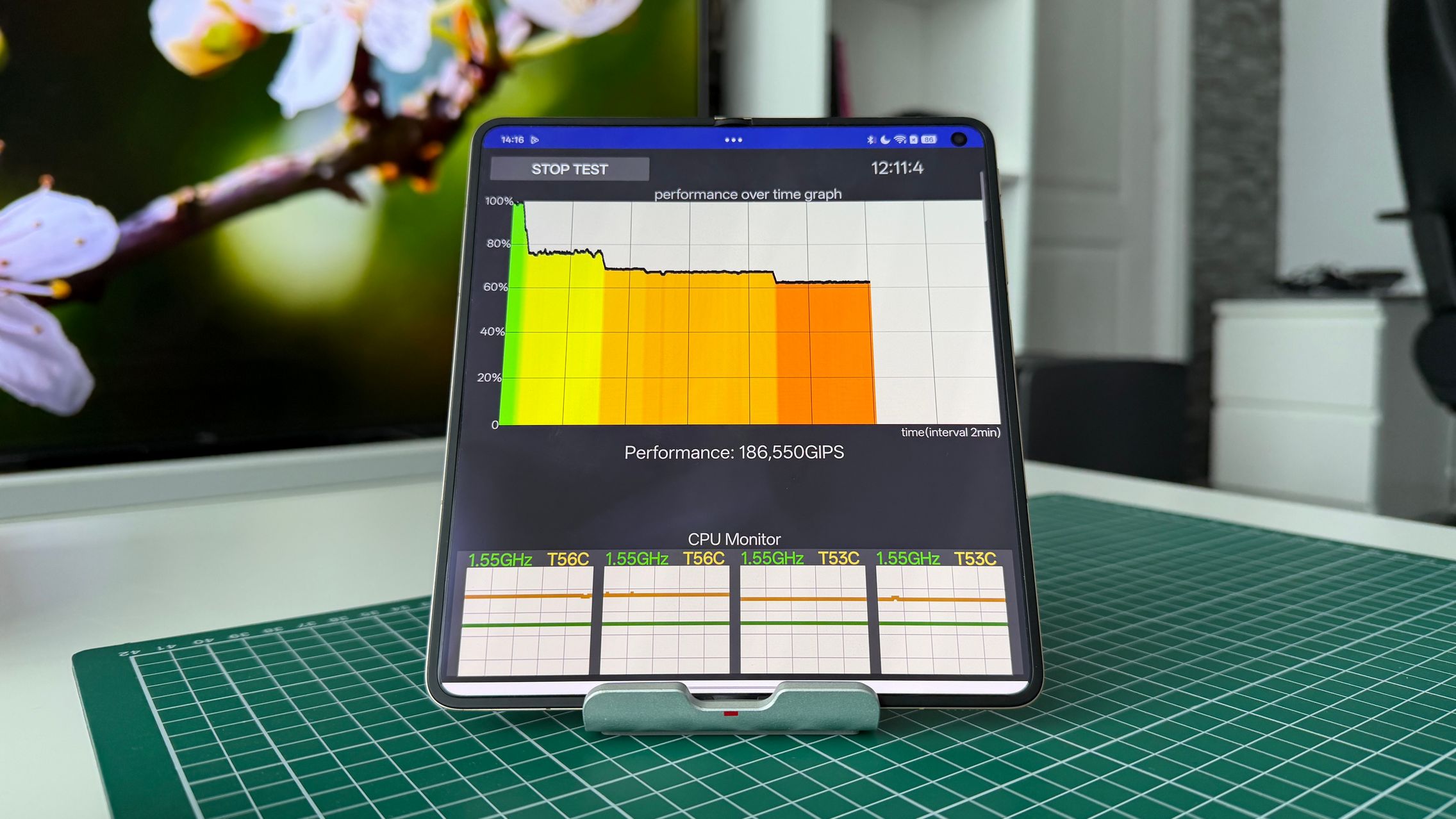 Și aici suntem cel mai puternic pliabil testat până acum. Interesant că la sub-testele grafice OpenCL și Vulkan suntem pe locul 9 la ambele, peste Find X8 Pro, RedMagic 11 Air și ROG Phone 9 Pro. Și-acum throttling-ul, el există dar nu e așa grav, cu 33% performanță pierdută după rularea benchmark-ului. Fold7 pierdea 44% din performanță.