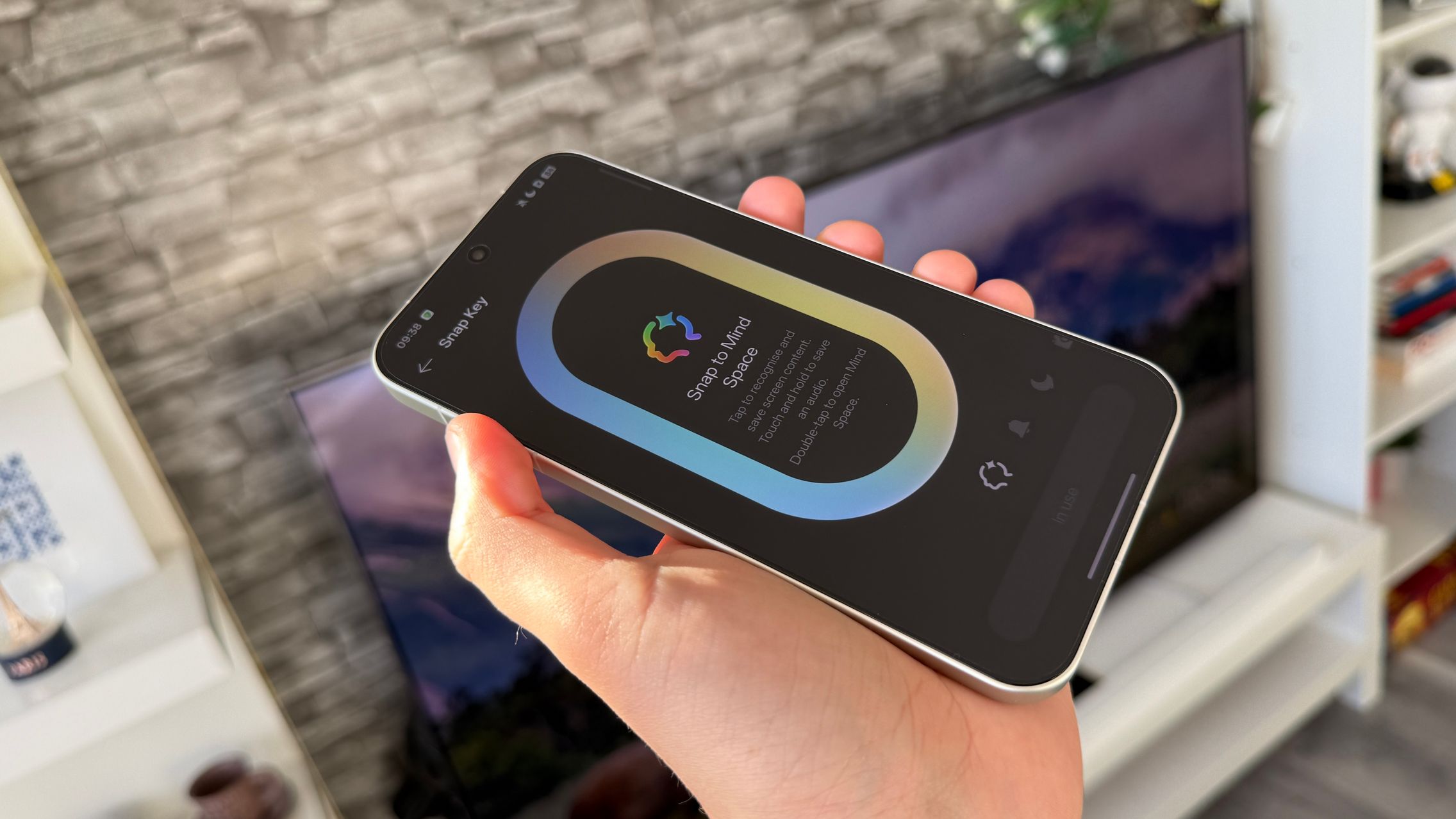 Butonul lateral îţi permite să capturezi informaţii utile, analizate şi introduse în AI Mind Space. Apeşi pe ecran scurt şi capturezi conţinutul de pe ecran, apeşi lung şi adaugi o notiţă vocală şi cu o dublă apăsare deschizi direct Mind Space. Iar tot ce ajunge acolo e "citit" de AI. Notiţa vocală e tradusă în română, pozele sunt descrise, datele unui zbor sau concert ţi se propun spre introducere în calendar.