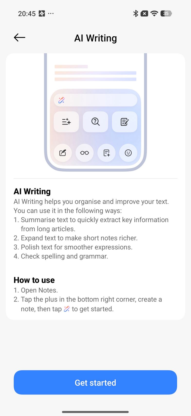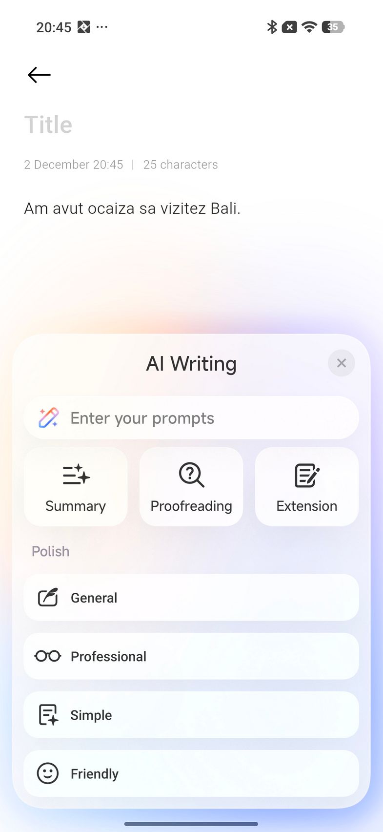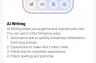 - AI Writing (organizare și îmbunătățire text, rezumat, rescriere, polish text)