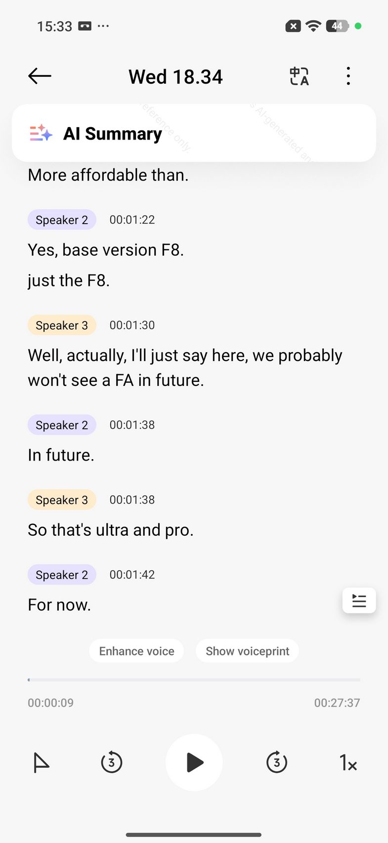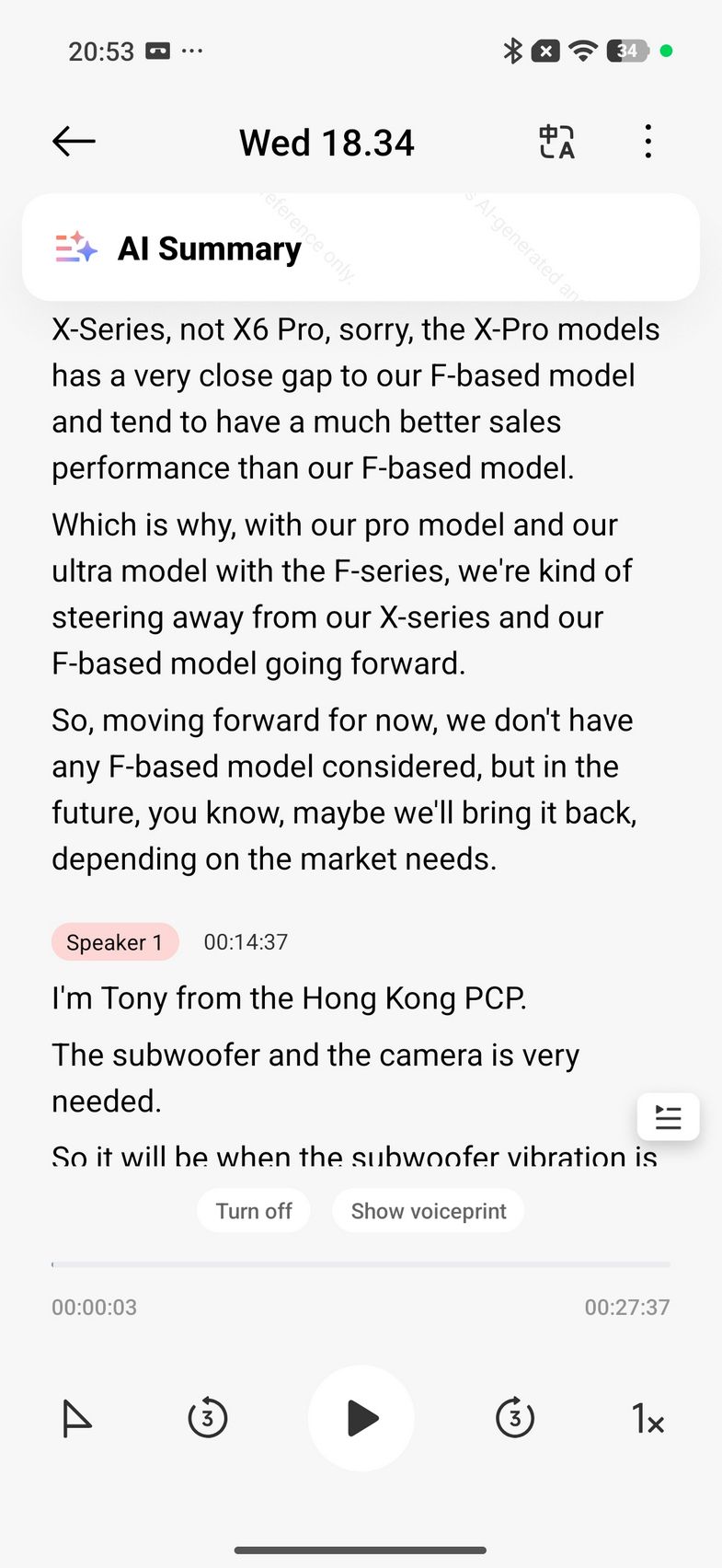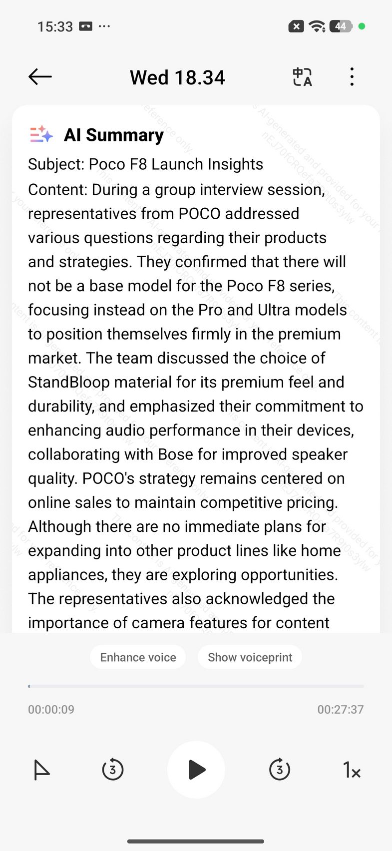 Eu am pus serios la treabă AI Speech Recognition în cadrul interviului de grup POCO, iar la final am avut un rezumat AI cu toate cele discutate, cu vorbitorii detectați și textul excelent transcris, chiar dacă nu toți jurnaliștii au avut microfonul la îndemână atunci când puneau întrebări.