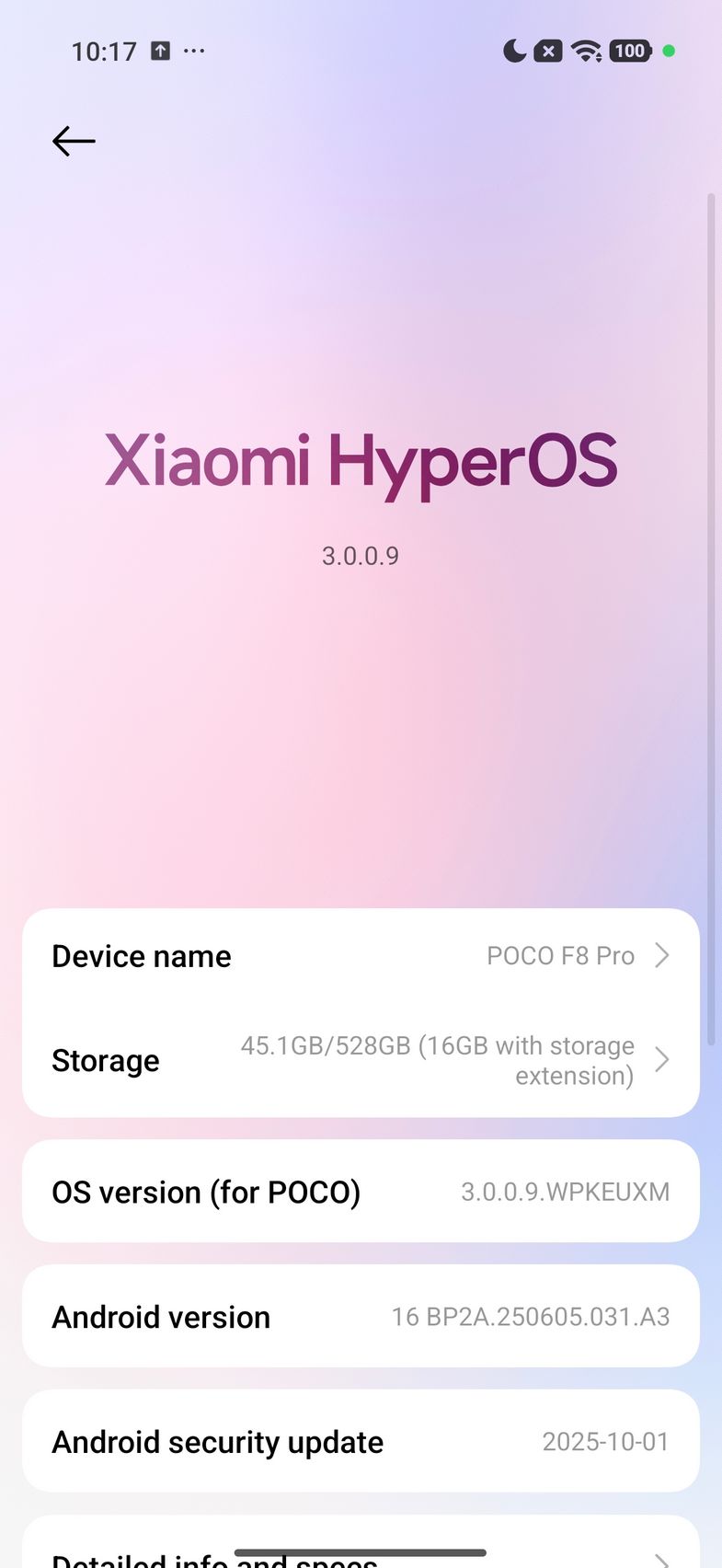 POCO F8 Pro a sosit cu HyperOS 3.0.0.9 și Android 16 la bord, dar chiar înainte de finalizarea recenziei sale a venit un update mai generos de 1.5 GB prin care s-a făcut trecerea la HyperOS 3.0.5.0.WPKEUXM. Aduce o experiență mai stabilă, îmbunătățiri de performanță și multe alte schimbări ce se petrec în fundal și care așteaptă să fie descoperite. Va primi 4 ani de actualizări majore Android și 6 ani de actualizări de securitate.