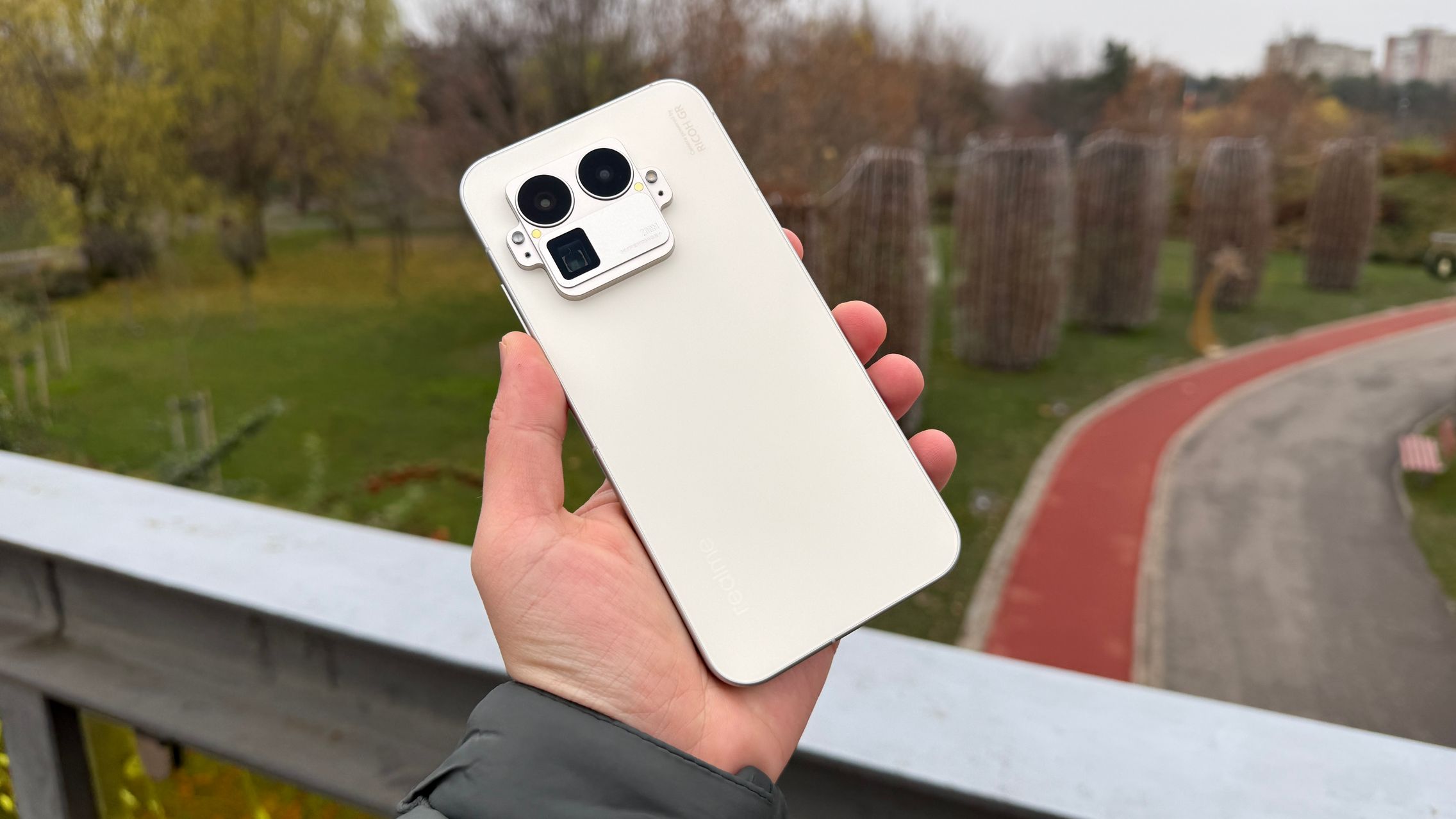 realme GT 8 Pro adoptă un design atipic, în cel puţin două privinţe. Pe de o parte avem acea decoraţiune detaşabilă pentru modulul foto, pe de altă parte spatele nu e fabricat chiar din sticlă, cum sunt alte flagship-uri. E mai degrabă vorba despre imitaţie de piele eco sau plastic ranforsat cu o fibră specială.