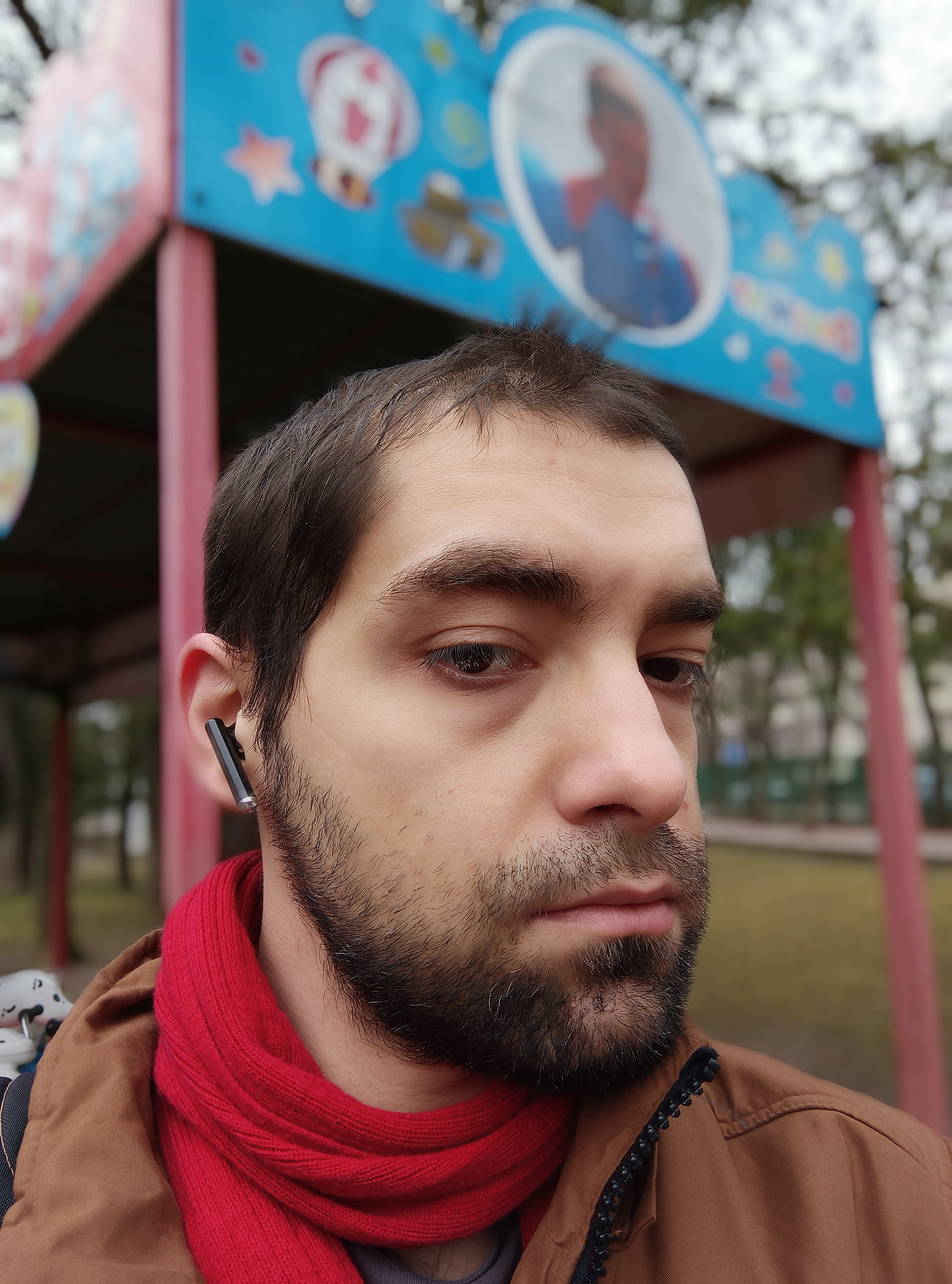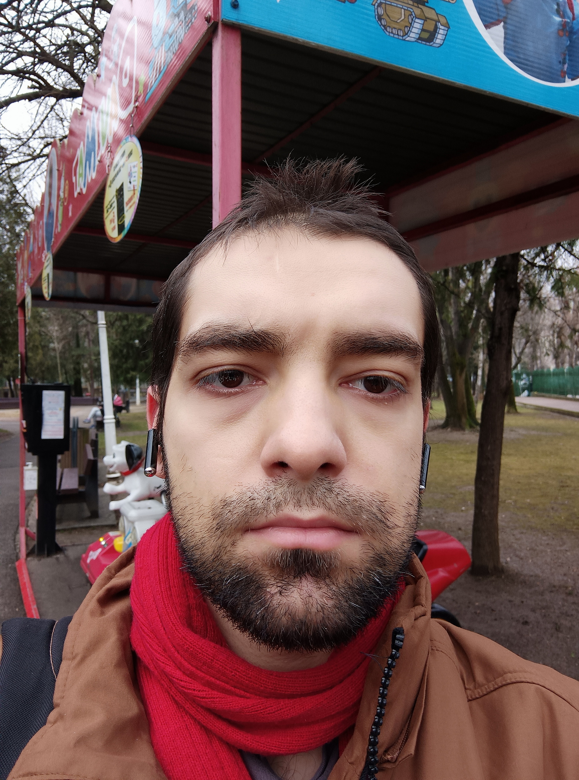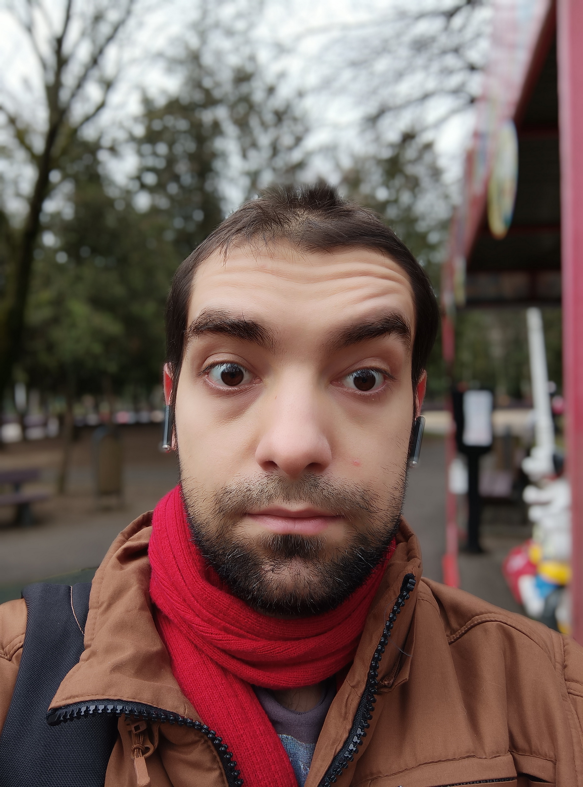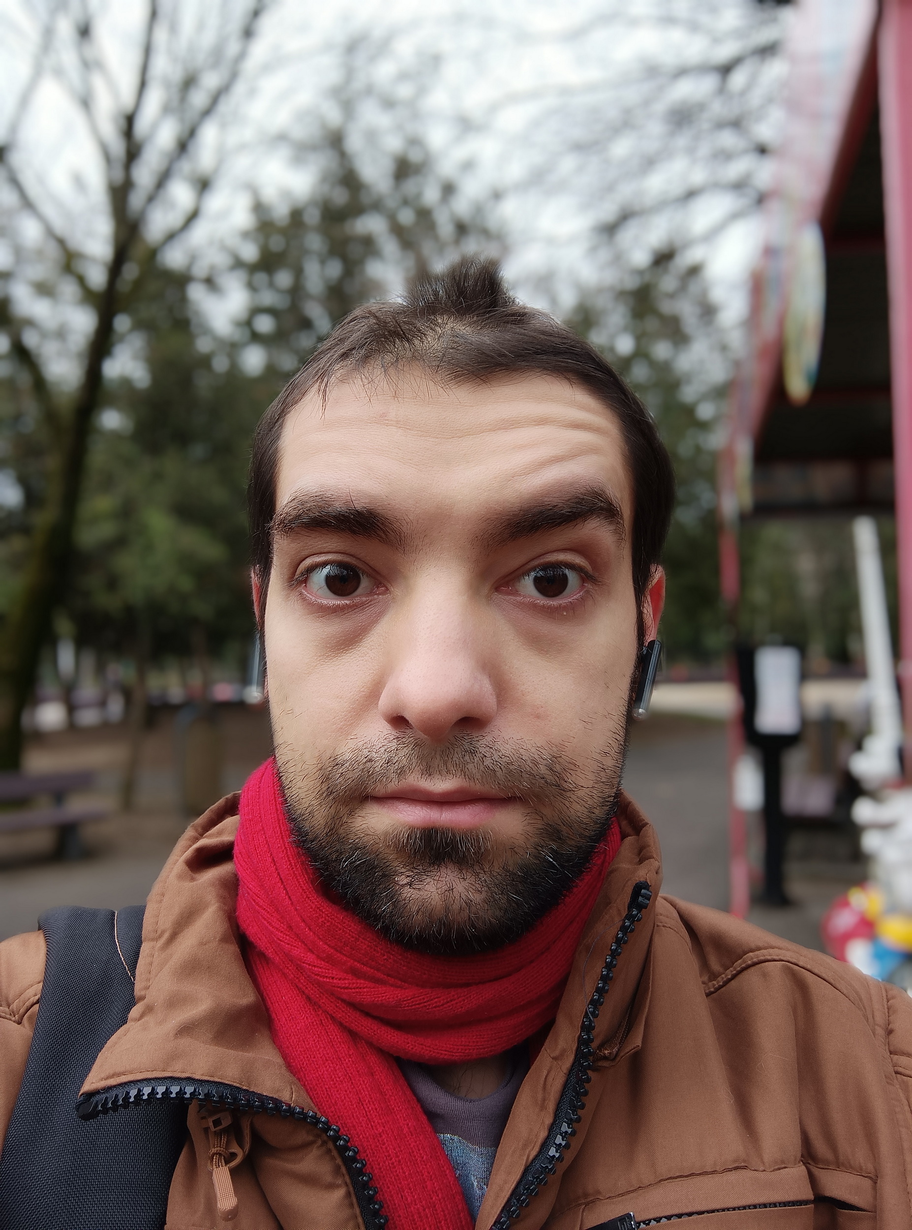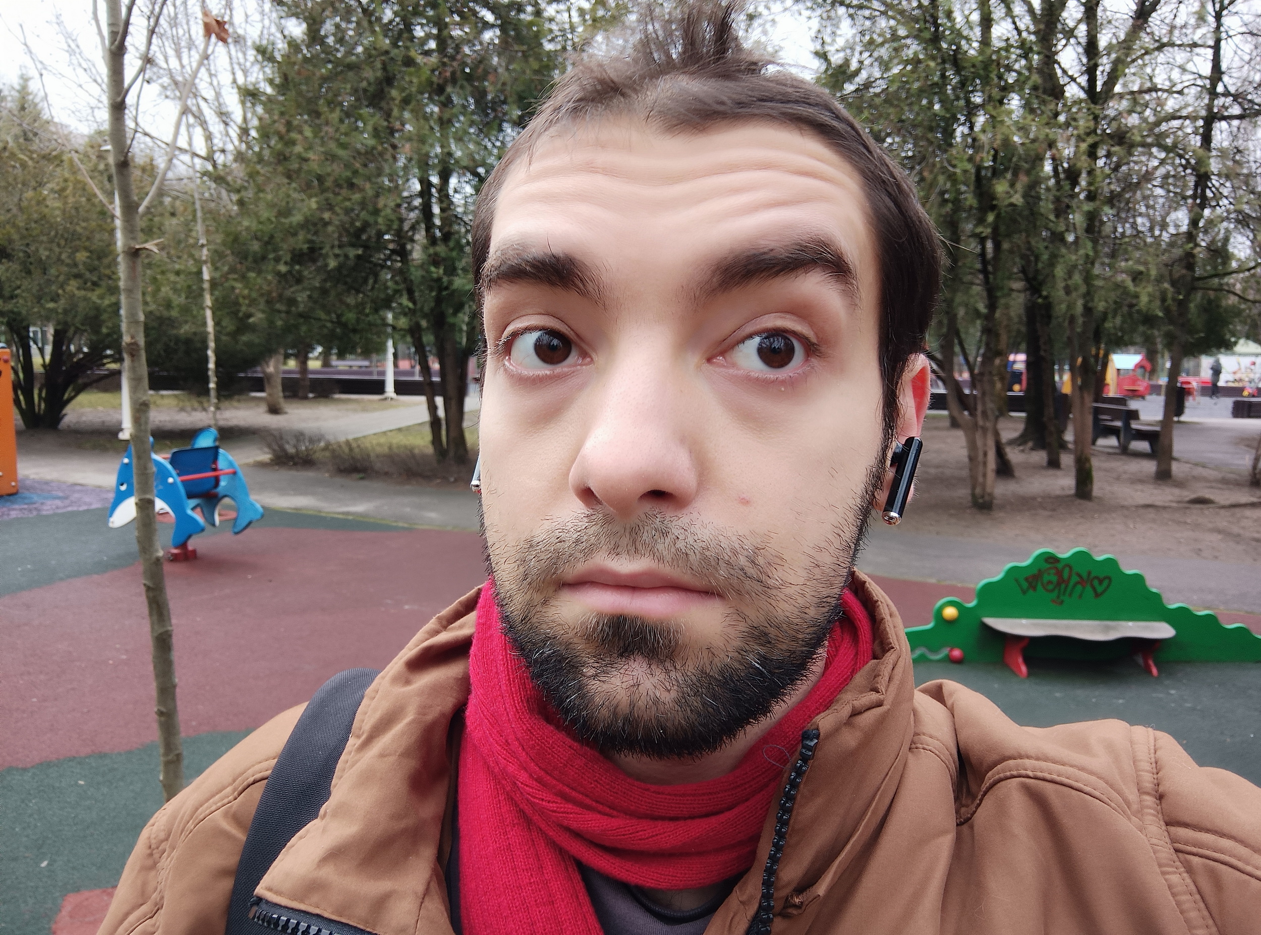 Captură Bokeh am testat-o cu acel dalmaţian, excelent decupat faţă de fundalul sau format din copaci, garduri şi maşini. E un blur eficient aplicat şi convingător. Îmi plac roşul, galbenul, albastrul şi verdele de la acel loc de joacă, deci numai de bine despre culori. Verdele vegetaţiei, atât puţin cât e îmi lăsa impresia că într-o zi cu soare ar ieşi supraexpus. Selfie-urile nu-s rele, dar fața e prea de păpuşă, prea nenaturală. Focalizarea e totuşi mai bună decât la Galaxy A50 sau Oppo Reno 3 Pro 5G să zicem.