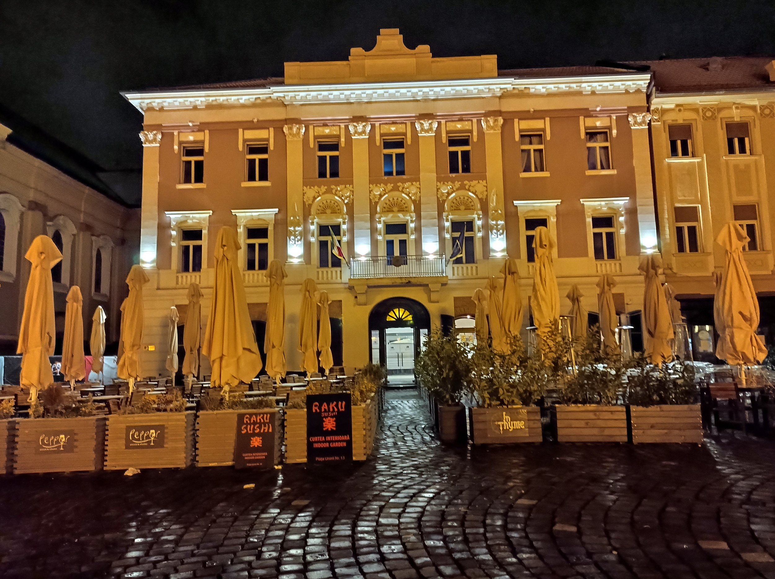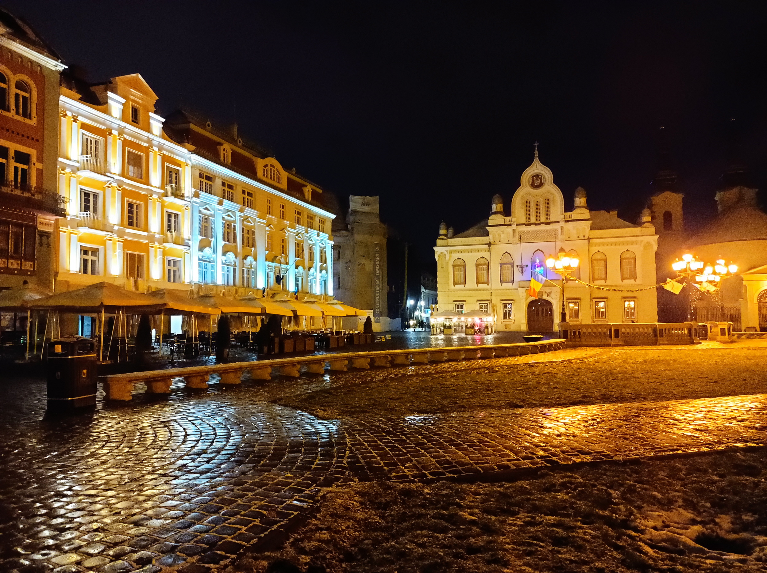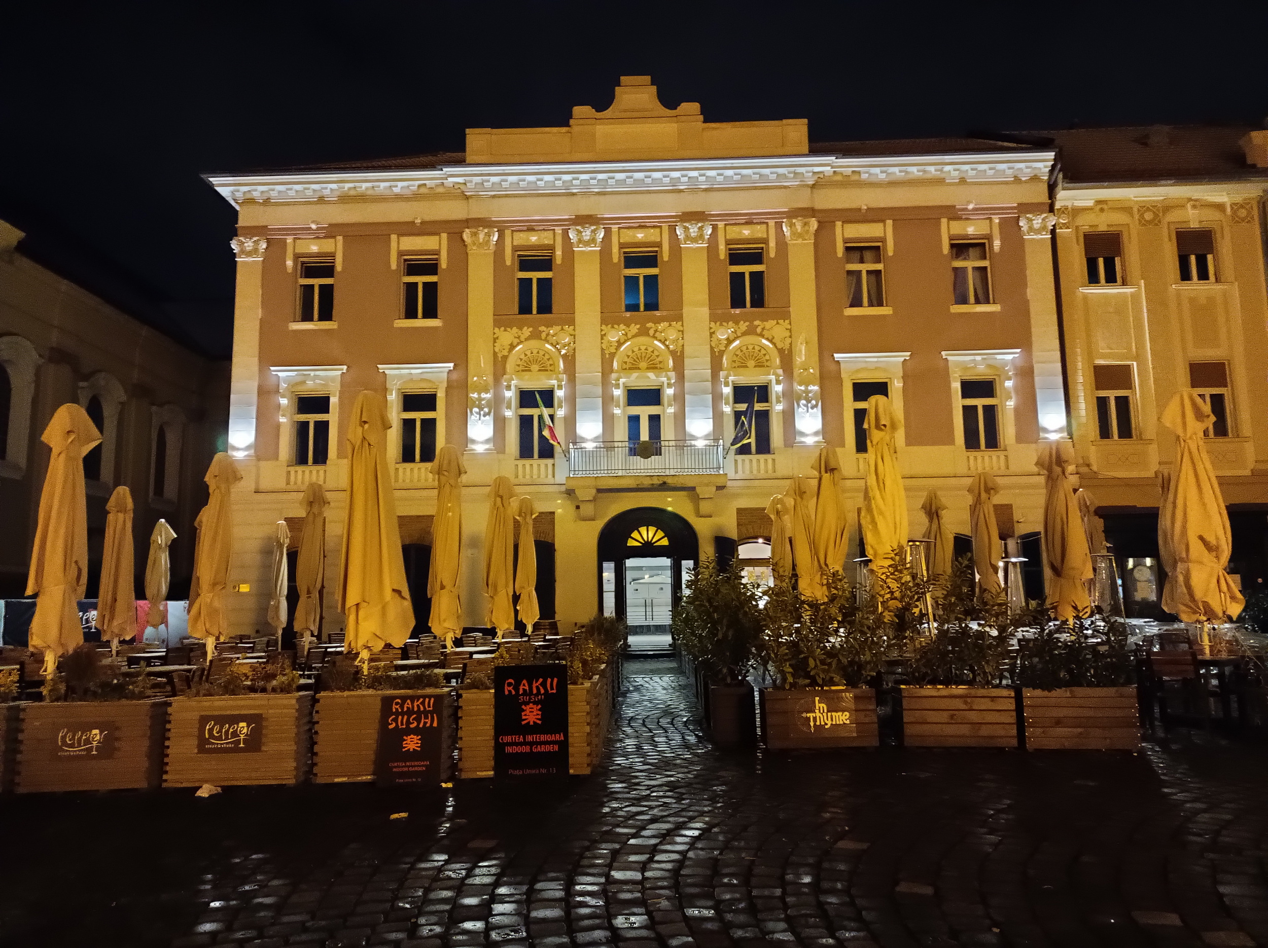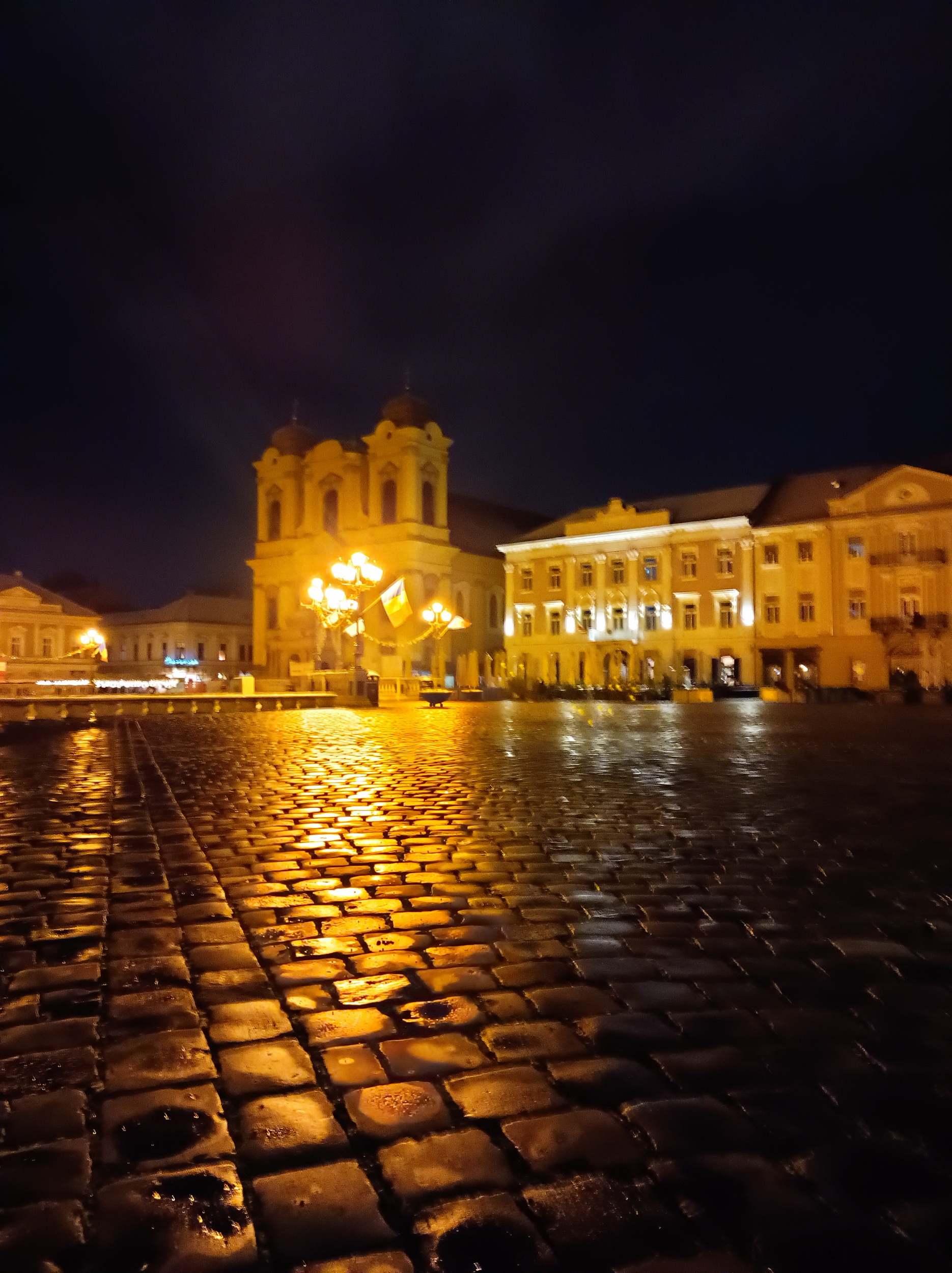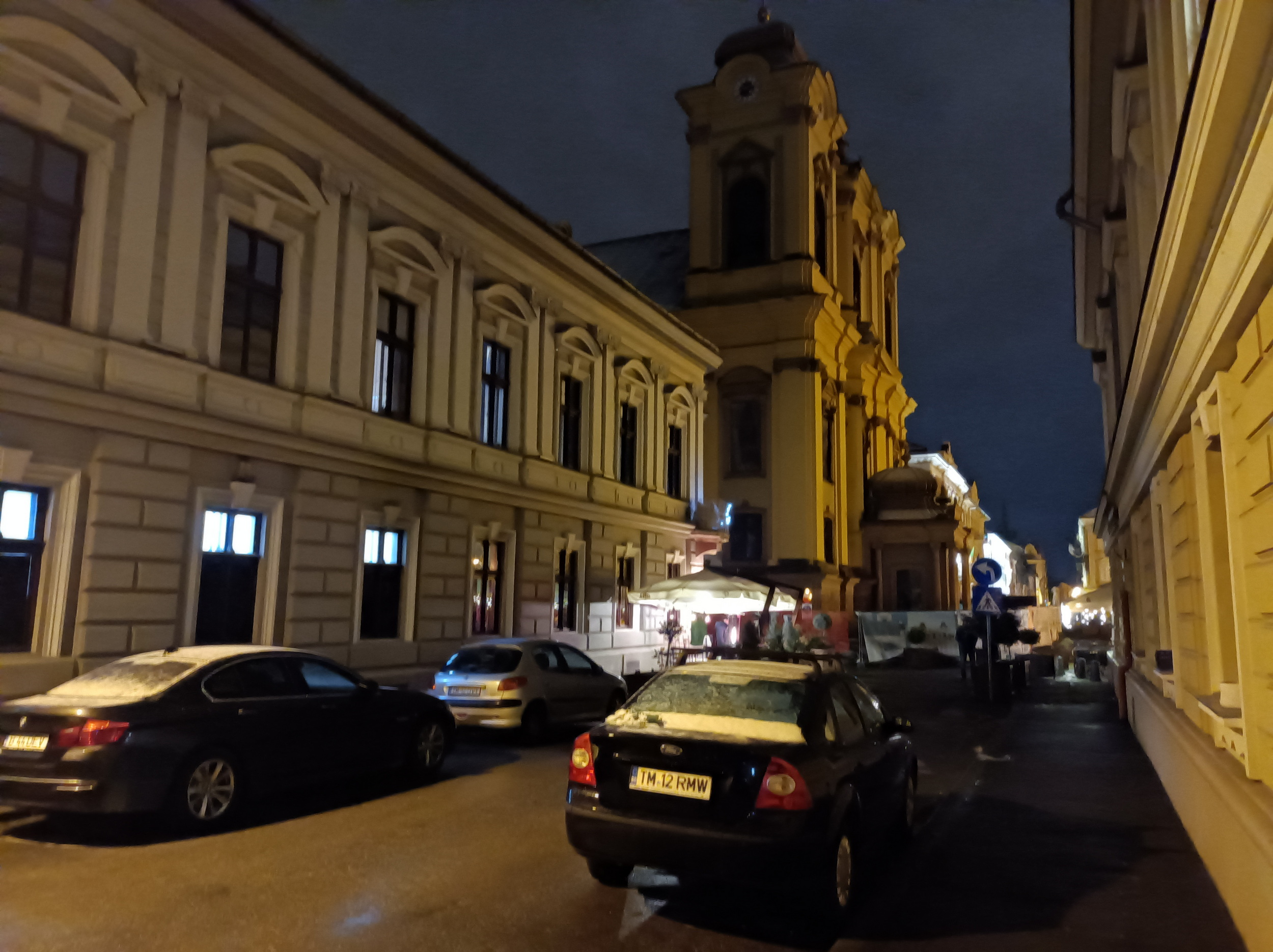 Detaliile arhitecturale ale clădirilor din Timişoara se văd de vreo 2-3 ori mai bine cu acel mod special nocturn de fotografiere. Cerul devine din negru albastru, dar reflexia luminii pe pavajul ud e mai convingătoare fără Night Mode. Nu e rău deloc, e la nivel de telefon Motorola din 2019-2020, pentru că au fost vreo 4 care se descurcau binişor noaptea chiar şi la preţ mic.