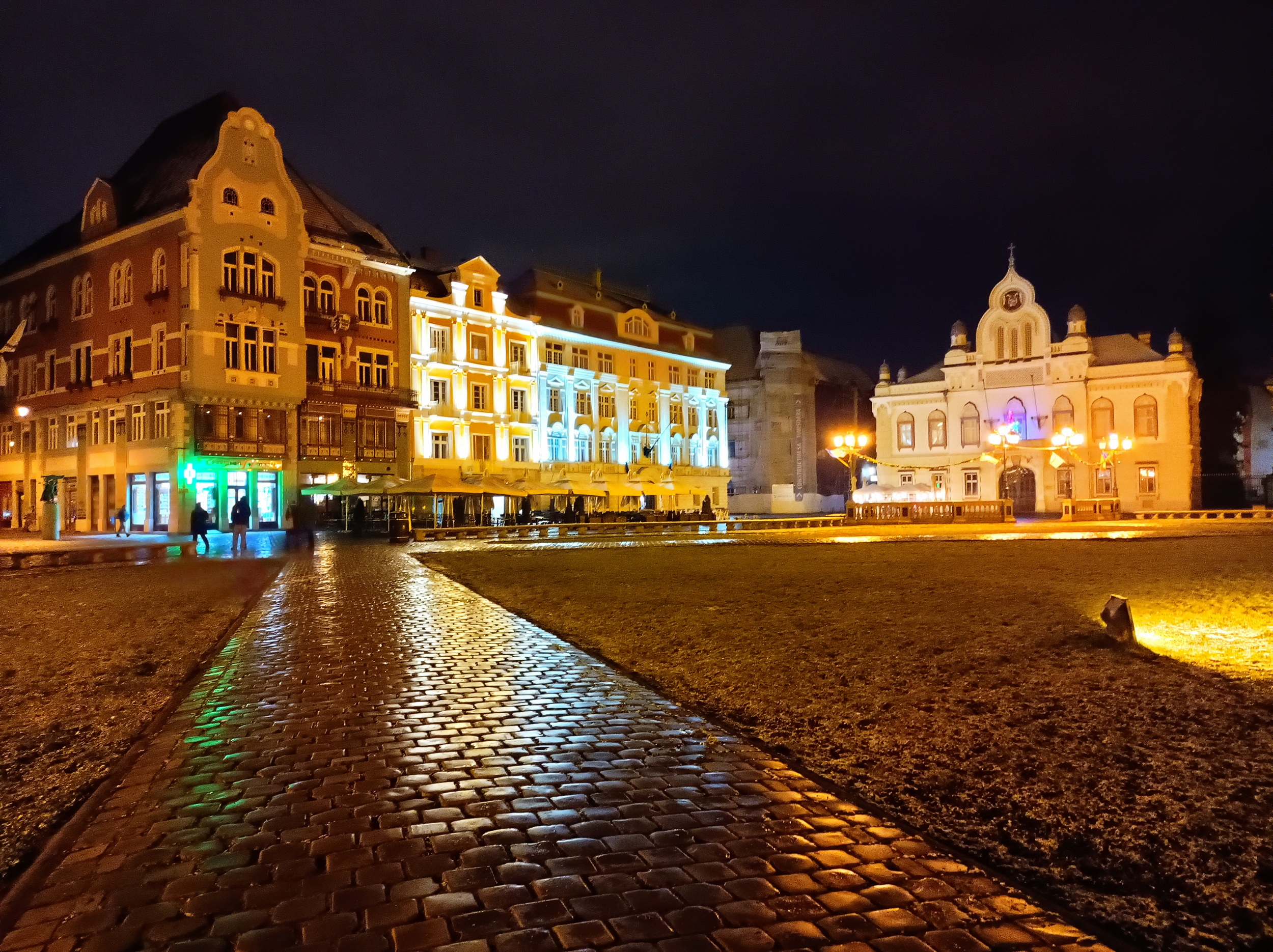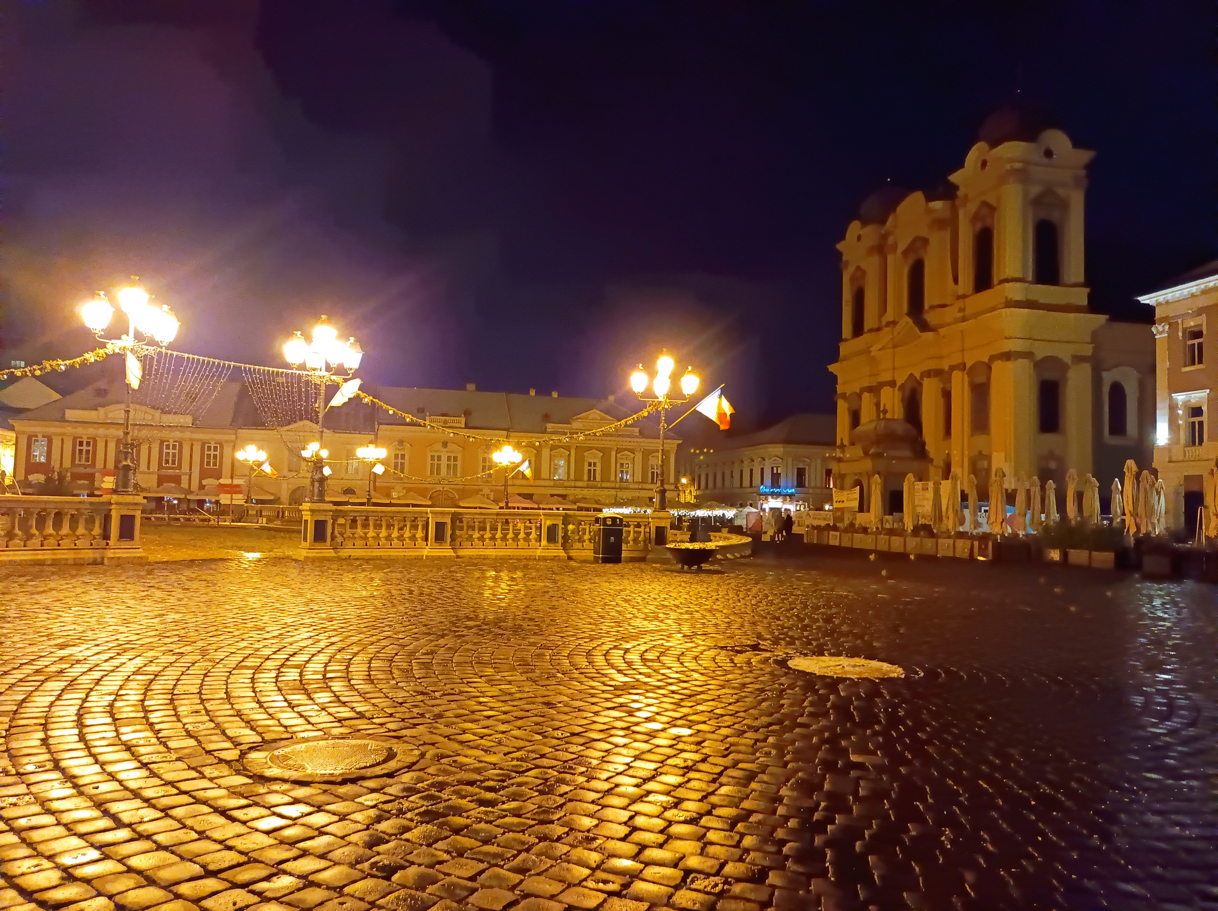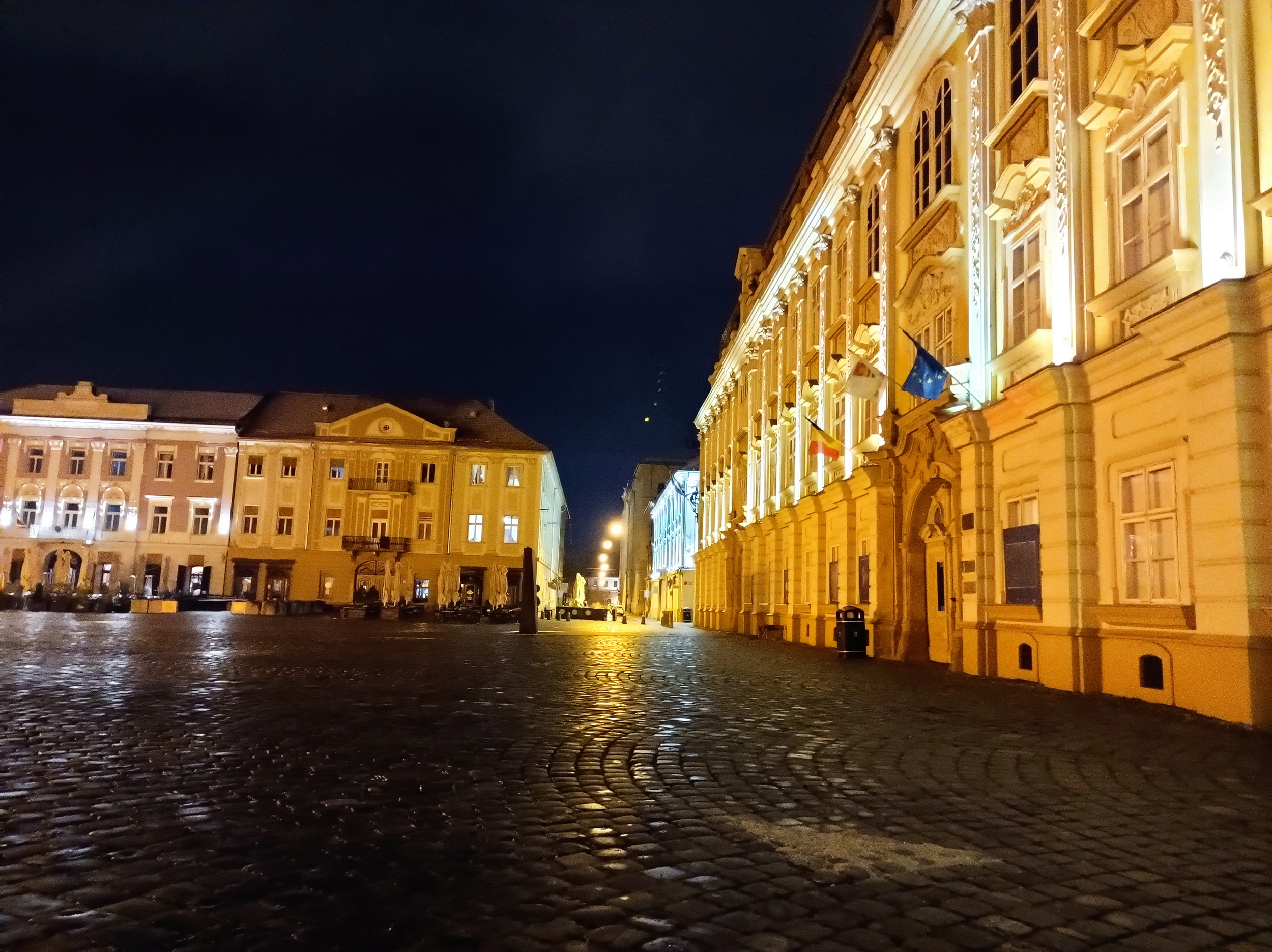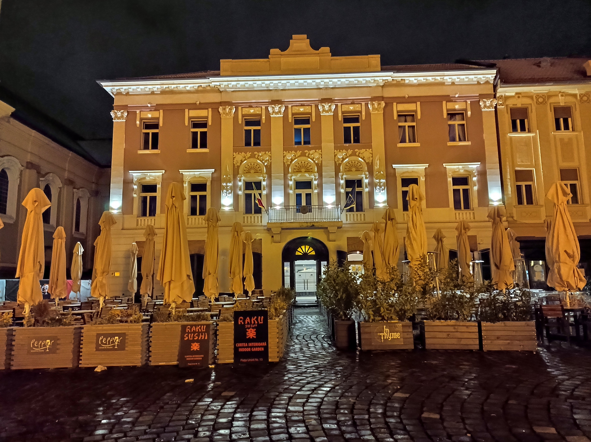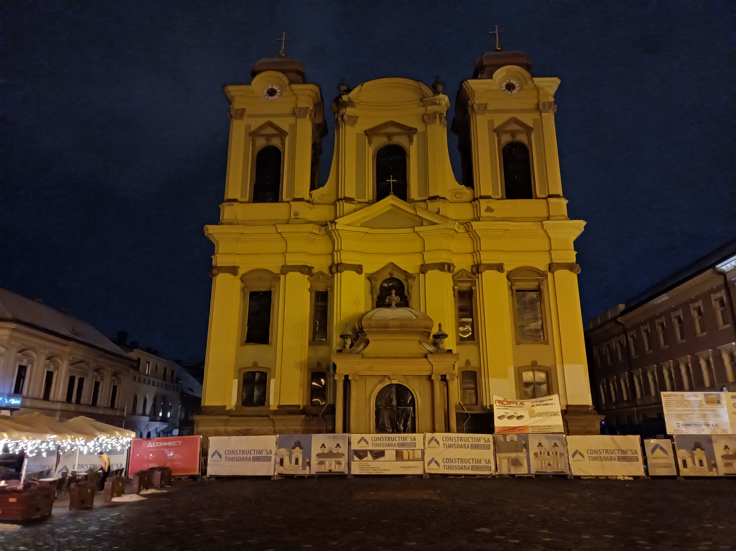 Detaliile arhitecturale ale clădirilor din Timişoara se văd de vreo 2-3 ori mai bine cu acel mod special nocturn de fotografiere. Cerul devine din negru albastru, dar reflexia luminii pe pavajul ud e mai convingătoare fără Night Mode. Nu e rău deloc, e la nivel de telefon Motorola din 2019-2020, pentru că au fost vreo 4 care se descurcau binişor noaptea chiar şi la preţ mic.