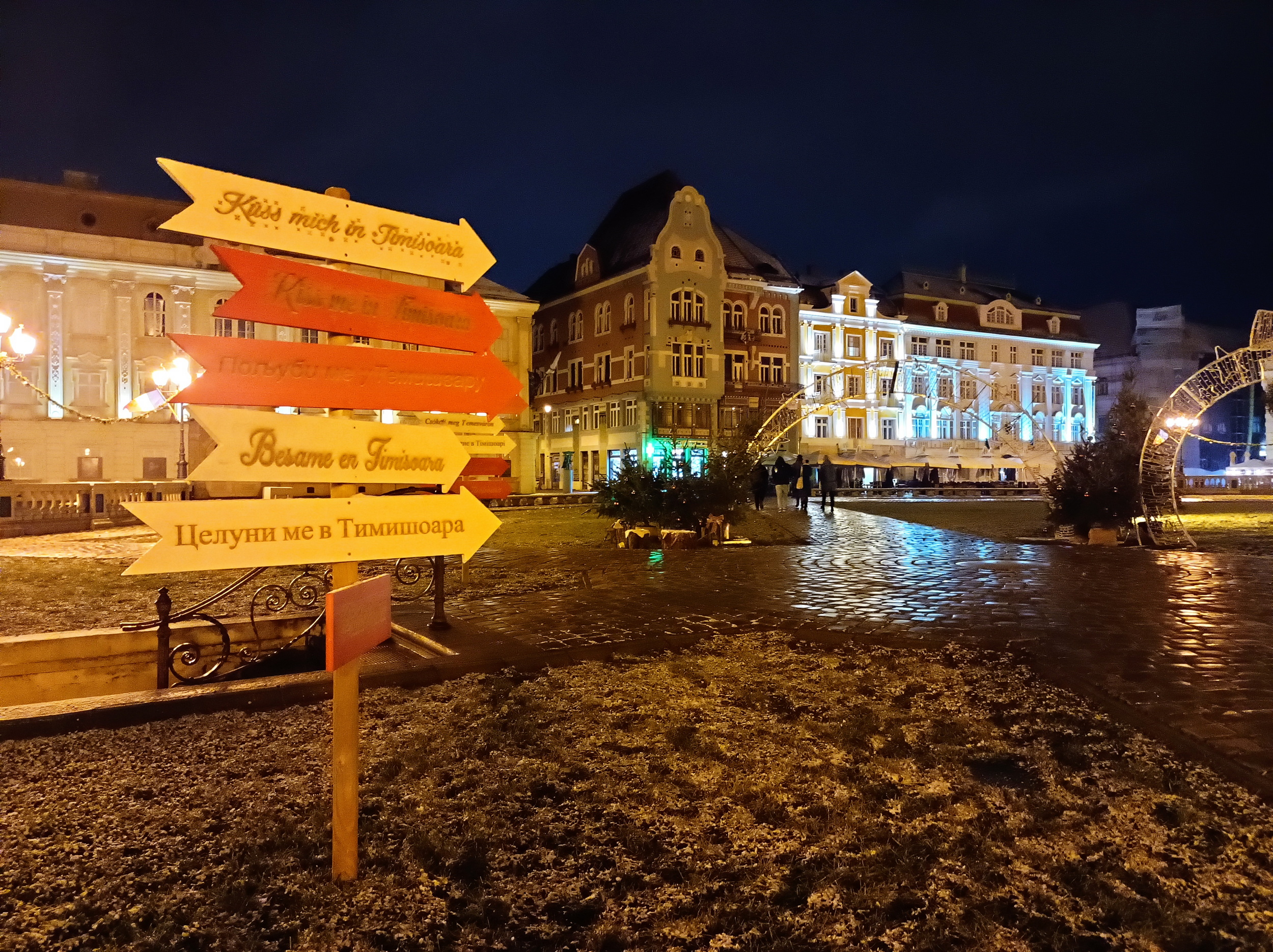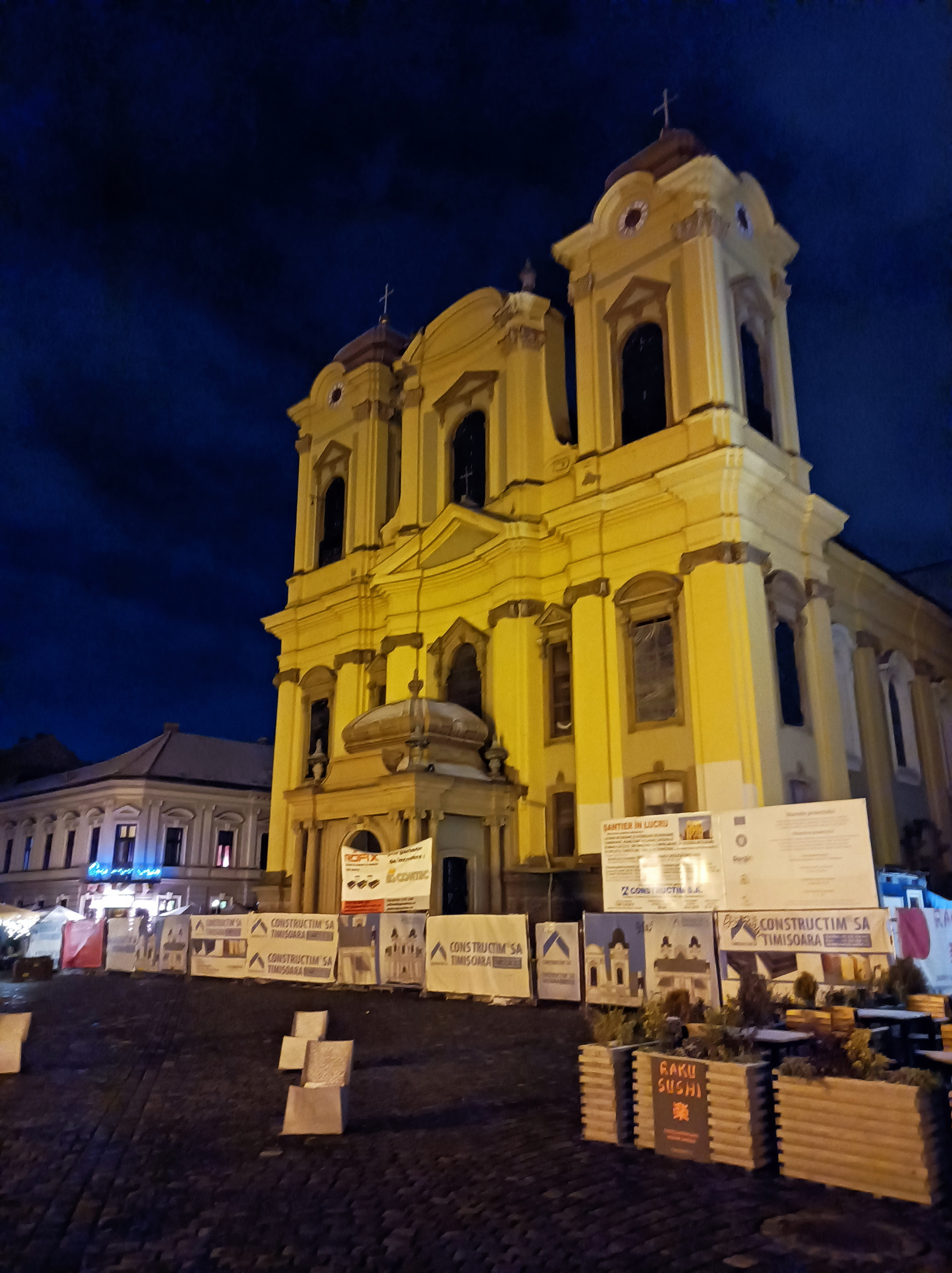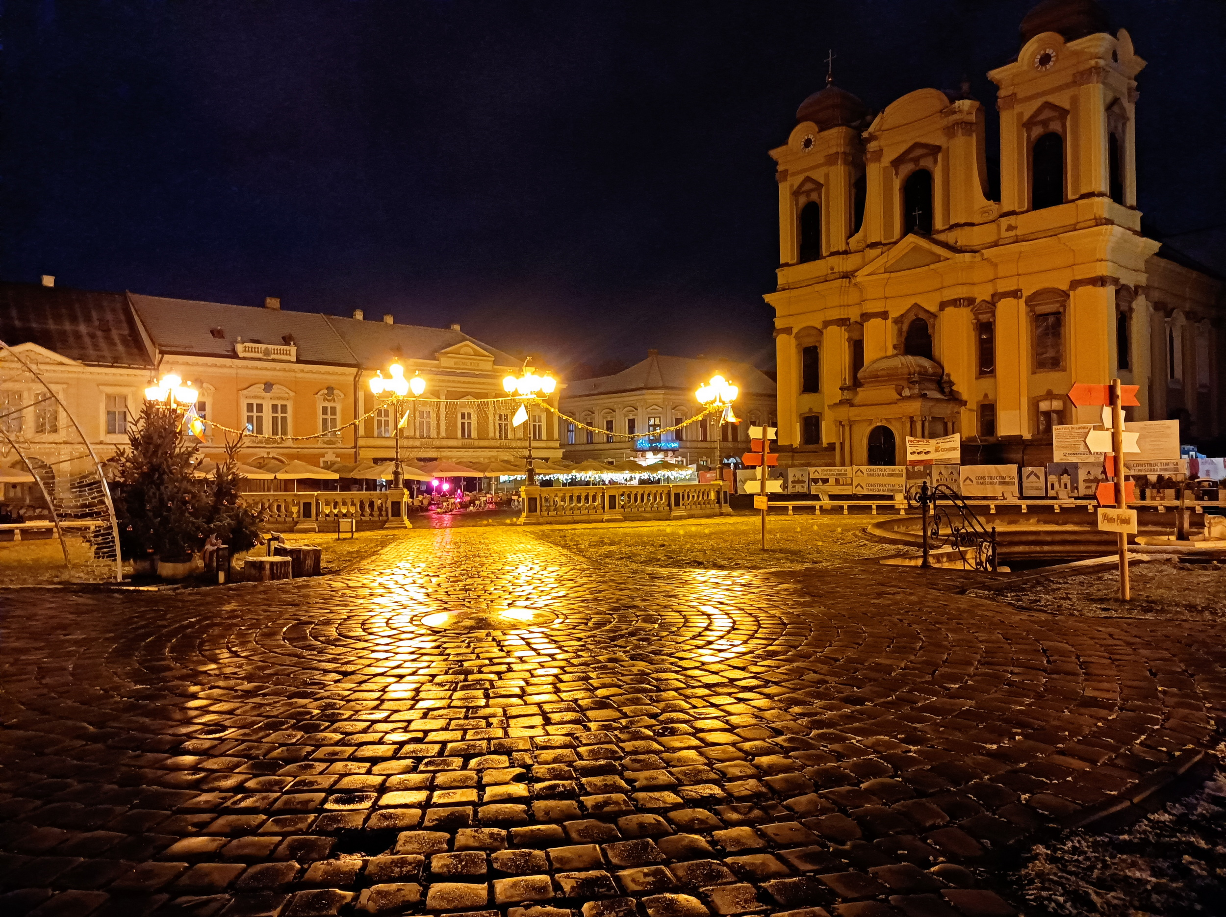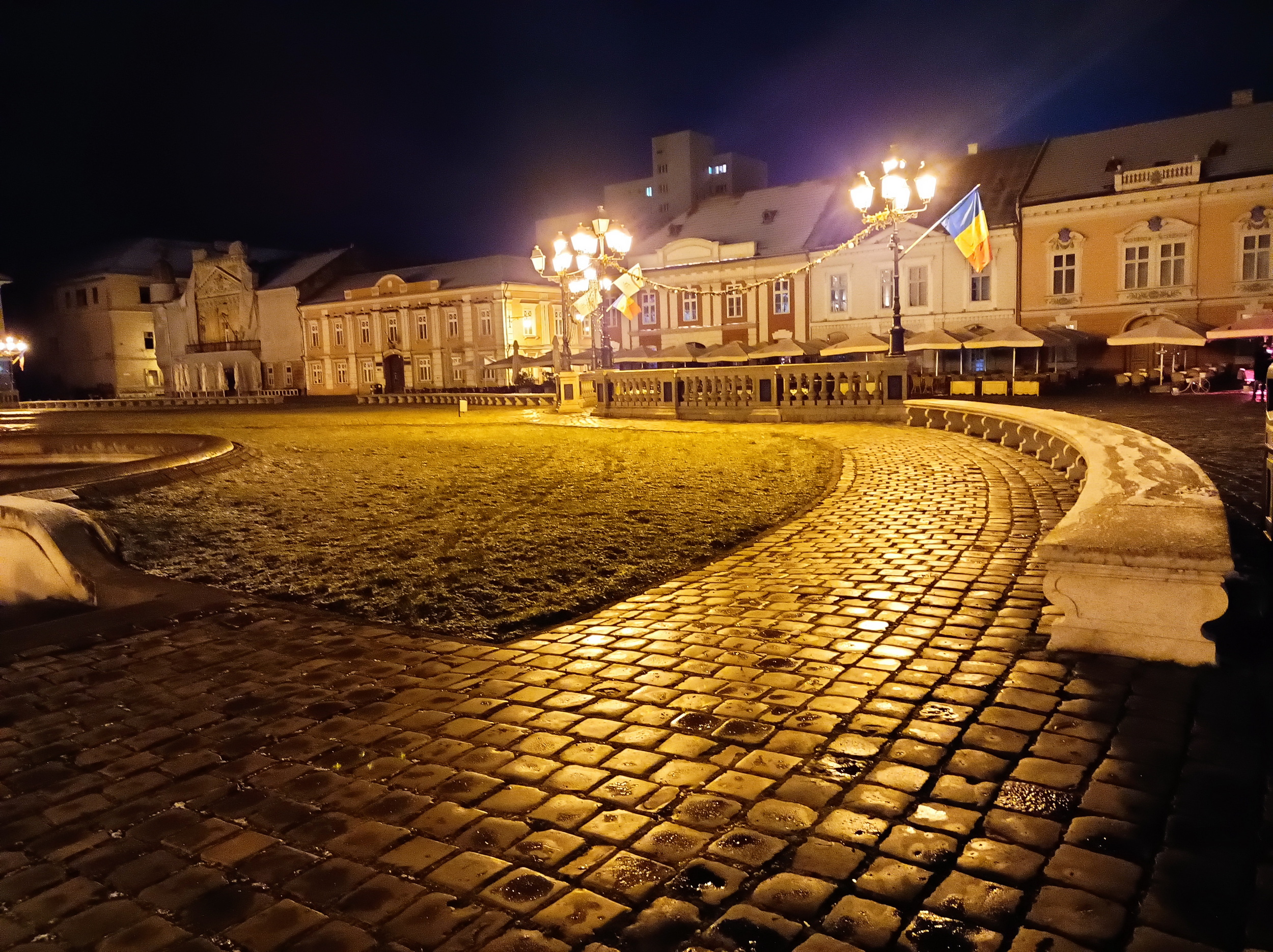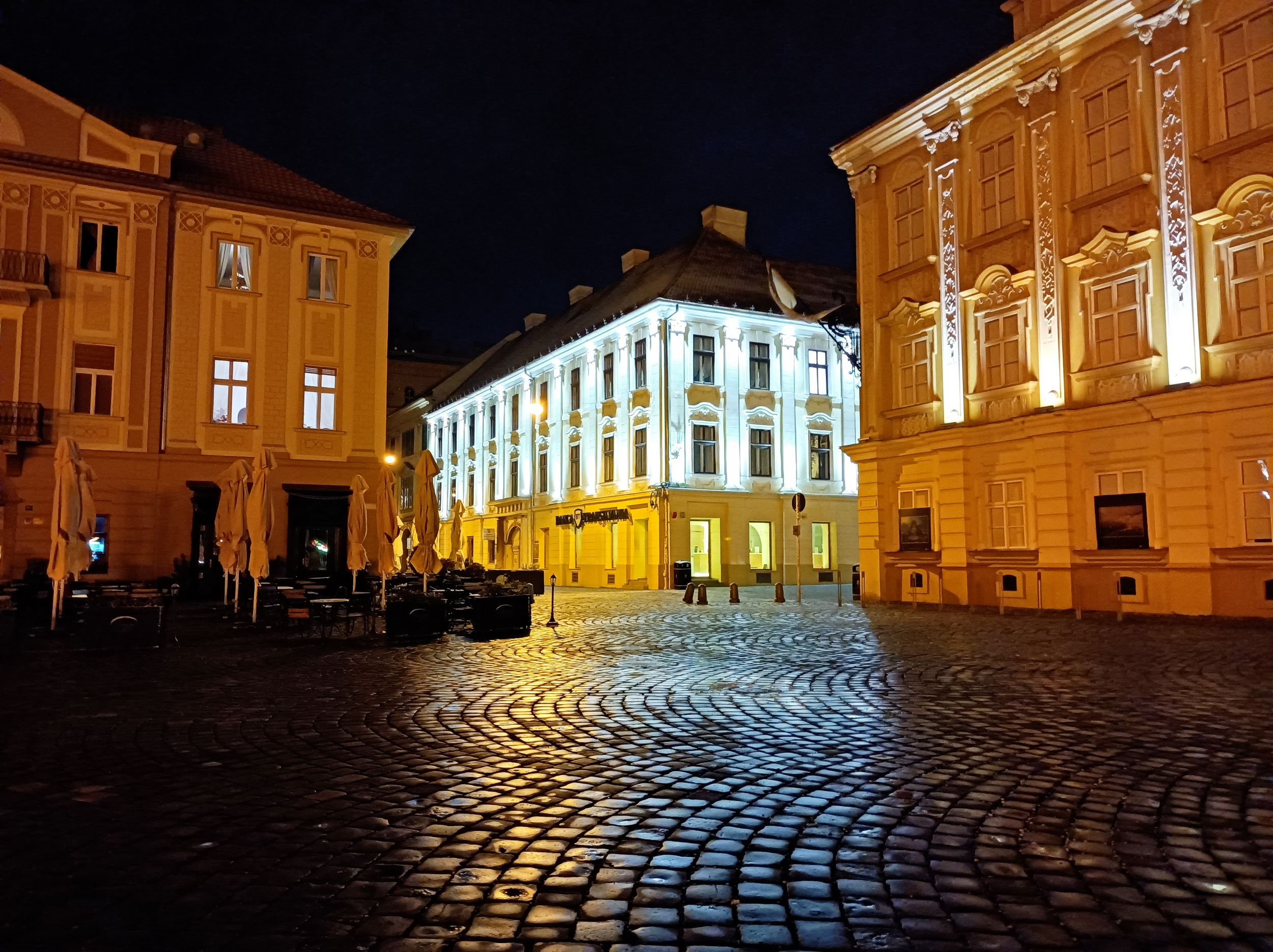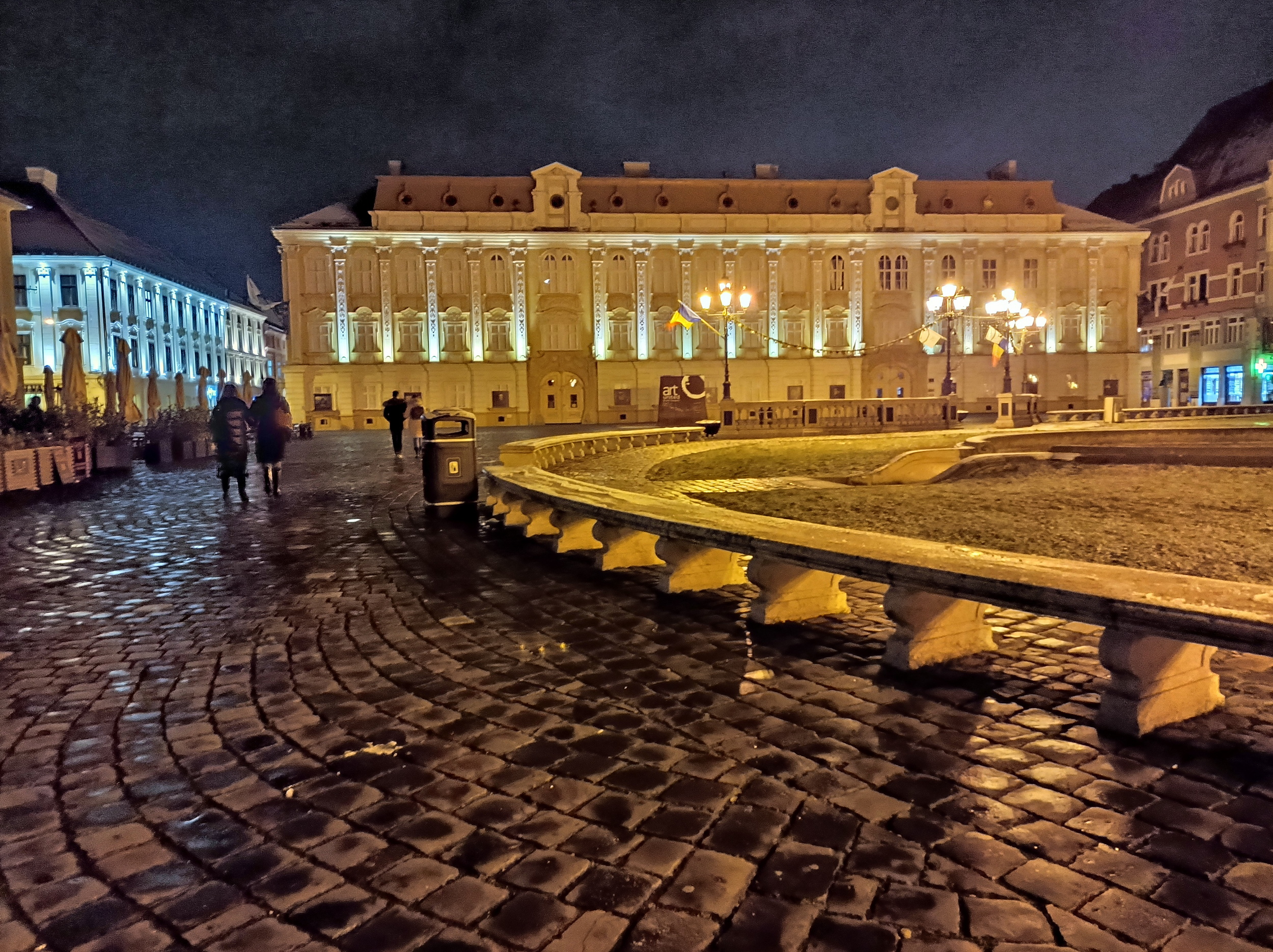 Detaliile arhitecturale ale clădirilor din Timişoara se văd de vreo 2-3 ori mai bine cu acel mod special nocturn de fotografiere. Cerul devine din negru albastru, dar reflexia luminii pe pavajul ud e mai convingătoare fără Night Mode. Nu e rău deloc, e la nivel de telefon Motorola din 2019-2020, pentru că au fost vreo 4 care se descurcau binişor noaptea chiar şi la preţ mic.