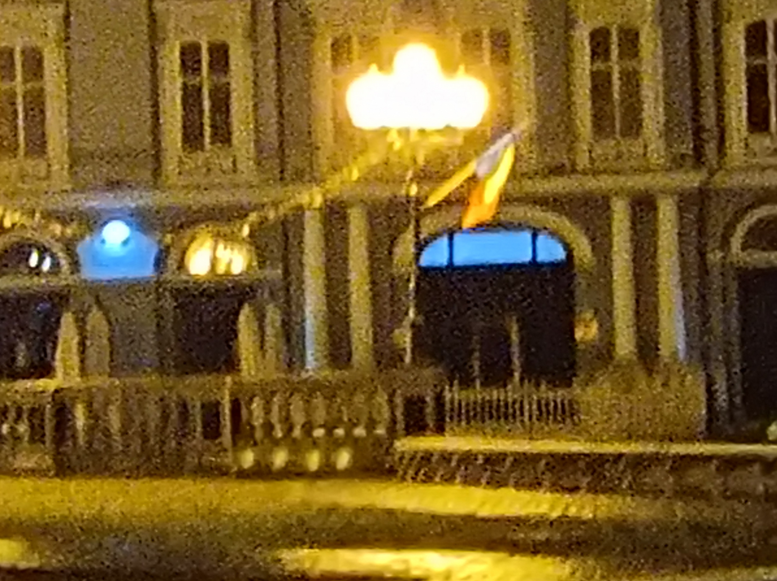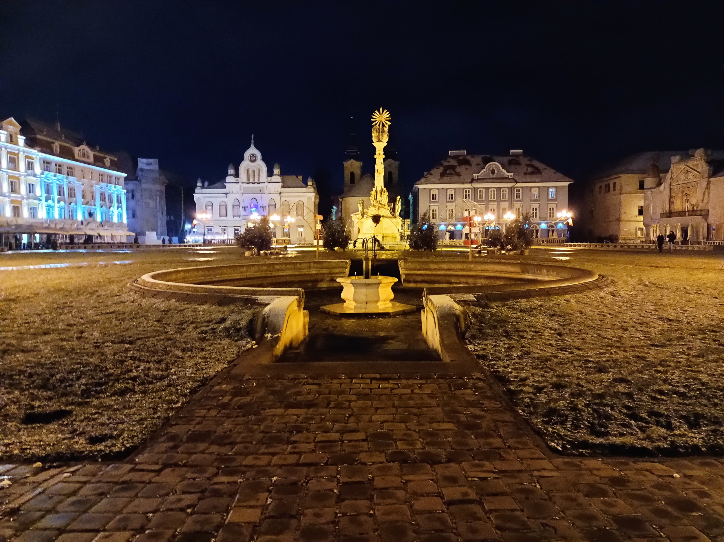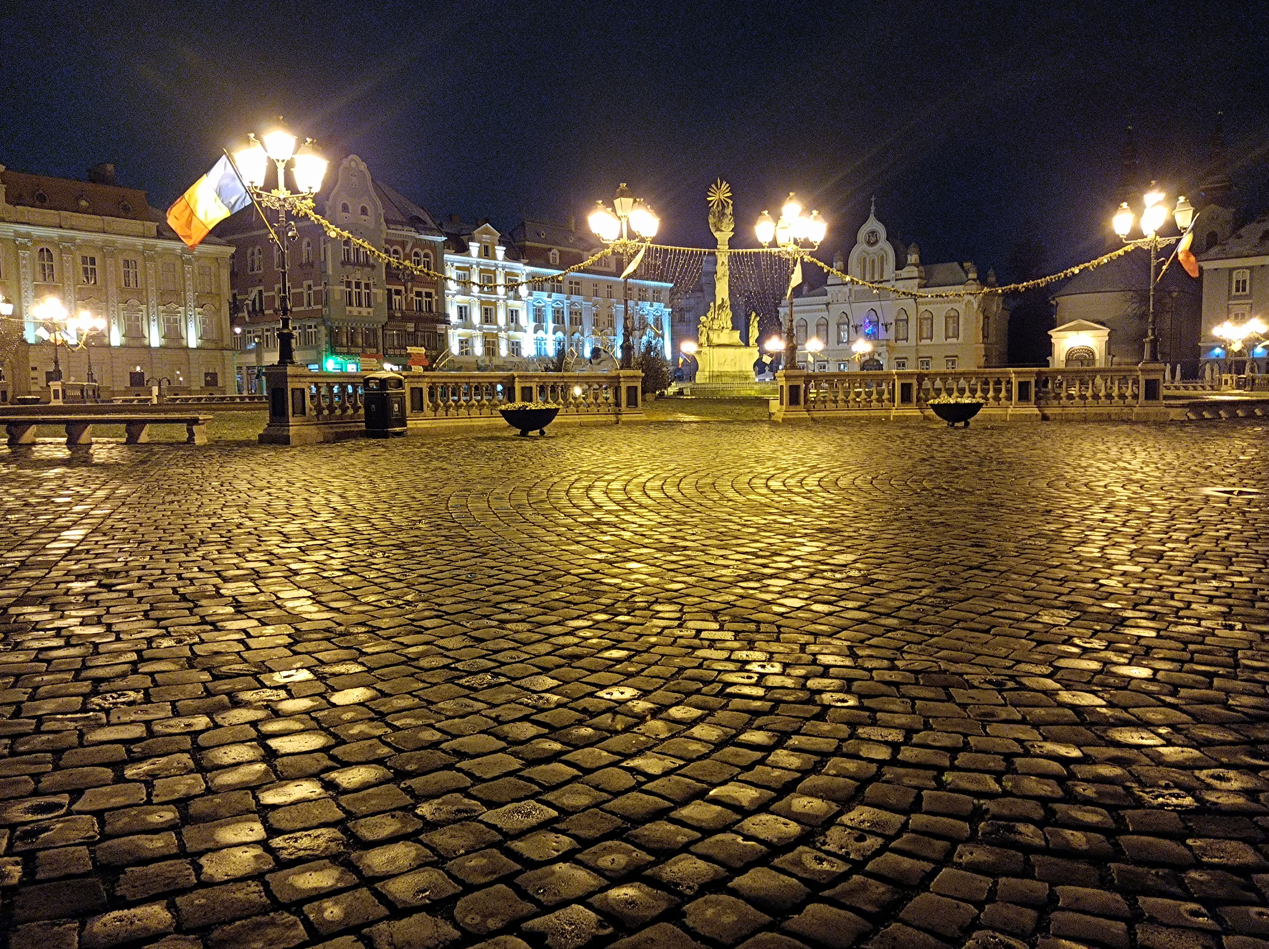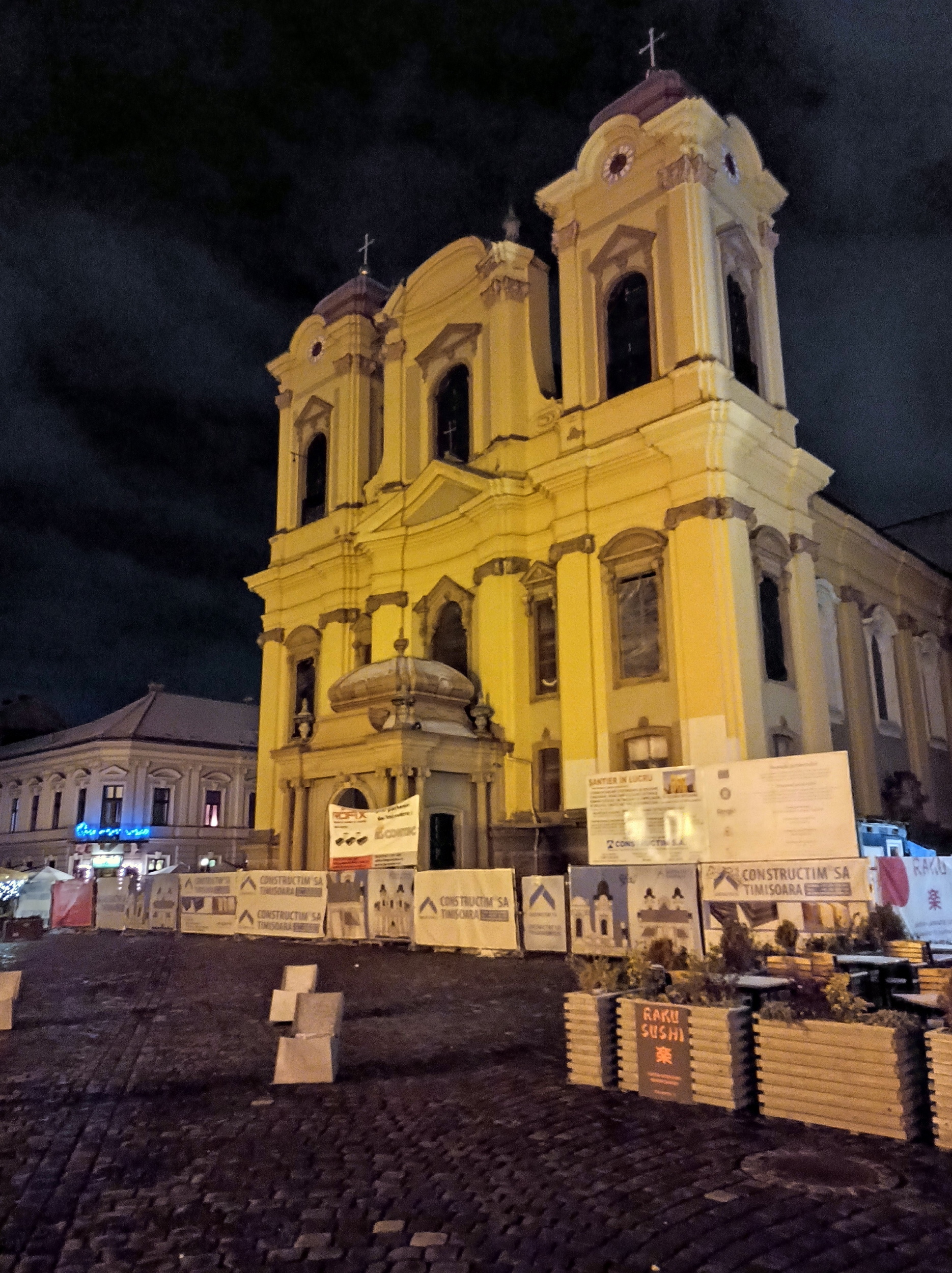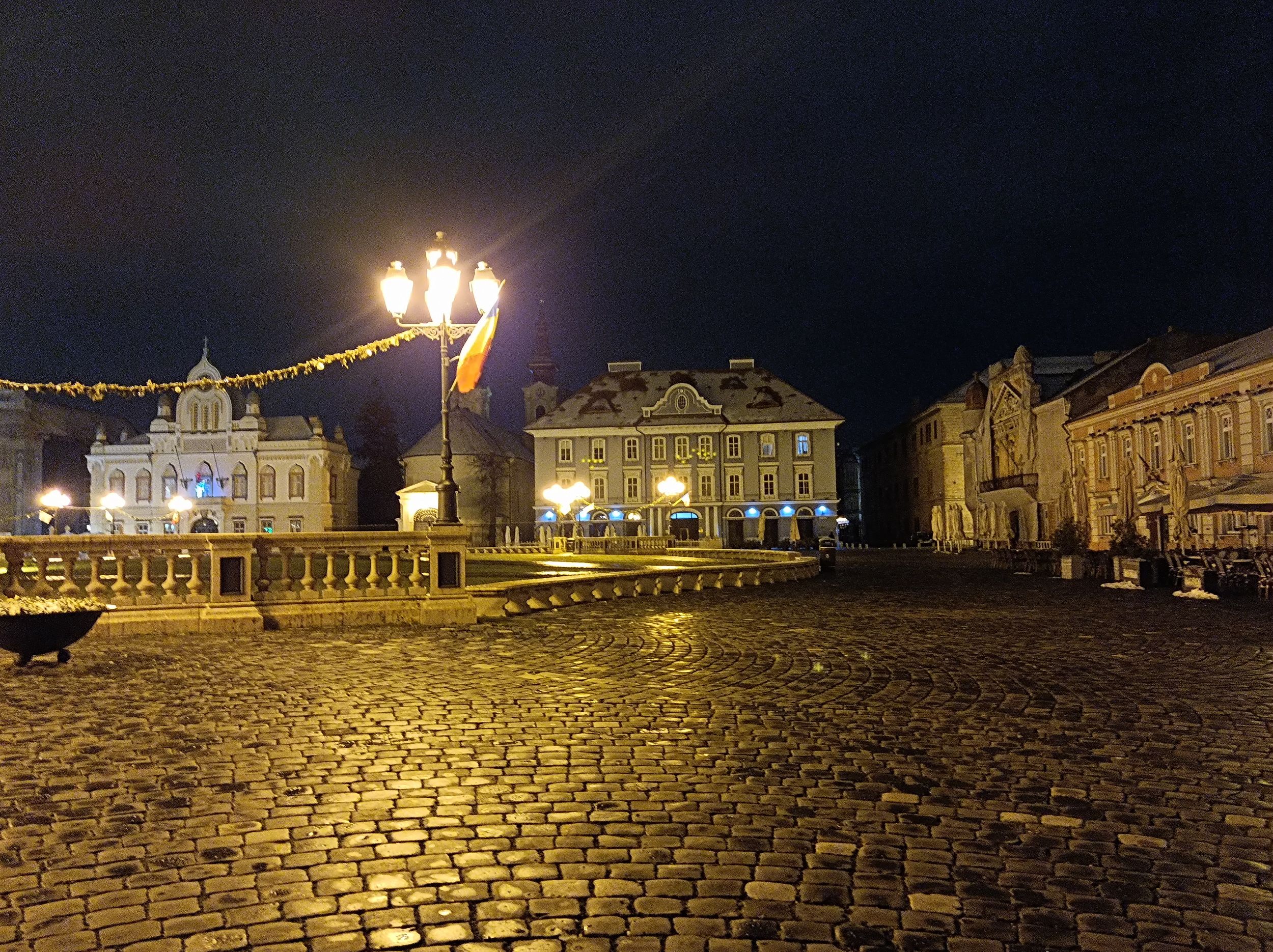 Detaliile arhitecturale ale clădirilor din Timişoara se văd de vreo 2-3 ori mai bine cu acel mod special nocturn de fotografiere. Cerul devine din negru albastru, dar reflexia luminii pe pavajul ud e mai convingătoare fără Night Mode. Nu e rău deloc, e la nivel de telefon Motorola din 2019-2020, pentru că au fost vreo 4 care se descurcau binişor noaptea chiar şi la preţ mic.
