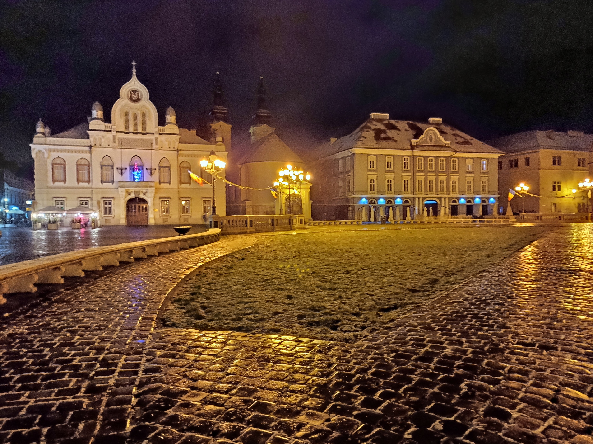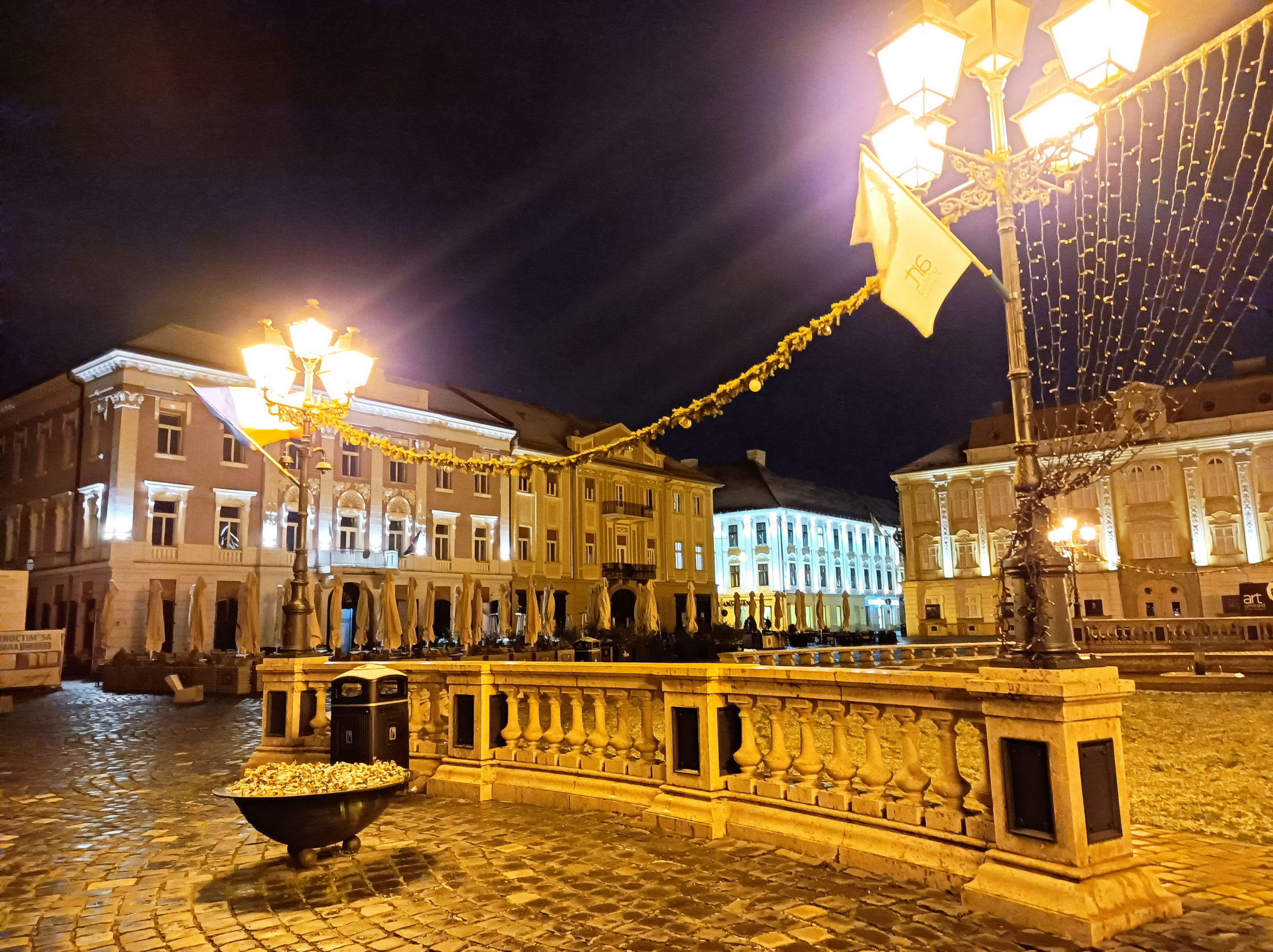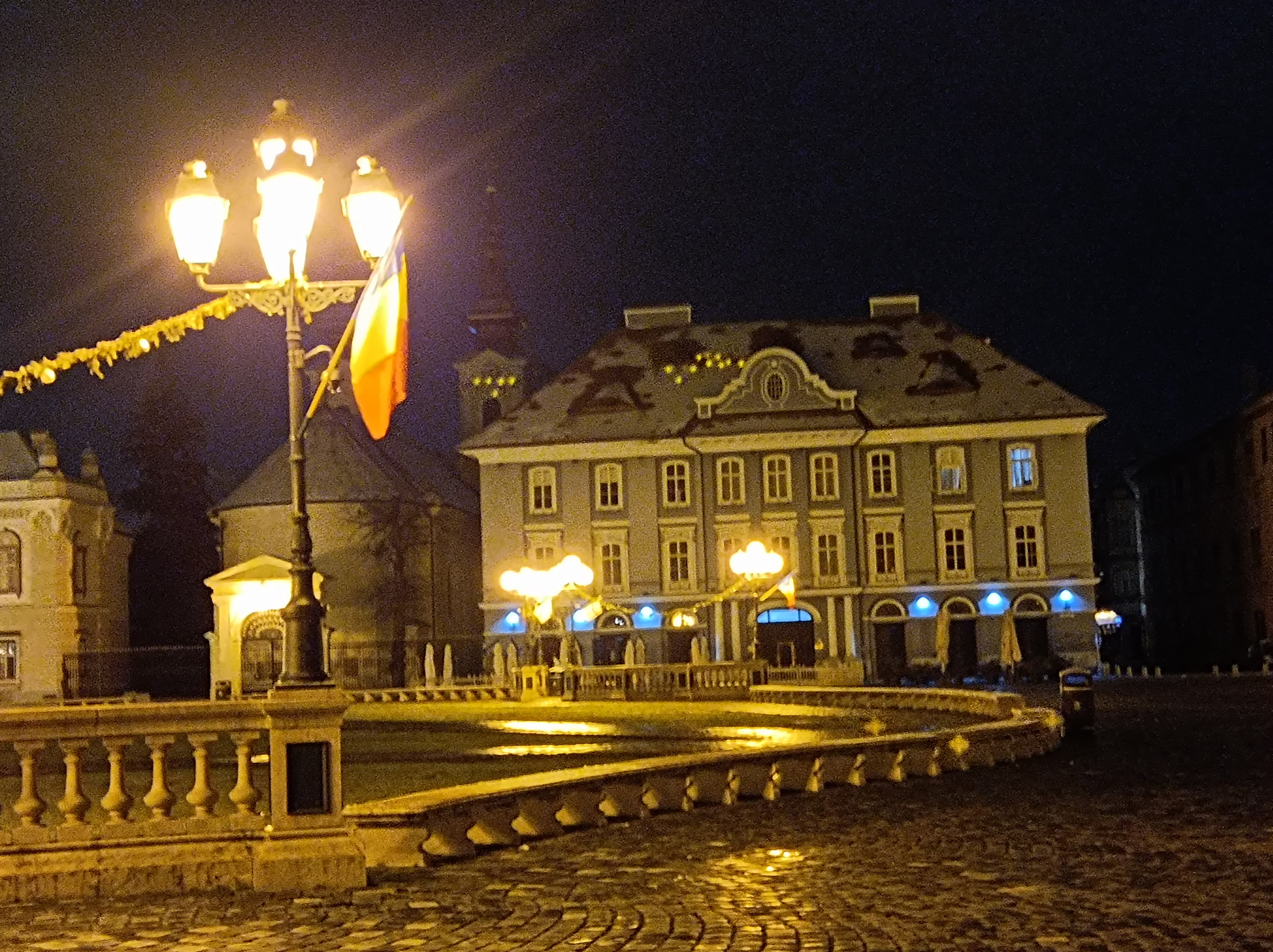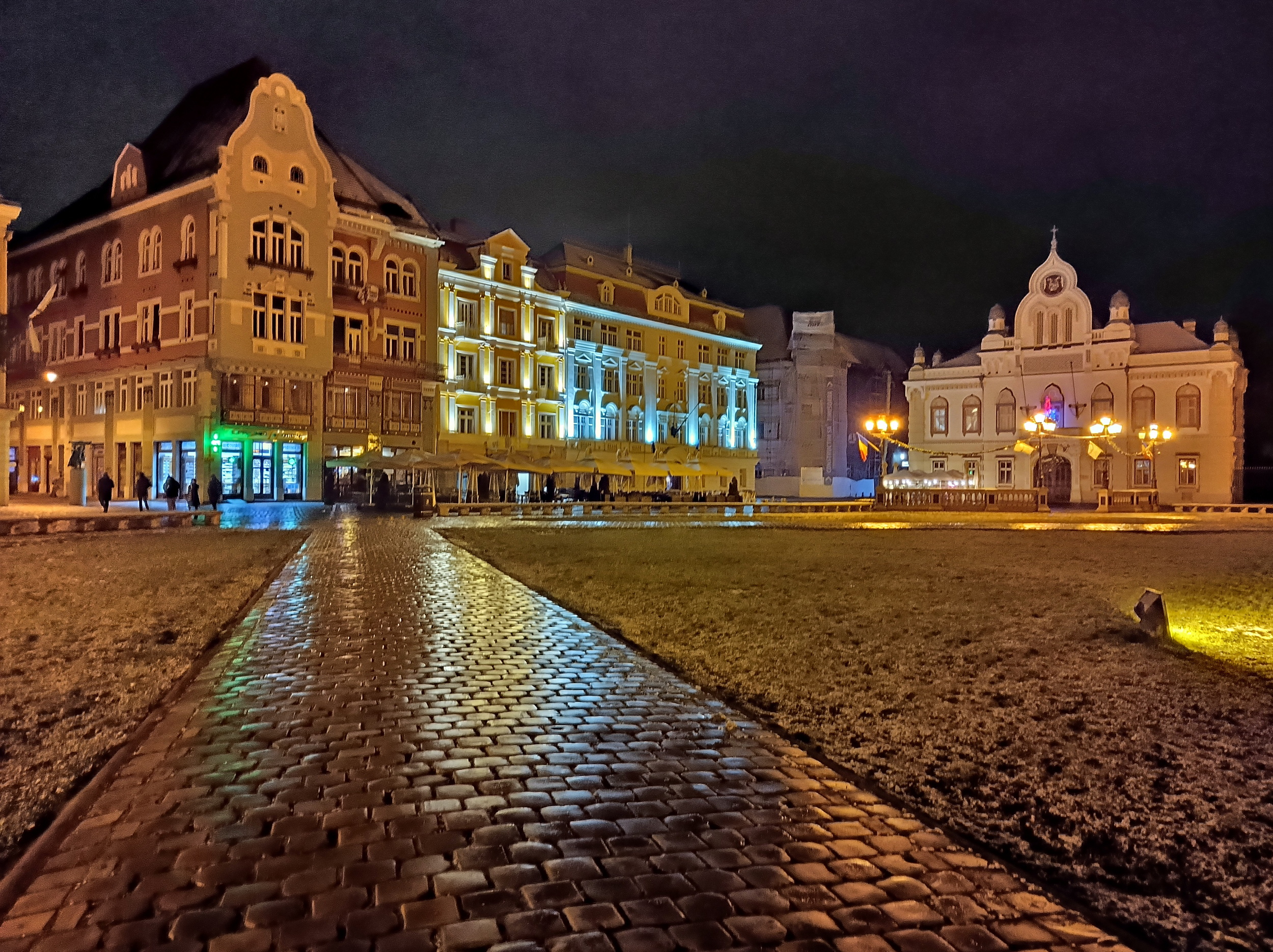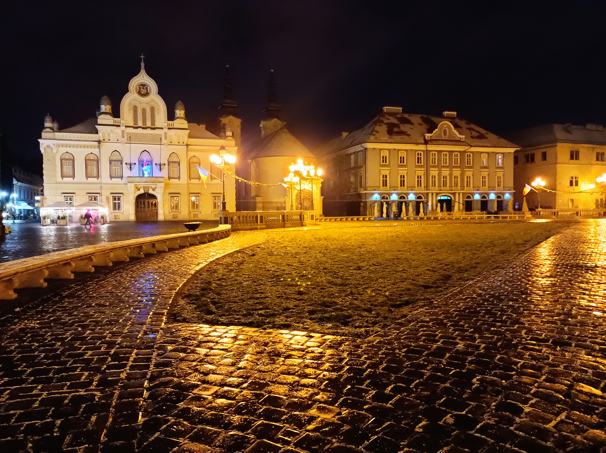 Detaliile arhitecturale ale clădirilor din Timişoara se văd de vreo 2-3 ori mai bine cu acel mod special nocturn de fotografiere. Cerul devine din negru albastru, dar reflexia luminii pe pavajul ud e mai convingătoare fără Night Mode. Nu e rău deloc, e la nivel de telefon Motorola din 2019-2020, pentru că au fost vreo 4 care se descurcau binişor noaptea chiar şi la preţ mic.