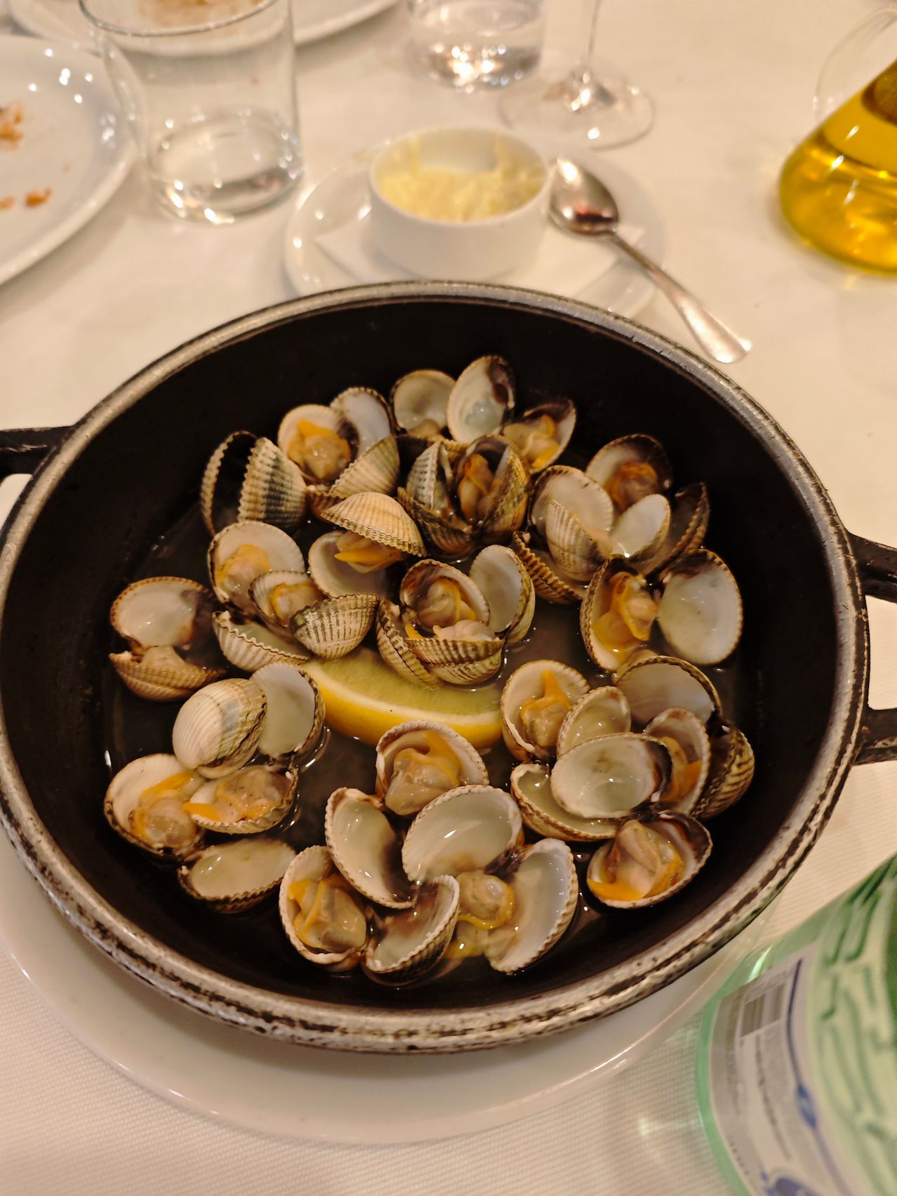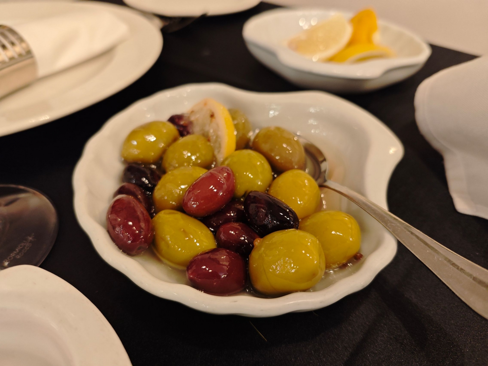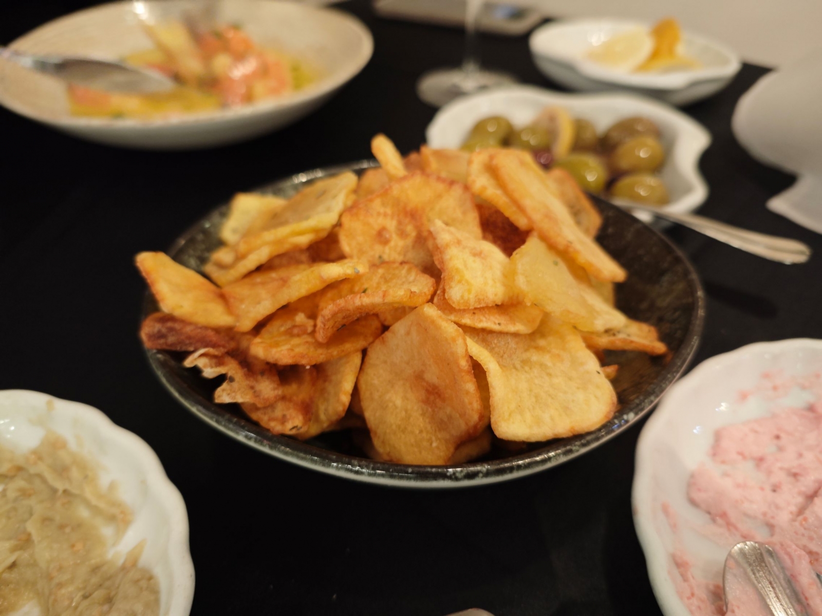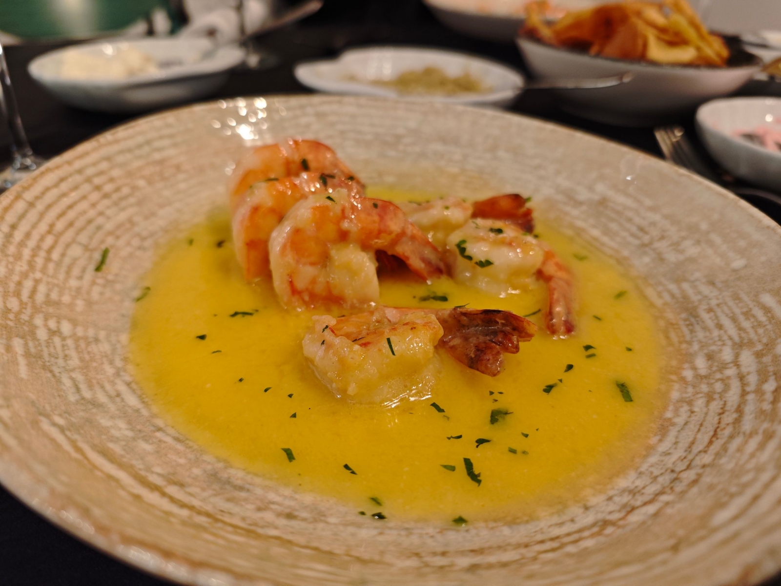 Luciul măslinelor Kalamata și textura aspră a brânzei cu ardei iute au dominat peisajul antreurilor. Iar trebuie spus că Xiaomi 14 face o treabă bună în reliefarea "valurilor"acestor paste de pus pe pâine caldă. Pasta de icre, salata de vinete, pasta de brânză picantă. Și apoi au venit creveții, cu C mare. Cei mai buni din București, de departe. Trași în unt, vin și usturoi. Însoțiți de chipsuri cu un Bokeh elegant în spate.