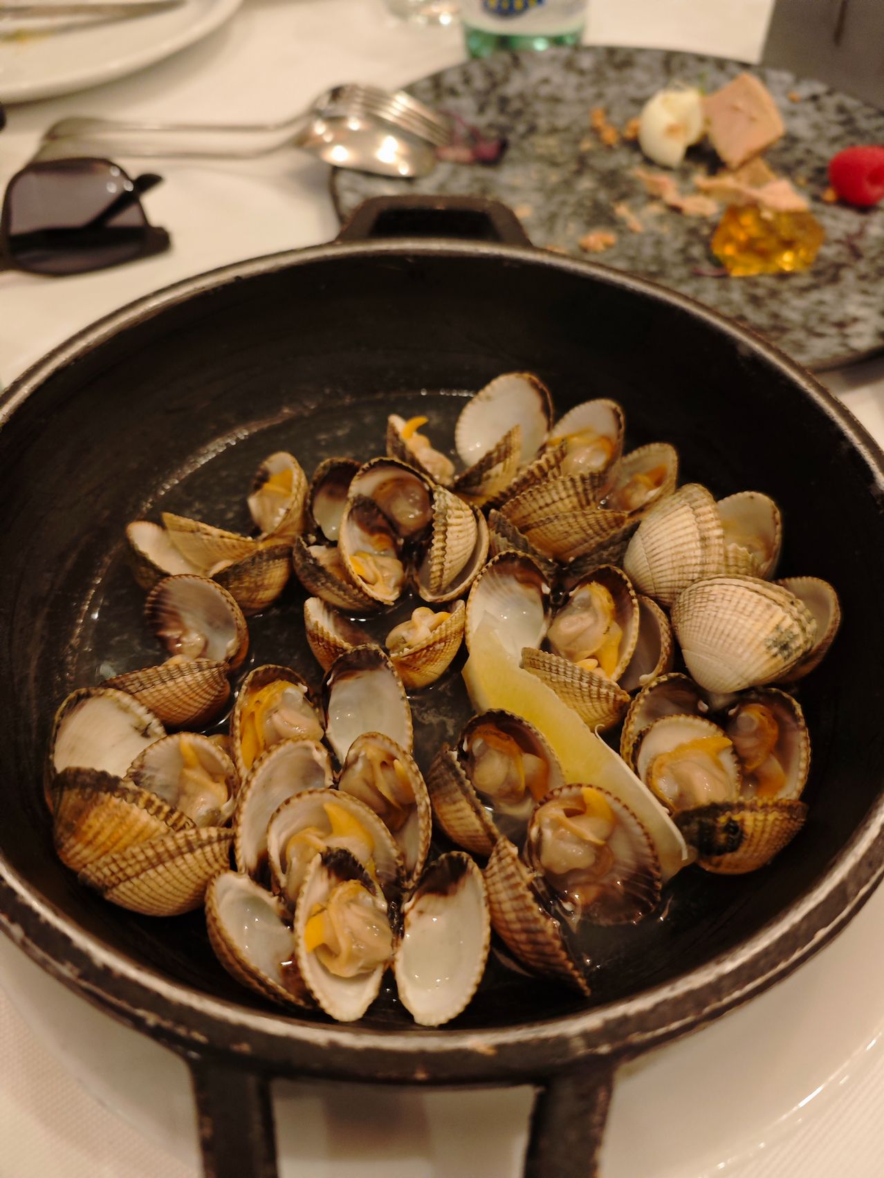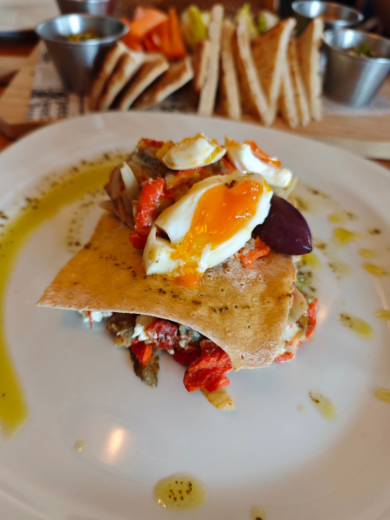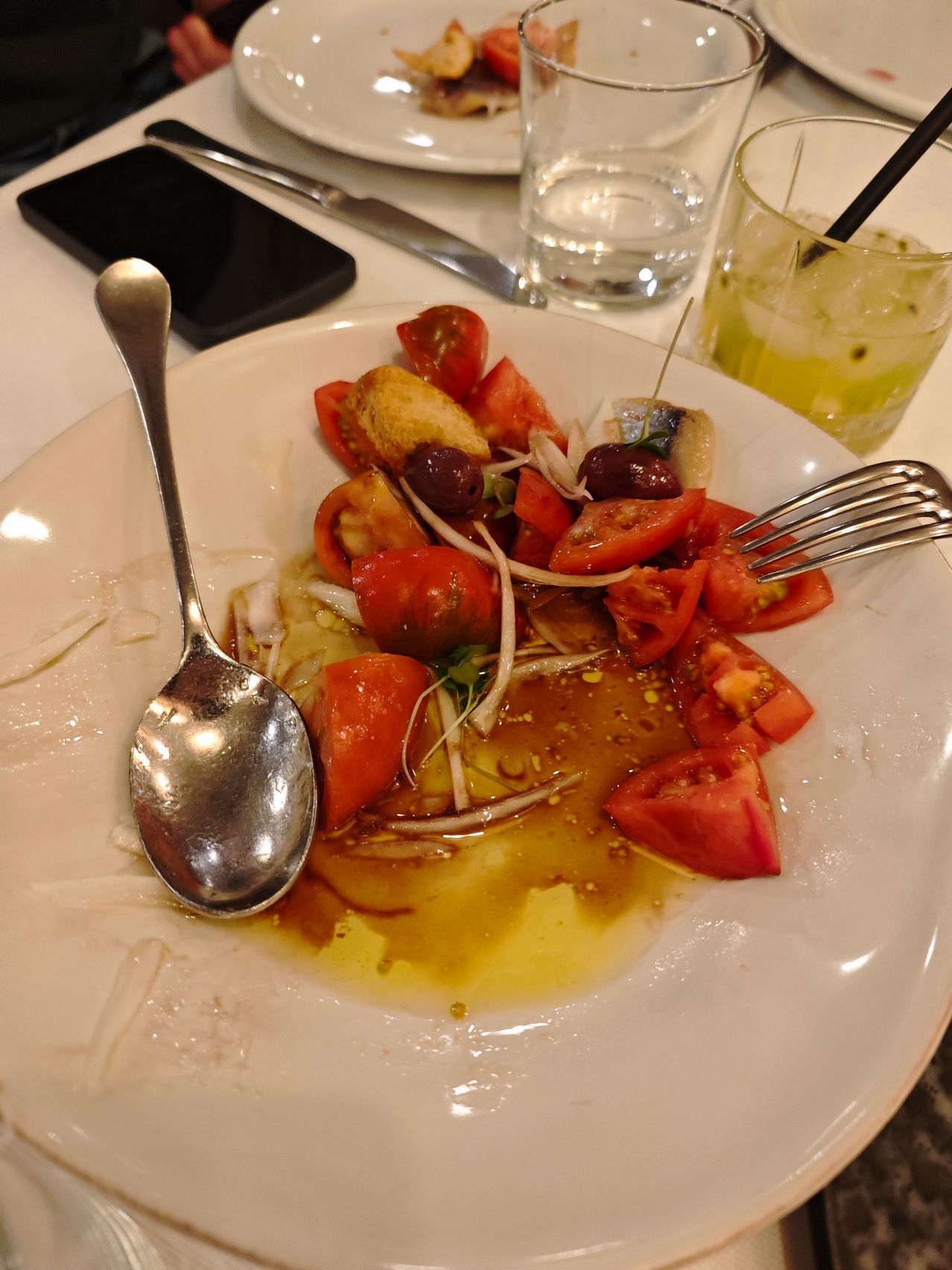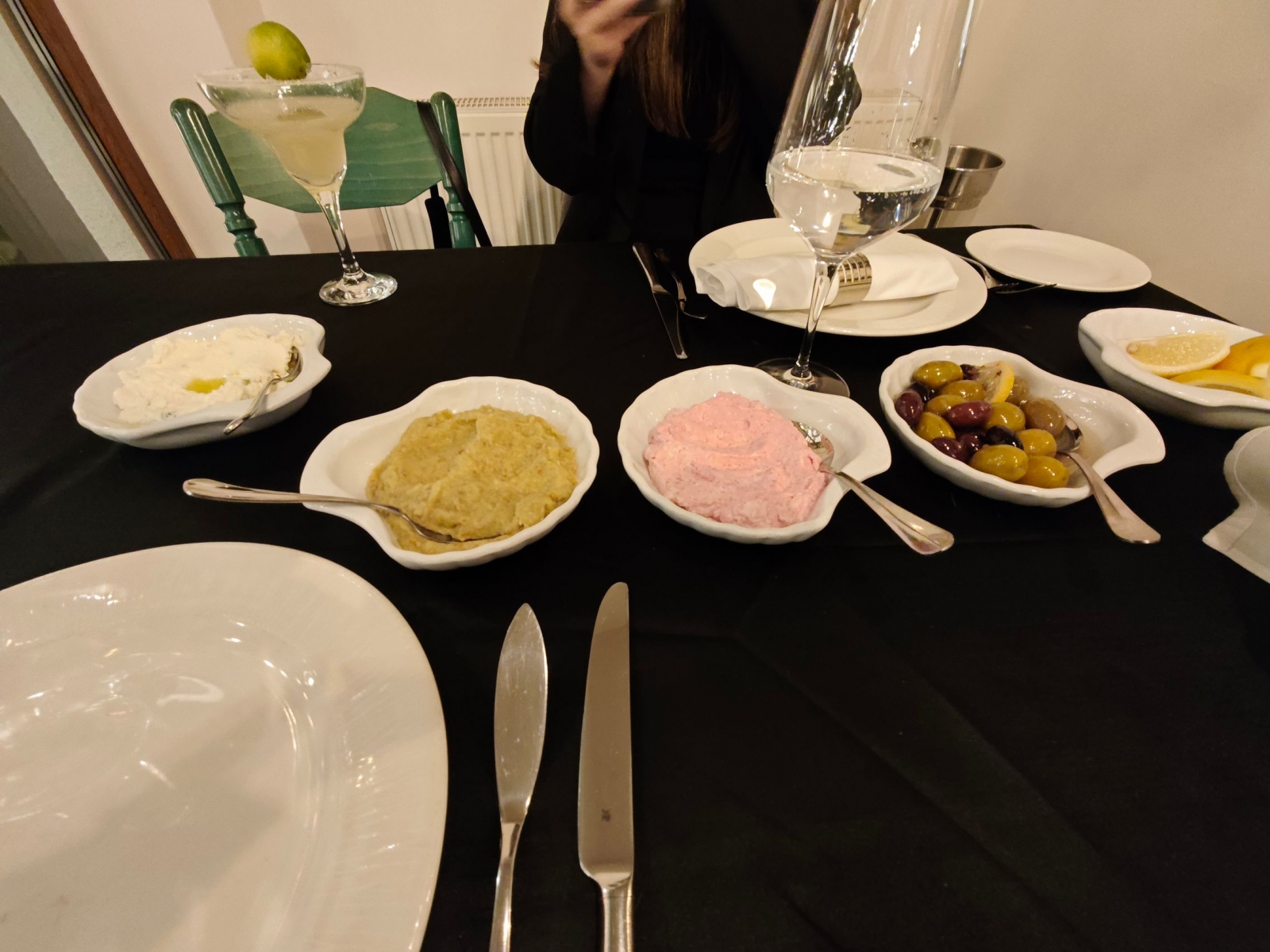 Luciul măslinelor Kalamata și textura aspră a brânzei cu ardei iute au dominat peisajul antreurilor. Iar trebuie spus că Xiaomi 14 face o treabă bună în reliefarea "valurilor"acestor paste de pus pe pâine caldă. Pasta de icre, salata de vinete, pasta de brânză picantă. Și apoi au venit creveții, cu C mare. Cei mai buni din București, de departe. Trași în unt, vin și usturoi. Însoțiți de chipsuri cu un Bokeh elegant în spate.