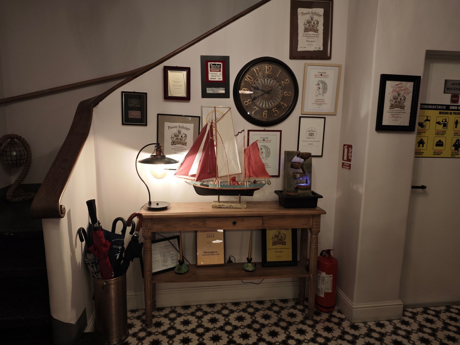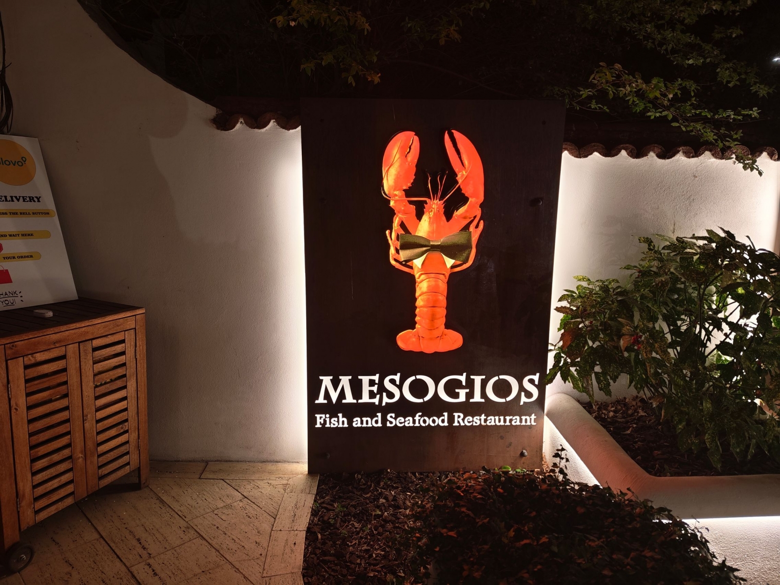 Am ajuns și la Mesogios Primăverii, pentru cel mai titrat restaurant de fructe de mare din București. Mă rog, mâncare grecească la bază și sincer să fiu mai bună și mai autentică decât am mâncat în Grecia recent. Are o tradiție de peste 20 de ani și are fructe de mare și pești aduși proaspăt zilnic. Întâmpinat de un homar ca logo, aprins la intrare și scos la lumină de Night Mode, am pornit înăuntru. Homar cu papion, elegant chiar.