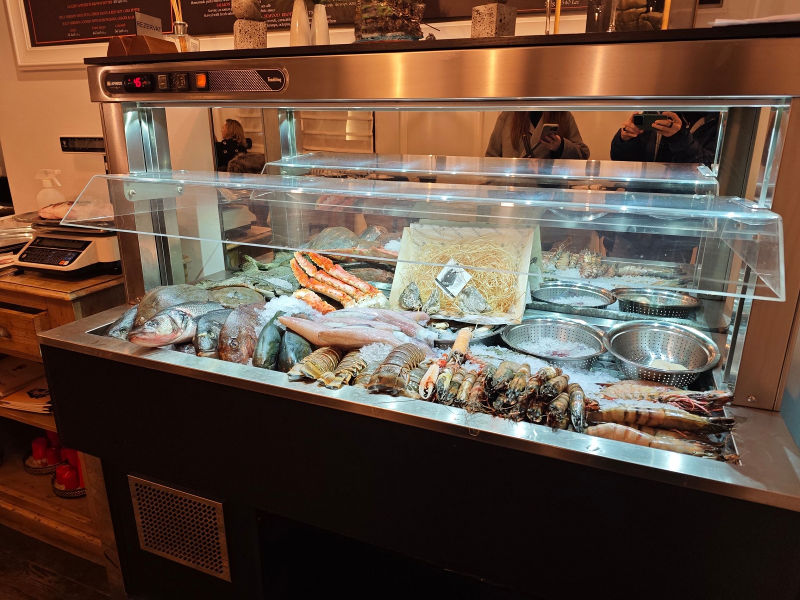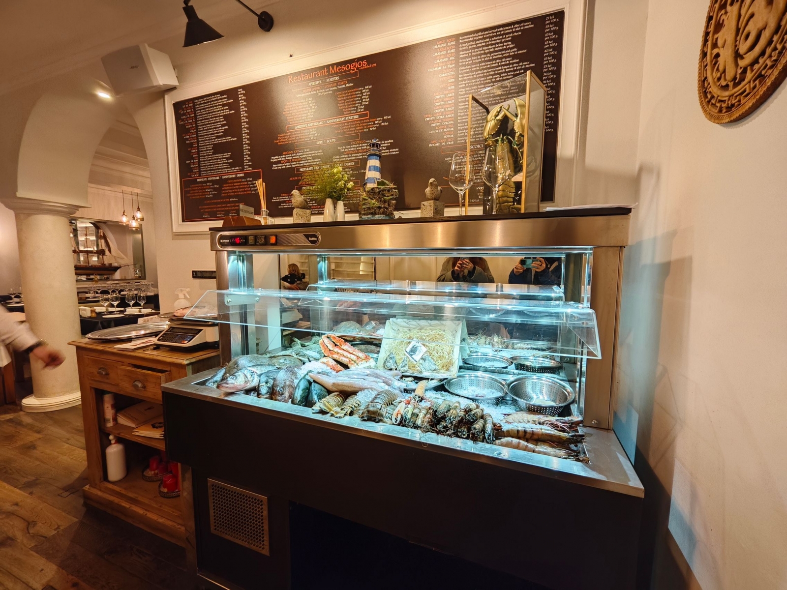 Înăuntru, camera lui Xiaomi 14 s-a lovit de prima situație grea: fundalul iluminat slab, vitrina cu pești sub lumină albă, intensă, rece. Le-a echilibrat excelent. Iar cea ultrawide a păstrat luminozitatea și prin unghiul generos a prins și detaliile de sus: prețuri, bibelouri grecești, pahare. Am văzut și un soi de "making of", cu un pește proaspăt pe cântar.