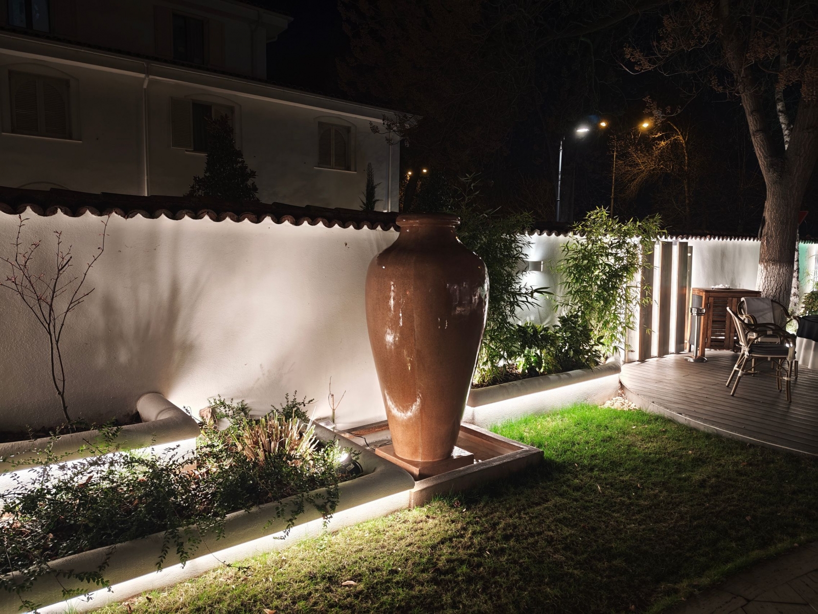 Verdele natural al vegetației, textura plăcută a fântânii-vas de la intrare.