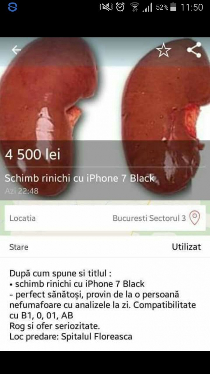 Anunţul se dorea a fi serios, cu localizare în sector 3, Bucureşti, schimb la spitalul Floreasca şi promisiunea de "rinichi perfect sănătoşi, de la persoana nefumătoare". Evident, anunţul a fost scos de pe OLX urgent, deşi în ţări din Asia schimbul de organe contra iPhone-uri se cam practică, oricât de morbid ar părea. Şi dacă e să luăm în serios anunţul, ceva e cu siguranţă în neregulă la rinichii ăia.