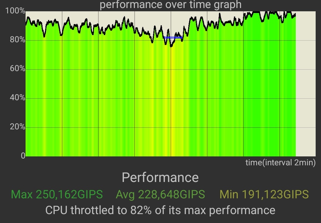 Ne uităm și la CPU Throttling Test unde după 15 minute de rulare am pierdut doar 18% din performanță și stăm chiar bine la acest capitol. Ca temperatură, după rularea acestui benchmark am ajuns pe la 38.9 grade Celsius și nu e cazul de îngrijorare, aș zice că sub 40 de grade Celsius este perfect.