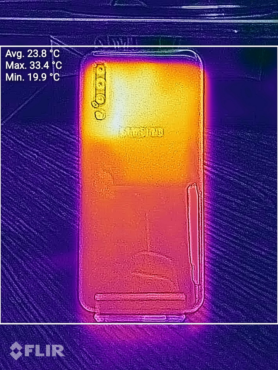 Ideea e următoarea: depăşim telefoanele cu Kirin 710 peste tot, Snapdragon 630 şi 660, dar nu ajungem la cota celor cu Snapdragon 710. La testul de temperatură stăm bine, cu 34.2 grade Celsius în GFXbench şi 33.8 grade în Riptide GP Renegade, iar harta termică realizată cu senzorul FLIR de pe CAT S61 arata şi ea bine, cu o singură zonă mai caldă lângă camera, dar nu excesiv.
