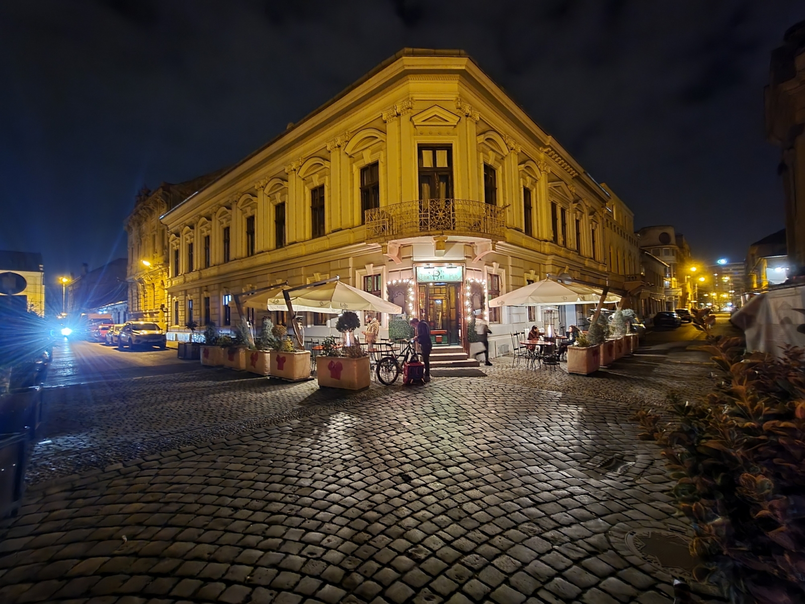 Poţi distinge toate detaliile arhitecturale ale clădirilor fotografie chiar şi pe mod Default, în condiţiile în care la The Rat Pub în Timişoara abia vedeai intrare la multe telefoane. În acelaşi cadru am descoperit că fotografiile ultrawide arată bine doar în porţiunea centrală noaptea, iar pe lateral totul se deformează, mai ales sursele de lumină. Luna arată poetic printre nori şi mă gândesc că acum câţiva ani nu puteam visa să capturăm aşa ceva atât de bine.