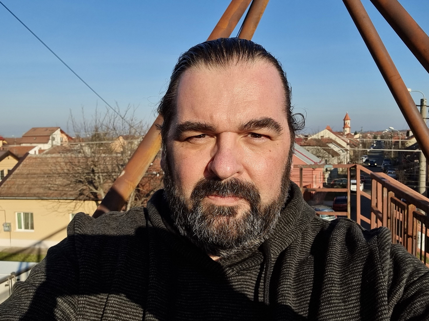 La selfie se văd toţi porii, ridurile, cutele, nuanţele diferite ale pielii în funcţie de cum te-a bătut soarele în ultima vreme. Firele de păr se văd foarte clar separate în claia de păr şi barbă, asta pot spune. Fata este expresiva, albul ochilor este lucios şi pielea de pe frunte luceşte în bătaia soarelui. Focalizarea pe chip e perfectă şi fundalul e destul de clar şi nu se induce un contrast intens.