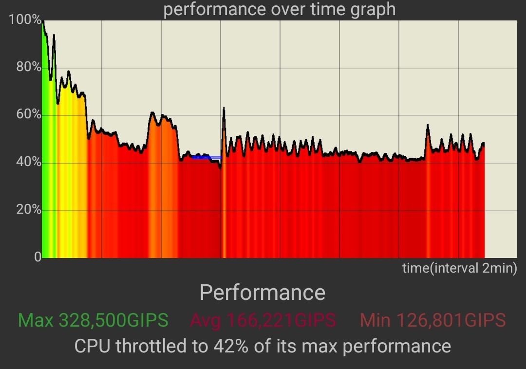 Aruncăm o privire peste testele de performanţă şi vedem deja clasicele probleme cu throttling-ul. Astfel, la testul CPU Throttling Test telefonul pierde 58% din performanță după 15 minute de testare. E mult, e în coada clasamentului, dar se poate mai rău: Pura 80 Pro şi Ultra, care pierd 71%.