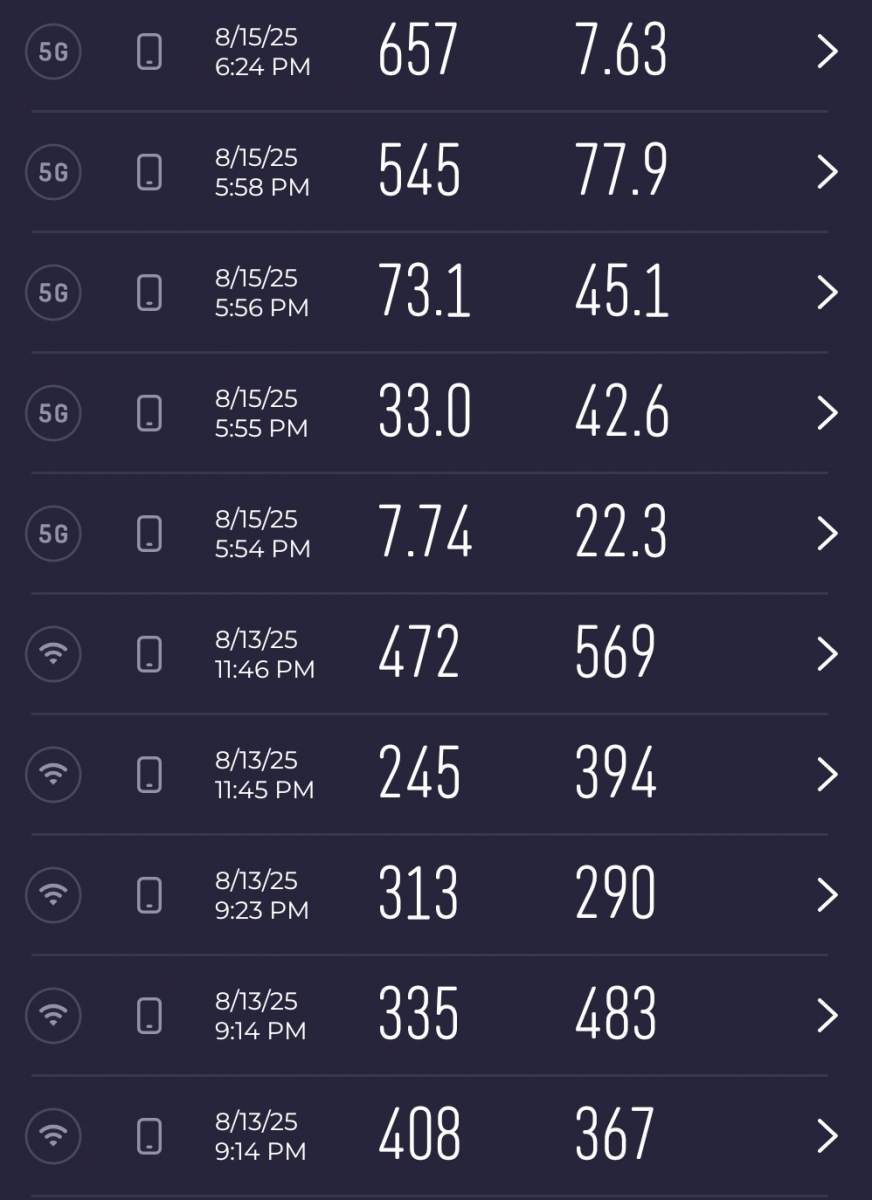 La 5G s-a pornit greu "morișca", în fața TNB Bucureşti, dar am ajuns până la 657 Mbps la download şi 77.9 Mbps la upload în reţeaua Orange. Păcat că nu avem şi infraroşu