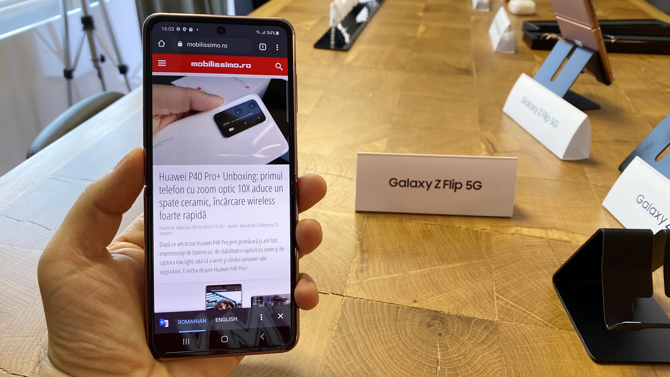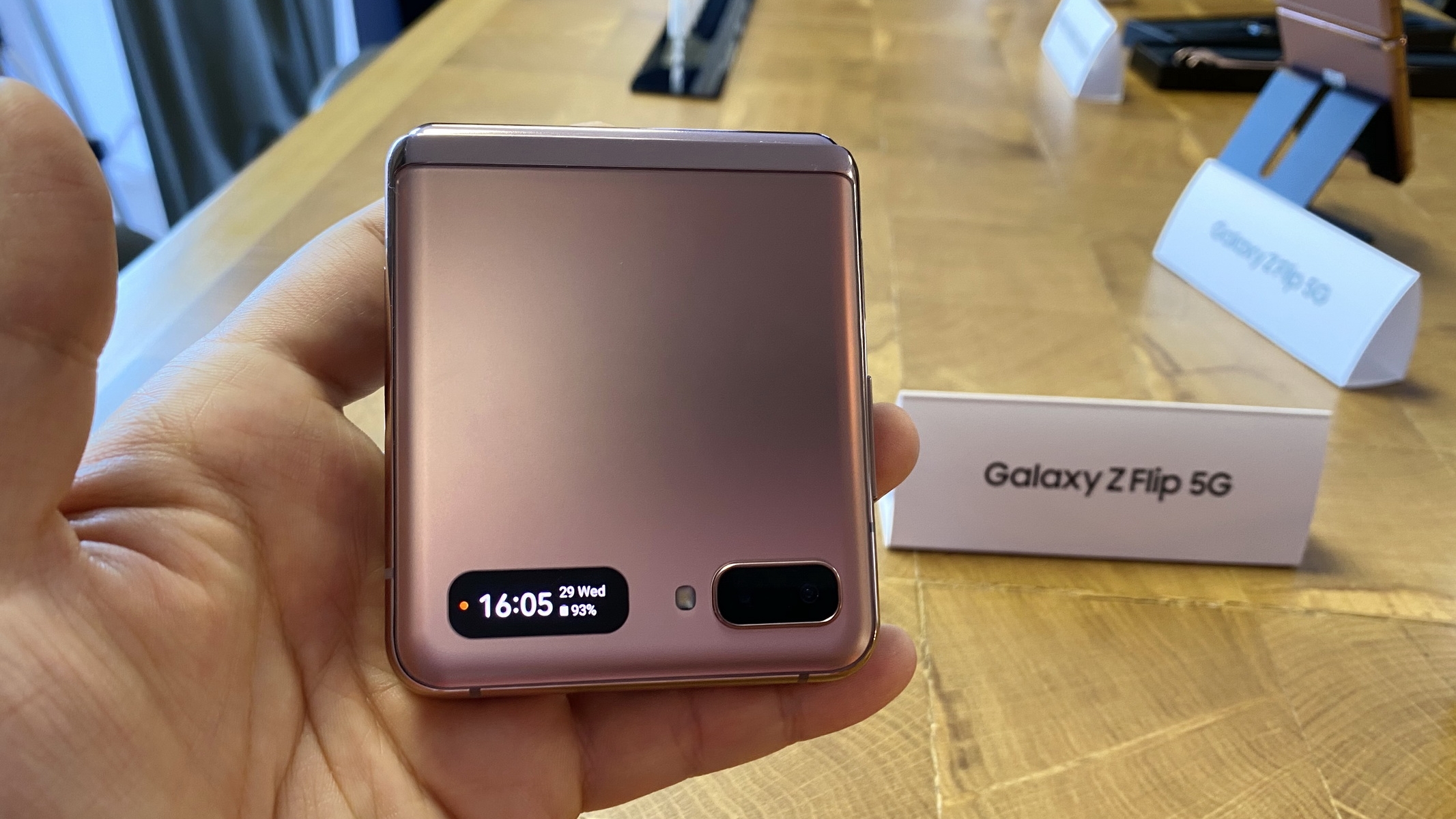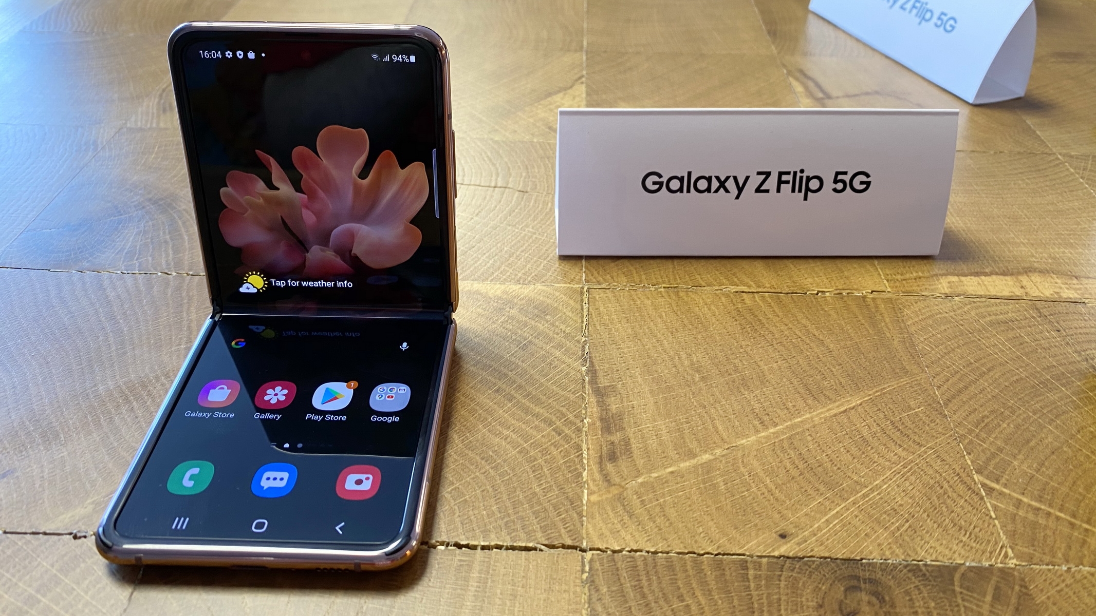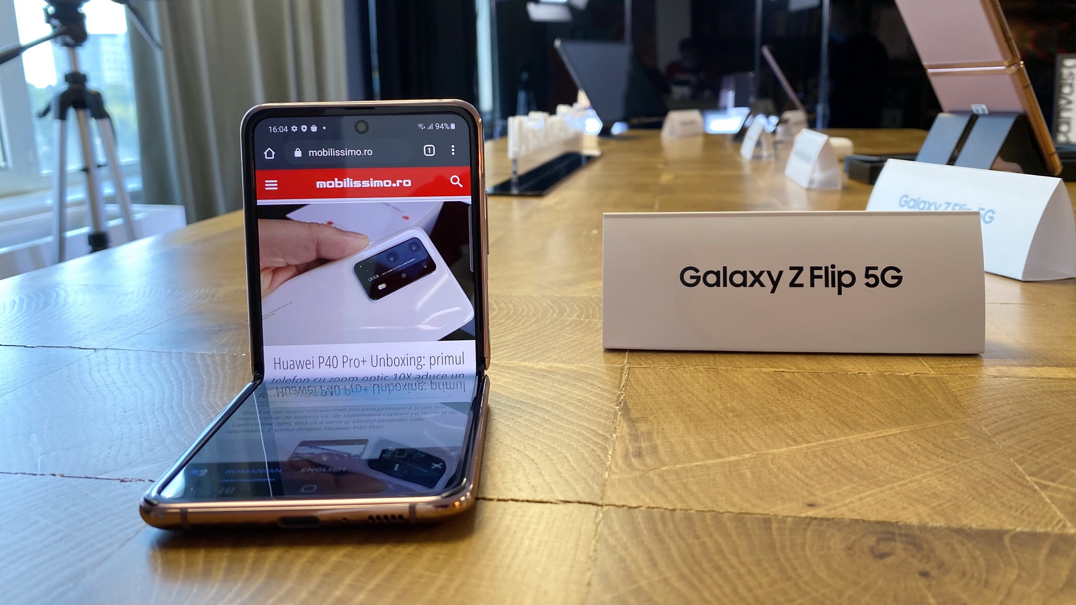 În mare ştiţi deja reţeta pentru acest produs: faţă de predecesorul Z Flip el vine cu 3 lucruri noi: procesor Snapdragon 865+ în loc de 855+, noua nuanță Mystic Bronze şi 5G. În rest păstrează acelaşi ecran pliabil pe mijloc, cu diagonală de 6.7 inch şi panou Dynamic AMOLED, dar şi 8 GB RAM şi 256 GB stocare UFS 3.1. Avem şi un ecran extern de 1.1 inch AMOLED, pe care vedem notificări, o parte din cătarea camerei şi alte detalii utile, cu clapeta închisă.