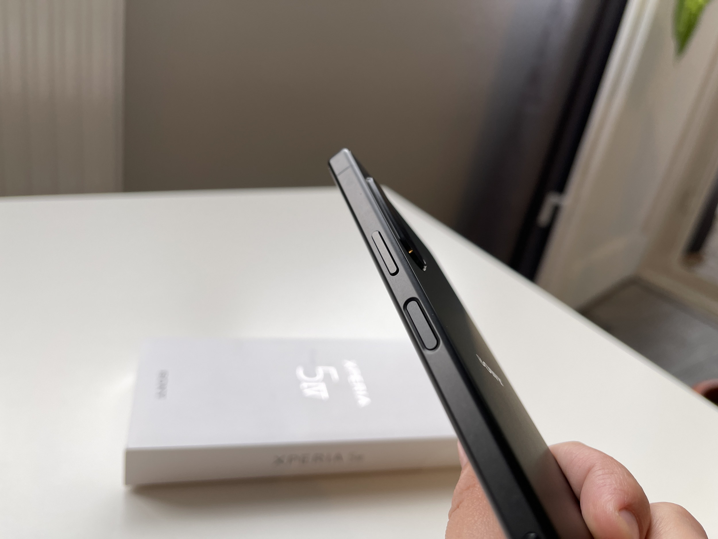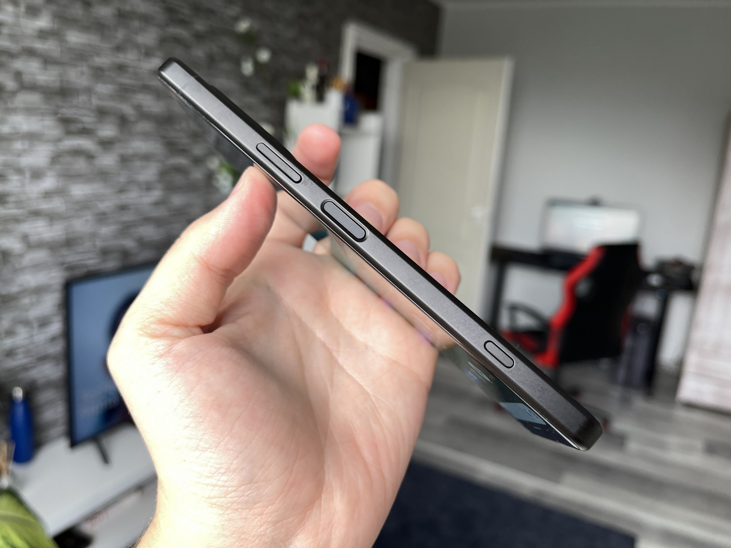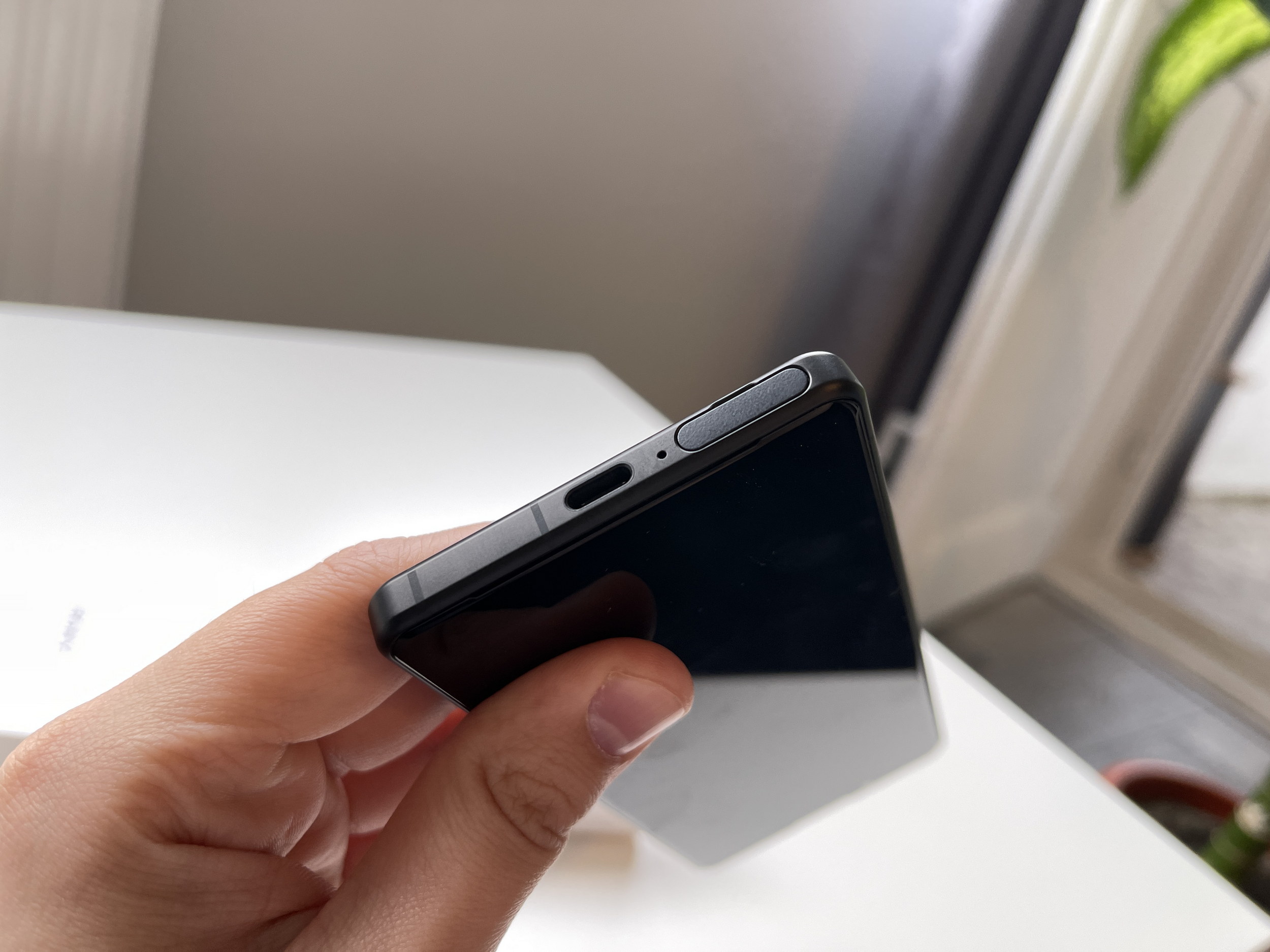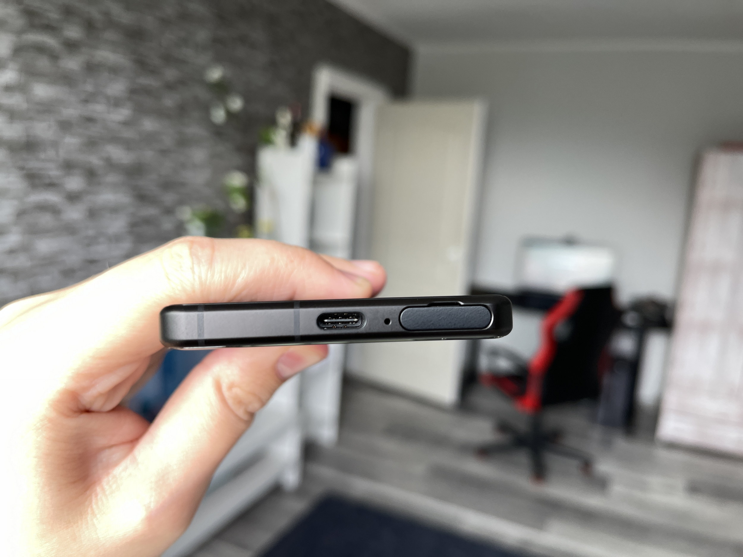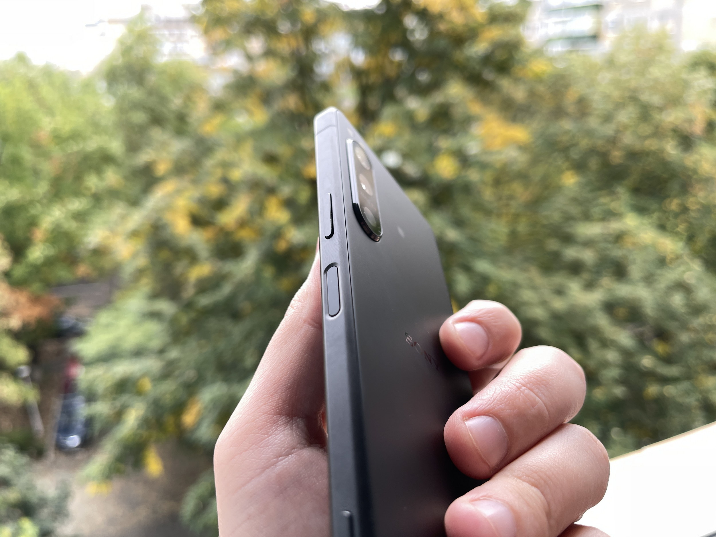 Sony a luat şi decizia curajoasă de a nu decupa un orificiu în ecran pentru a integra o cameră selfie. A preferat să o pună pe muchia de sus. Ca atare ne-am trezit cu o muchie groasă sus şi cu una groasă jos. Măcar ne gândim că acolo stau speakerele orientate frontal, spre tine. Aş menţiona şi că telefonul e cu 1 mm mai scurt şi mai îngust decât Xperia 5 III, dacă asta contează.