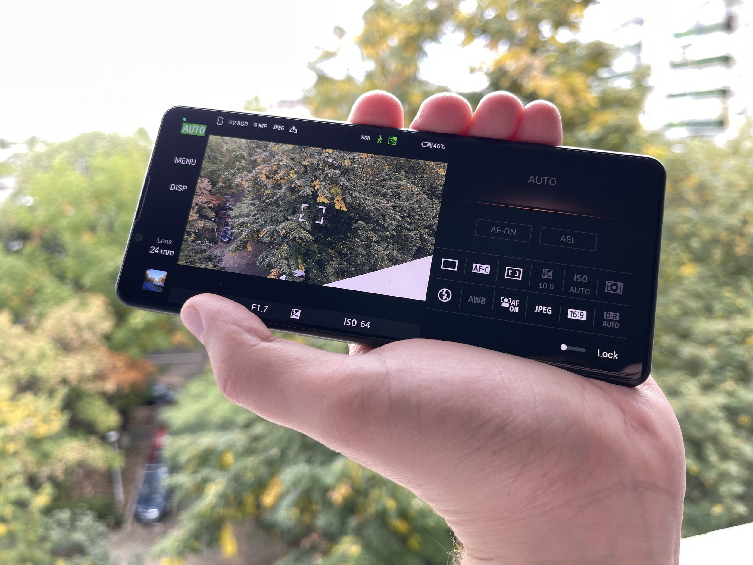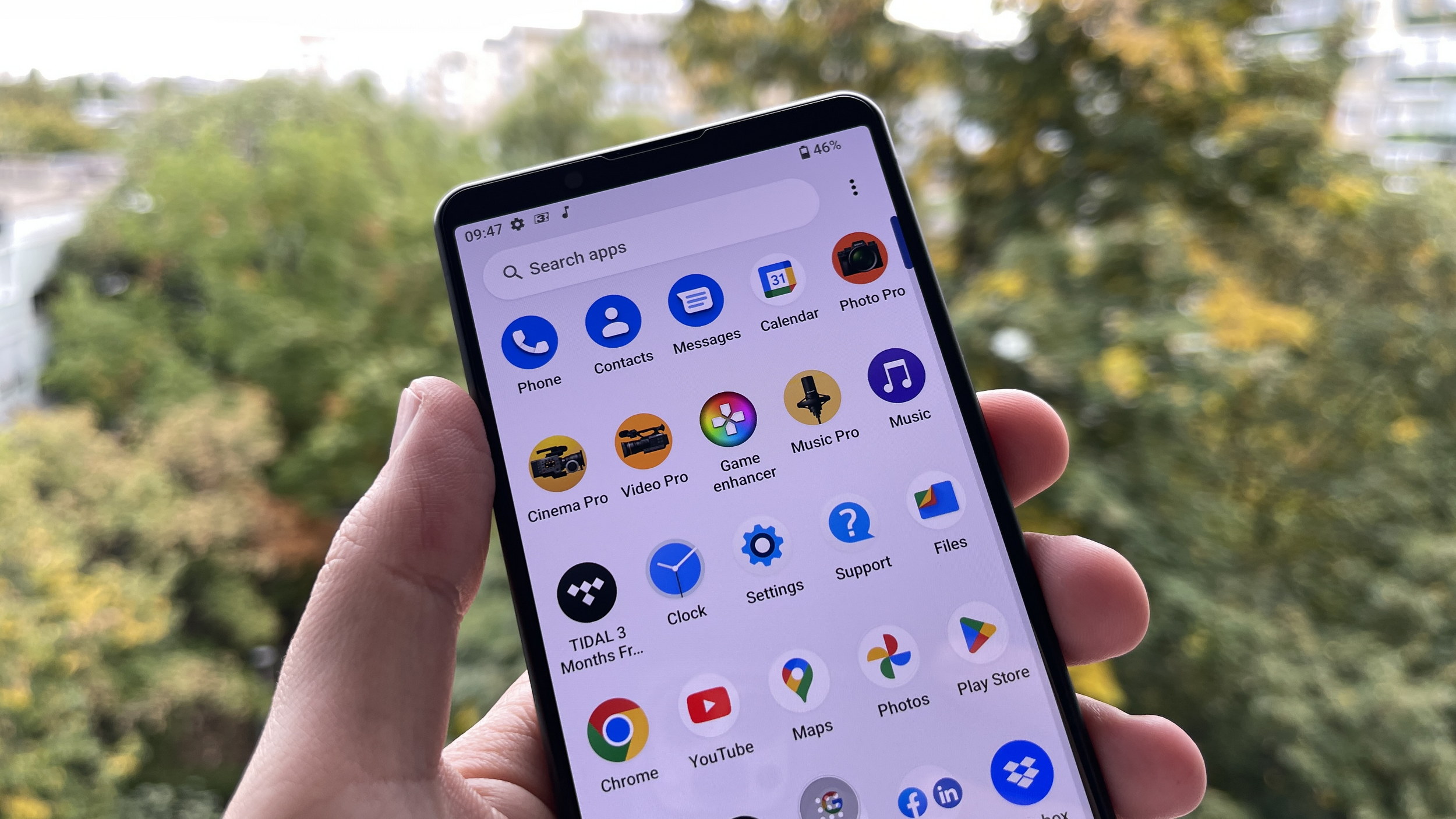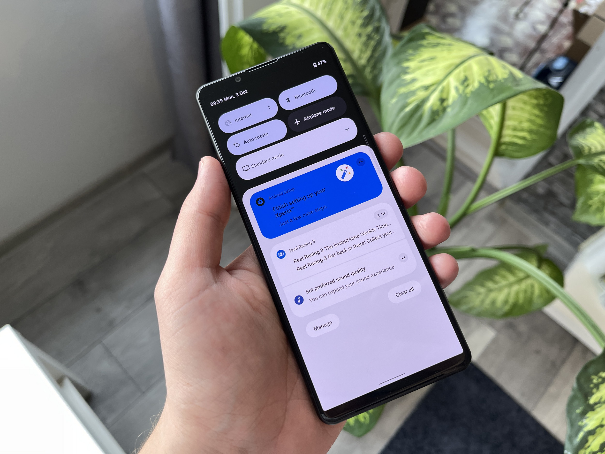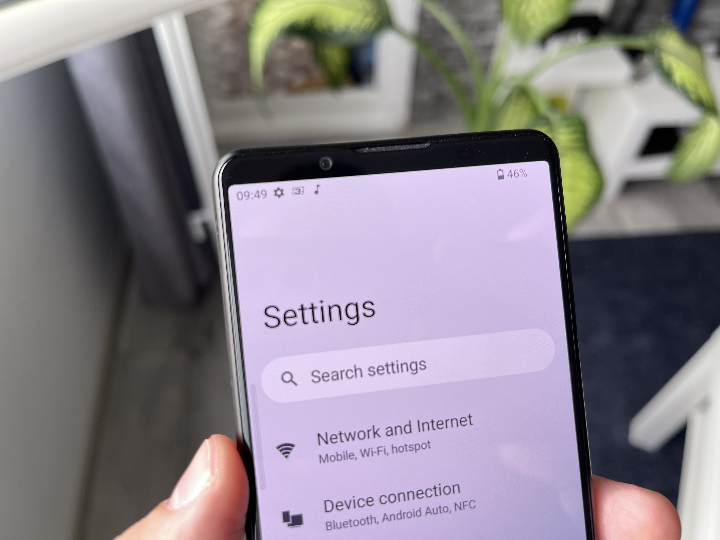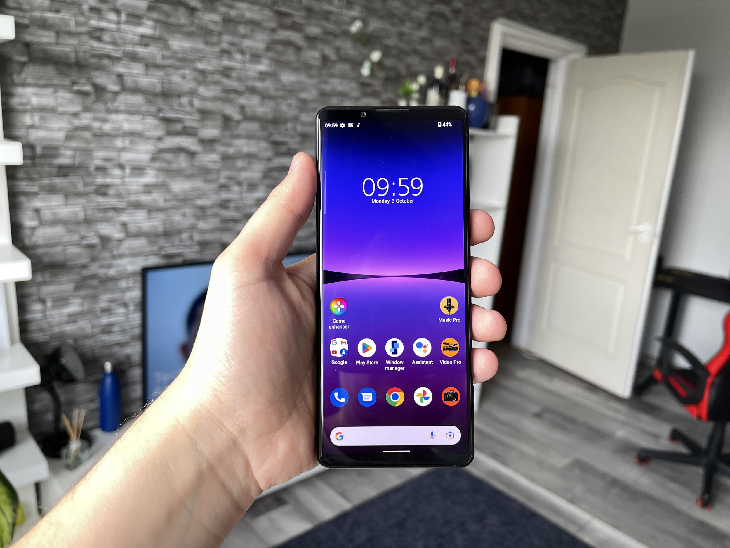 Sony a luat şi decizia curajoasă de a nu decupa un orificiu în ecran pentru a integra o cameră selfie. A preferat să o pună pe muchia de sus. Ca atare ne-am trezit cu o muchie groasă sus şi cu una groasă jos. Măcar ne gândim că acolo stau speakerele orientate frontal, spre tine. Aş menţiona şi că telefonul e cu 1 mm mai scurt şi mai îngust decât Xperia 5 III, dacă asta contează.