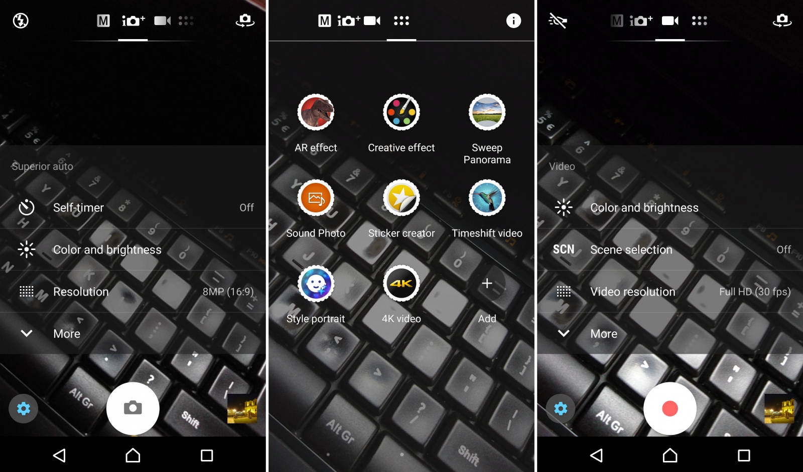 Interfaţa nu s-a schimbat foarte mult de la Xperia Z5 anul trecut şi în continuare include numeroase opţiuni. Modul de bază e Superior Auto, capabil să identifice scenariul în funcţie de situaţie şi oferind rezoluţii de 23 MP în 4:3, 20 MP în 16: 9 sau 8 MP în 4:3. Putem regla şi culoarea şi luminozitatea şi activă object tracking. Modul Manual aduce extra funcţii, precum scene, balans de alb, expunere, shutter şi focalizare, plus ISO şi metering. Evident avem şi HDR aici, iar captura video merge până la 4K, dar avem şi opţiunea slow motion sau Full HD la 30 şi 60 FPS.