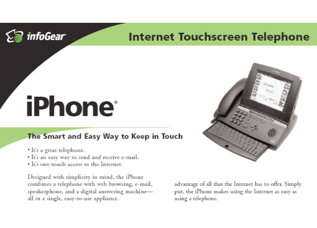 Denumirea de "iPhone" nu a apărut odată cu primul telefon Apple, aşa cum aţi putea crede şi dacă Apple a avut probleme cu trademark-ul pentru "iFone" în Mexic, ei bine nici numele oficial nu a debutat fără dispute. Aflăm că primul device numit iPhone a apărut în 1998 şi era un telefon fix cu Internet şi touchscreen.