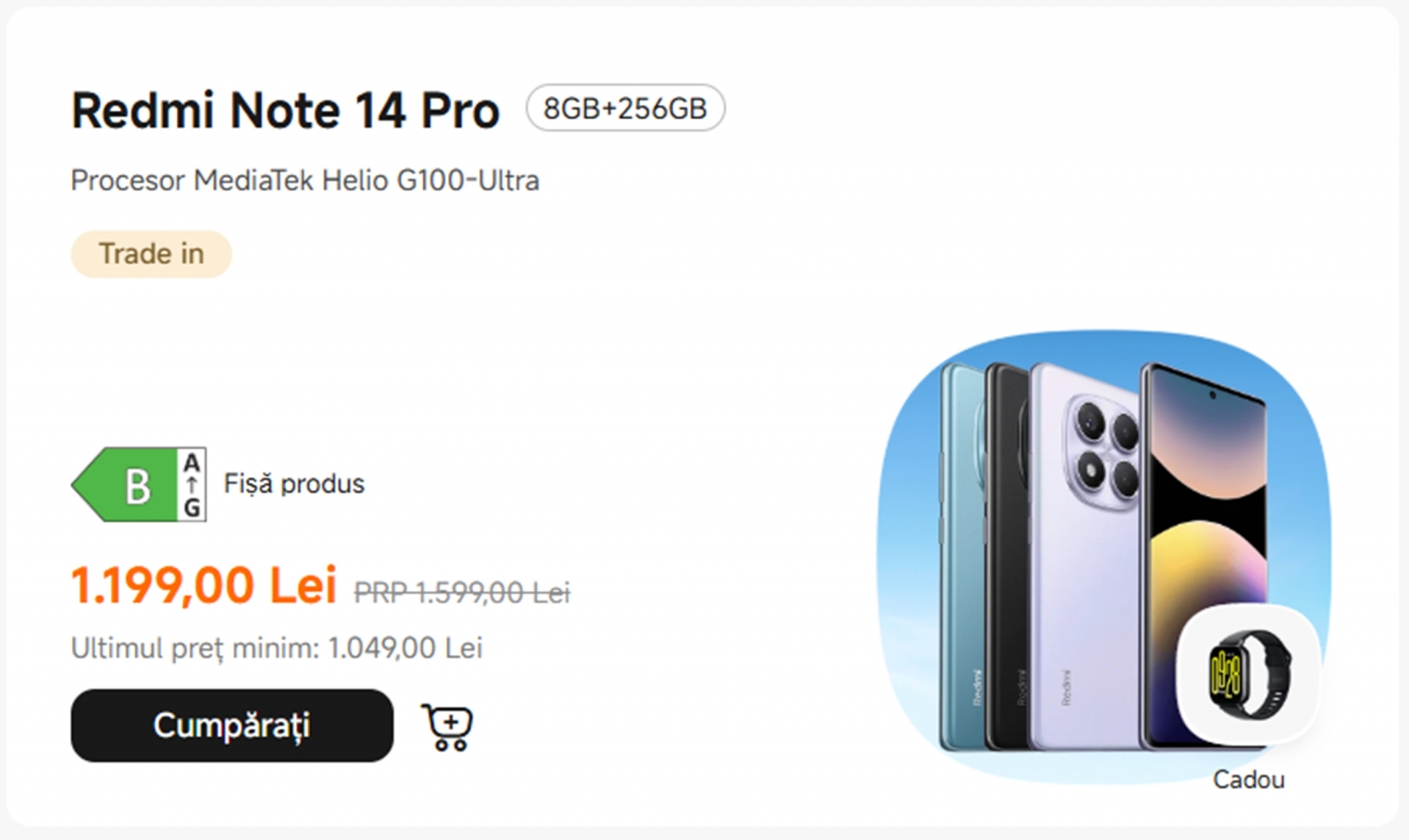 - Redmi Note 14 Pro 5G+ – de la 2399 lei la 1599 lei