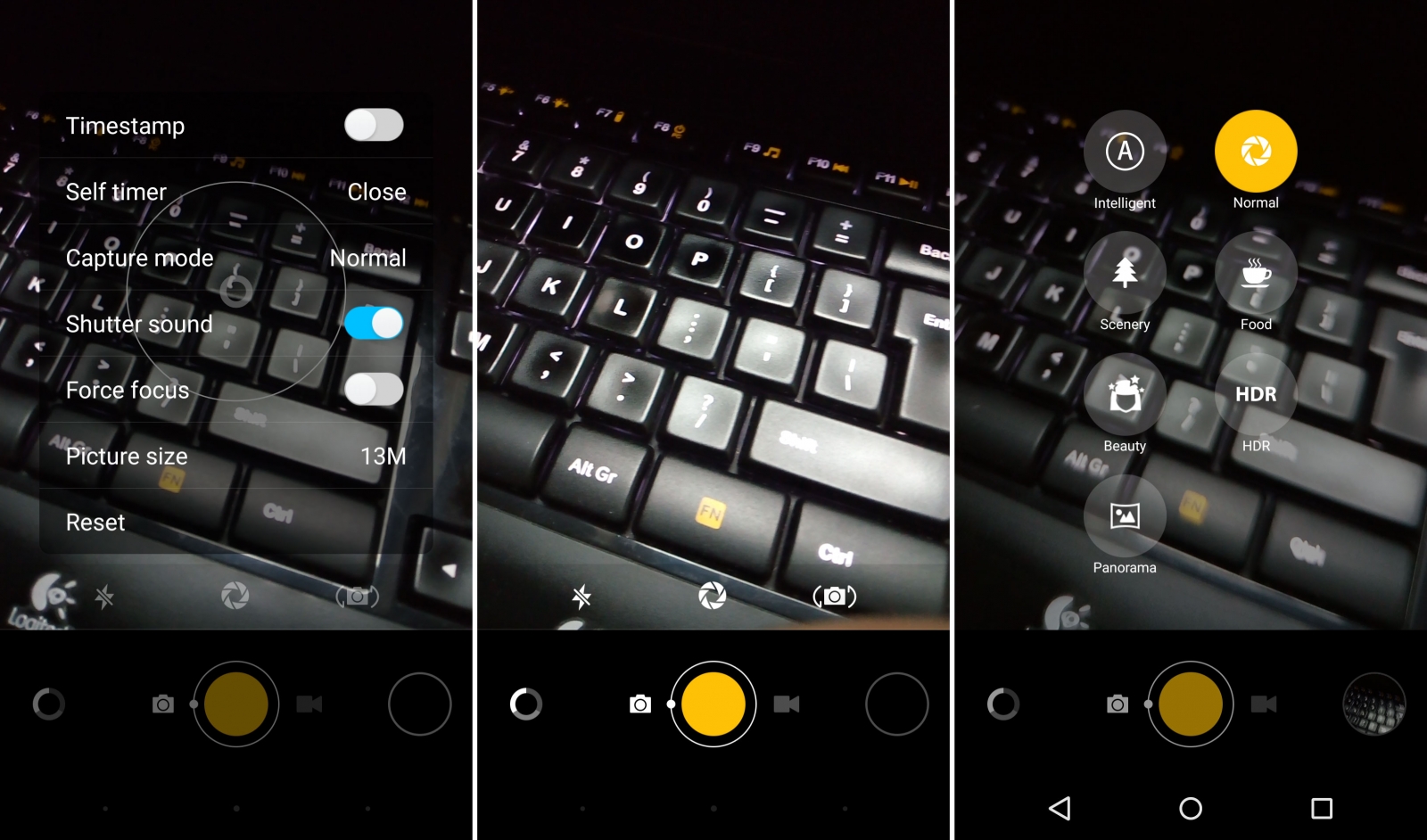 Aplicaţia Camera porneşte cam greu, dar măcar aduce o interfaţă originală. Viteza de focalizare e OK, iar zoomul e fluid, dar realizarea capturilor e cu siguranţă lentă. Cu un swipe în sus declanşăm opţiuni că Timer, Time Stamp, Smile sau Gesture Capture, plus rezoluţia (13 MP la 4:3 sau 6 MP la 16:9). Modurile de captură oferite aici sunt Normal, Food, HDR, Intelligent, Scenery şi Beauty, dar şi Panorama.