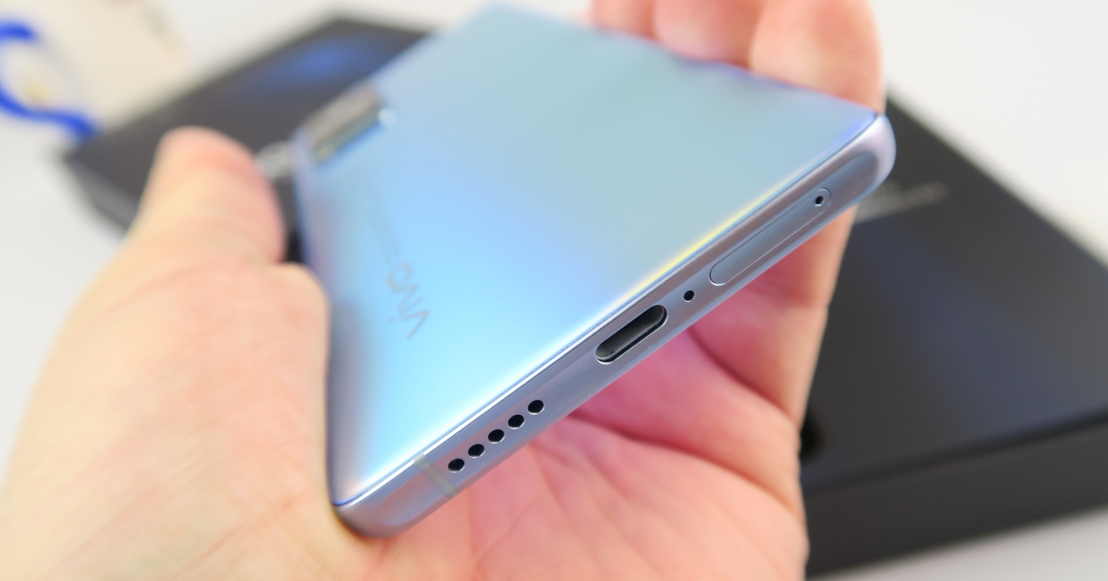 Vivo X60 Pro are un singur difuzor, amplasat în zona inferioară, imediat lângă portul USB-C, microfon şi SIM tray. Vine fără jack audio, dar are adaptor în cutie, de la USB-C la jack audio de 3.5 mm. Mai mult de atât primim şi o pereche de căşti şi nu e vorba despre clasica clonă de EarPods, ci un accesoriu cu design diferit.