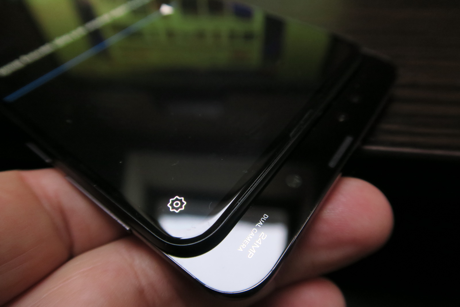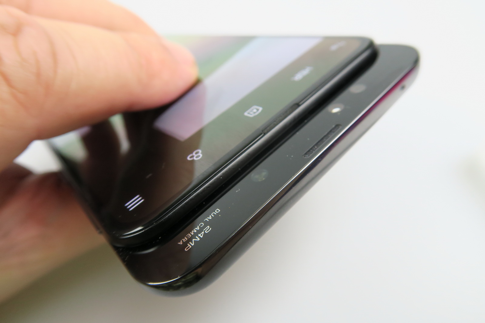 O mută pe un panou glisant în spatele telefonului. Glisarea se face în sus, dezvăluind cele două camere selfie şi utilizatorul e cel care împinge acea porţiune, nu avem motoraş ca la Oppo Find X. Dacă ai mâna prea uscată poţi uita de glisare uşoară cu o singură mână, deoarece degetele alunecă pe display.