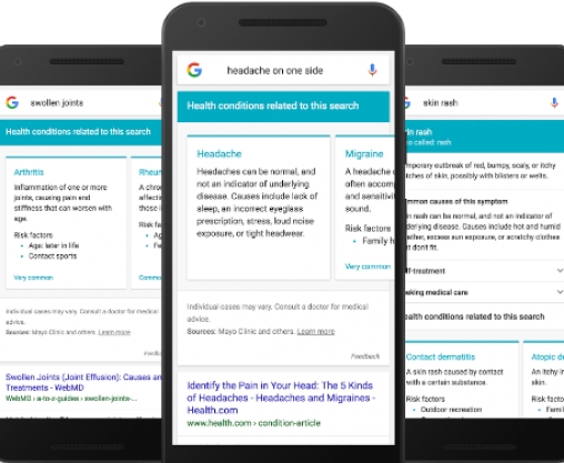 Google a actualizat recent rezultatele afişate atunci când treci pe motorul de căutare simptome precum "durere de cap", "iritaţie" sau "mă doare burta". Noile rezultate vor induce mai puţin în eroare personaele afectate, care până acum se panicau văzând cele mai înspăimântătoare rezultate şi aceste noi informaţii vin prin aportul Harvard Medical School şi Mayo Clinic.