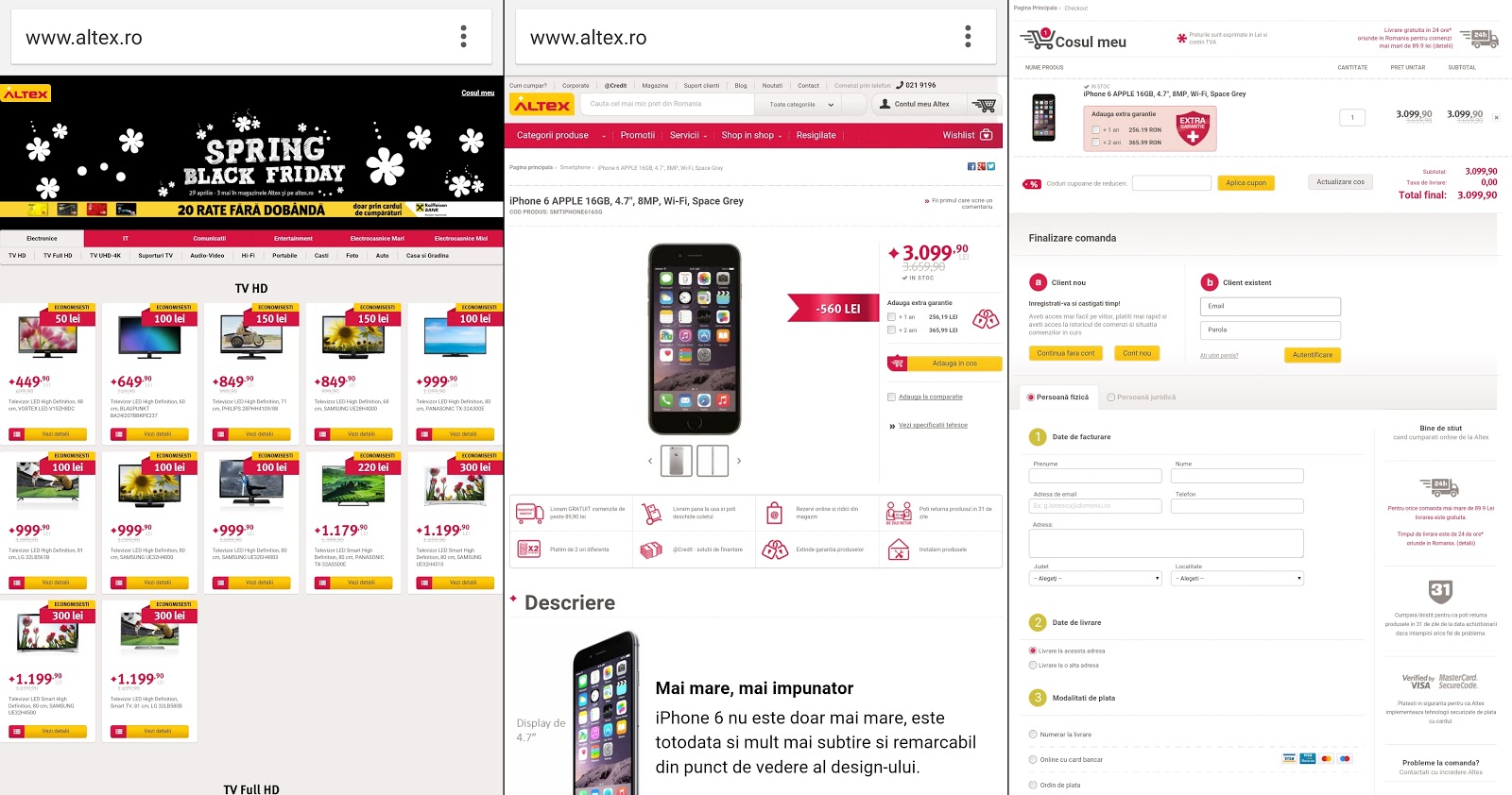 Primul magazin avut în vizor a fost Altex, retailer care din păcate nu are un site optimizat pentru mobil. În ciuda acestui fapt, procesul de cumpărare a unui produs s-a dovedit a fi destul de rapid, lucru ajutat și de conexiunea WiFi. Am ales ca produsul comandat să fie un iPhone 6, device regăsit la majoritatea magazinelor online.