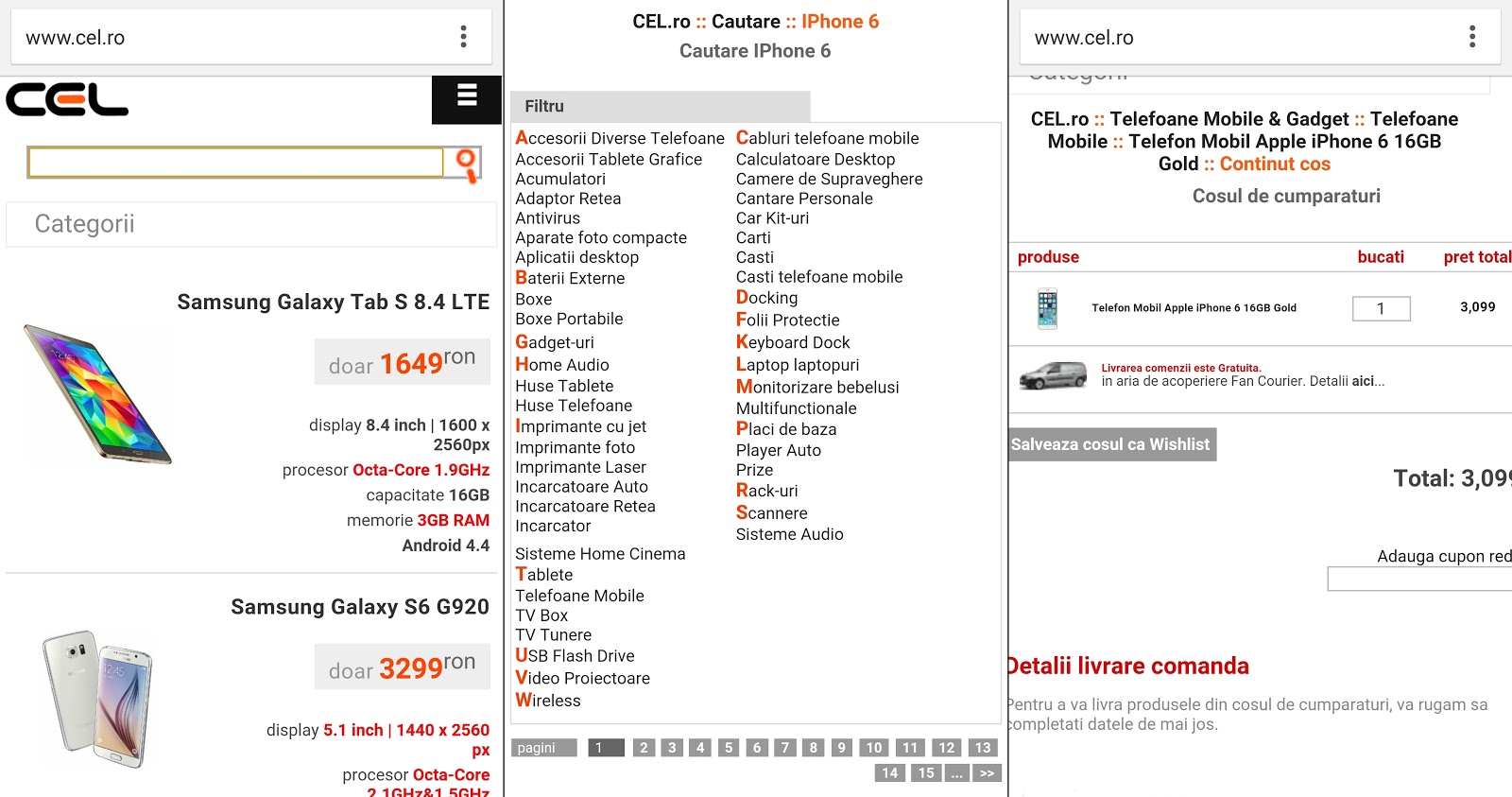 A venit apoi rândul unei comenzi efectuate pe Cel.ro, site optimizat pentru navigarea prin intermediul unui telefon. Imediat ce am intrat pe site și am introdus produsul dorit în caseta de căutare, a urmat alegerea categoriei vizate dintr-o listă destul destul de mare. Odată ajuns la iPhone 6, am adăugat produsul în coș și am finalizat comanda odată cu completarea datelor personale. Timpul a fost de doar 1,28 minute.