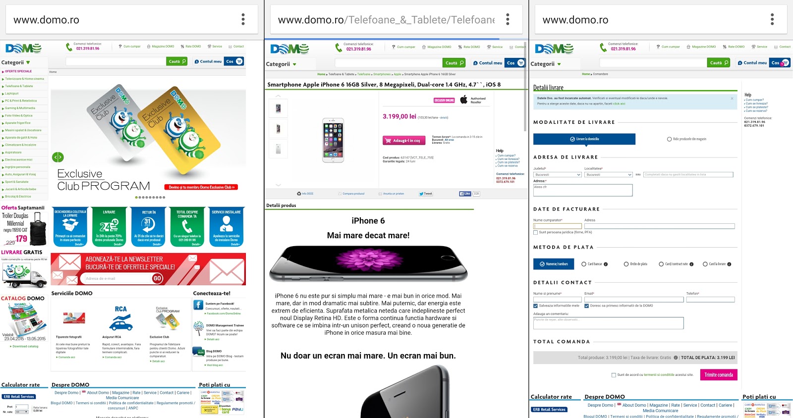 O experiență greoaie am întâmpinat-o și în cazul Domo.ro, site-ul nefiind optimizat pentru folosire pe smartphone. Cu toate că am găsit relativ rapid produsul printre secțiunile site-ului, completarea datelor a făcut ca tot procesul să dureze 1,45 minute, un timp totuși bun, având în vedere greutățile întâmpinate.
