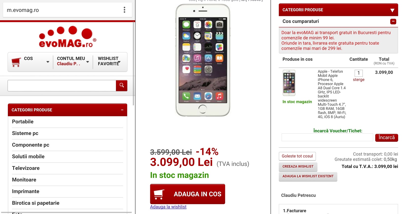 Nu în ultimul rând, am testat durata de plasare a unei comenzi și prin intermediul evoMAG.ro, site care deține o platformă optimizată pentru mobil care arată foarte bine. Atât căutarea, cât și completarea datelor s-a desfășurat rapid fără probleme, timpul final fiind de 1.25 minute, cel mai bun totodată.