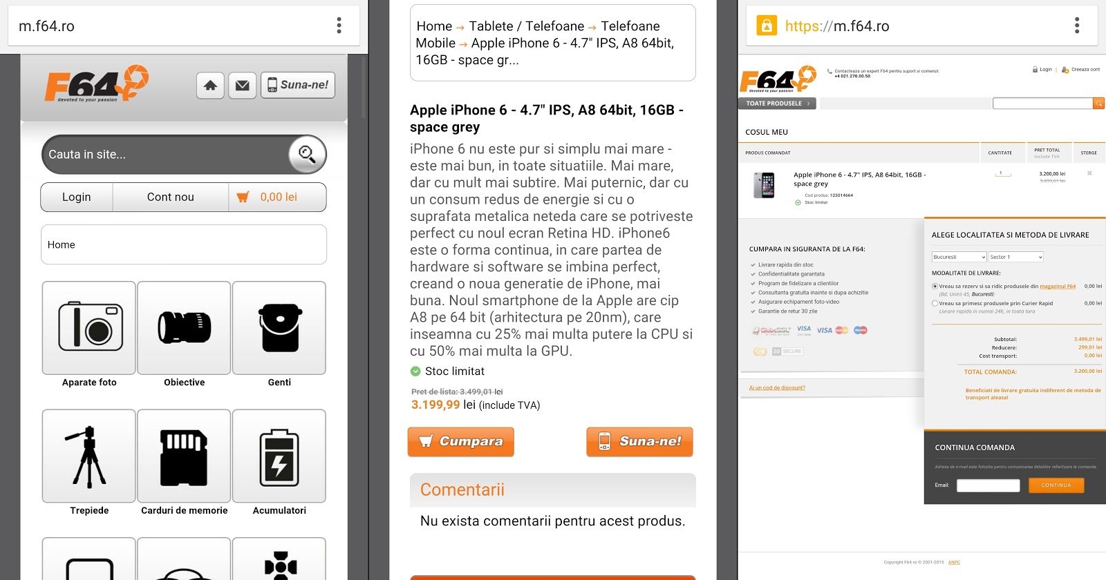 În cazul F64.ro lucrurile au fost puțin ciudate, interfața site-ului fiind afișată atât în mod optimizat pentru mobil, cât și în varianta desktop la un moment dat. De asemenea, achiziția fără un cont de utilizator este imposibilă, așa că minute prețioase au fost pierdute și cu acest pas, motiv pentru care timpul total a ajuns la 4,02 minute.