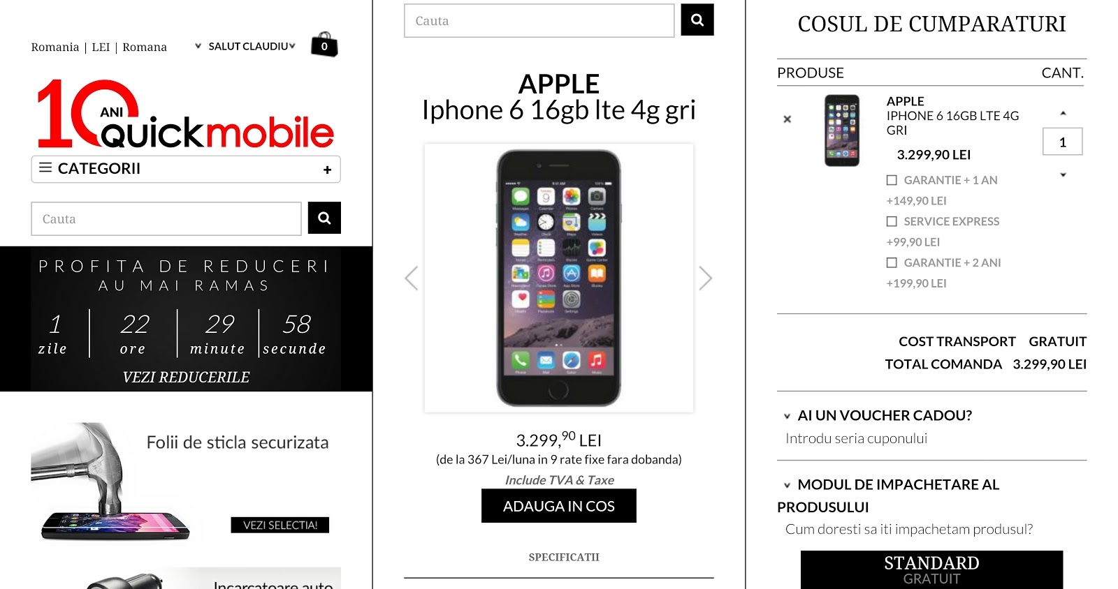 QuickMobile.ro ne oferă un site optimizat unde telefoanele sunt afișate foarte clar în categorii, lucru ce face ca experiența de achiziție să fie una plăcută. Timpul total de plasare a unei comenzi a fost de 1,50 minute datorită procesului de căutare îndelungat.