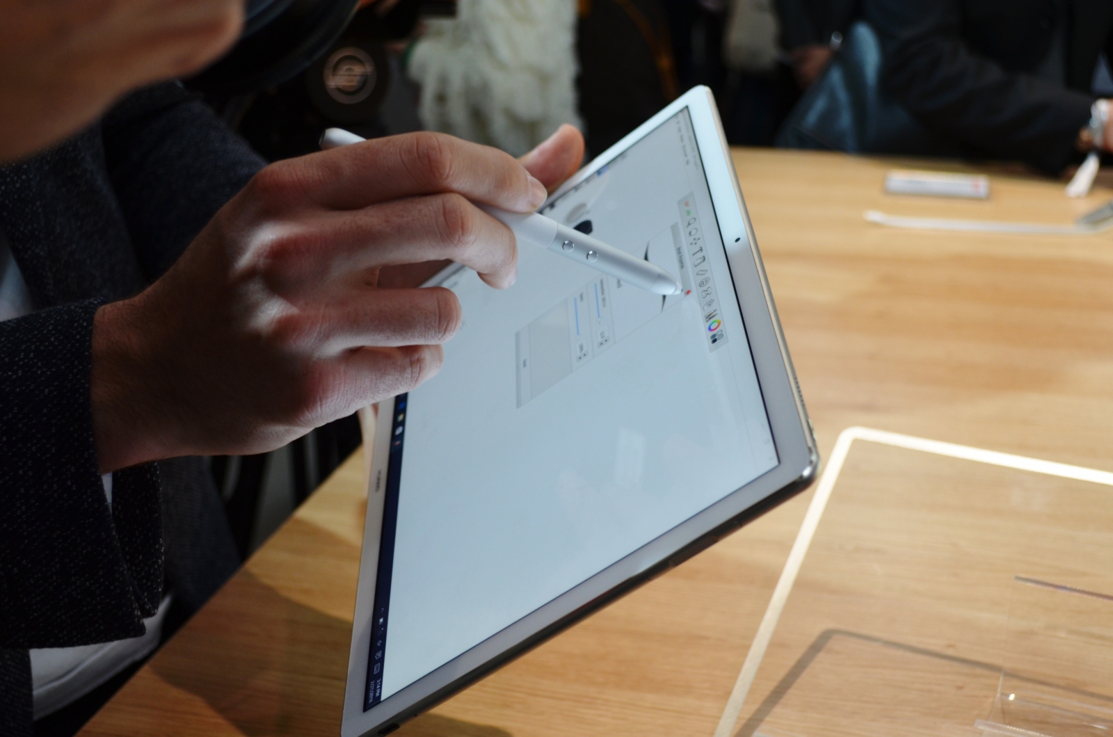 Odată ajuns m-am așezat la scurta coadă formată înaintea mea, urmând ca la ora 13:00 să ni se permită accesul în sală. O oră mai târziu pe scena amplasată la fața locului pășea Richard Yu, CEO-ul companiei chineze. Cum aflam încă din leak-uri, a fost vorba despre un terminal de tip hibrid laptop-tabletă.