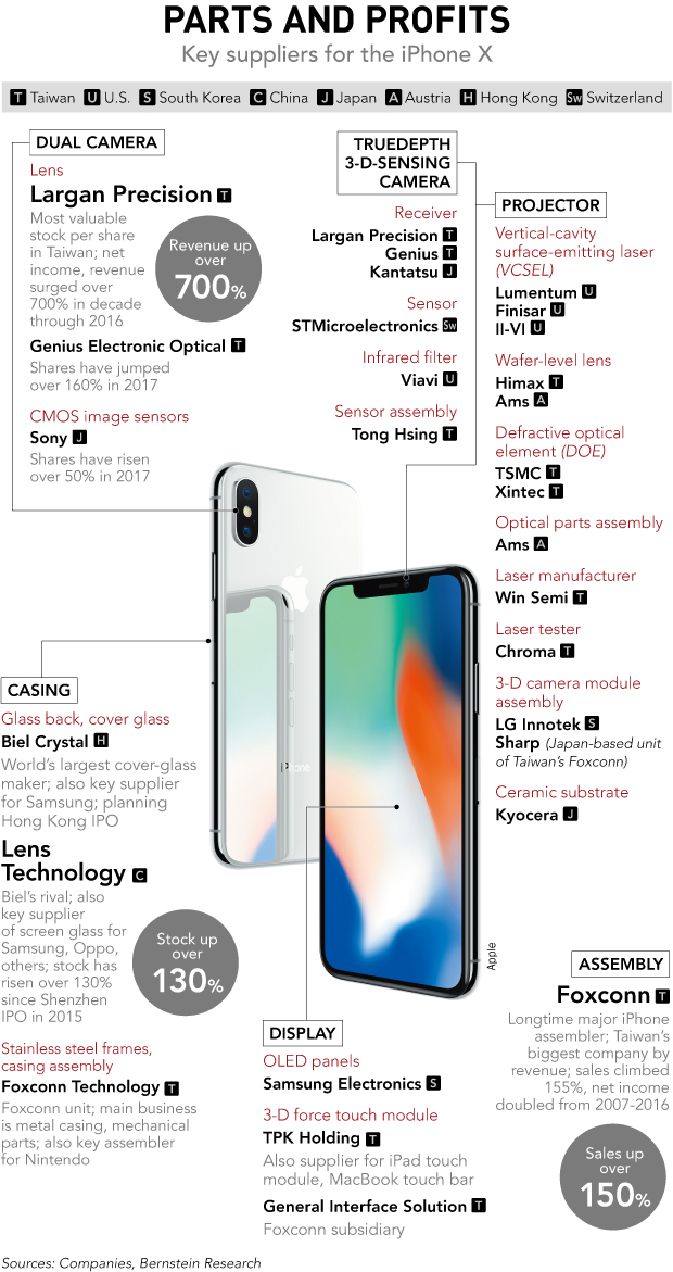 TSMC şi Xintec furnizau elemente optice, iar componentele optice veneau de la Ams. LG Innotek şi Sharp şi-au împarţit ansamblul modulului de cameră 3D, iar Kyocera a avut substratul ceramic. Mai ţineţi minte când Apple dorea să pună sticlă de safir pe toate ecranele? În 2013 Apple semna un contract de 578 de milioane de dolari cu GT Advanced Technologie, pentru a construi o uriaşă fabrică de sticlă de safir în Mesa, Arizona.