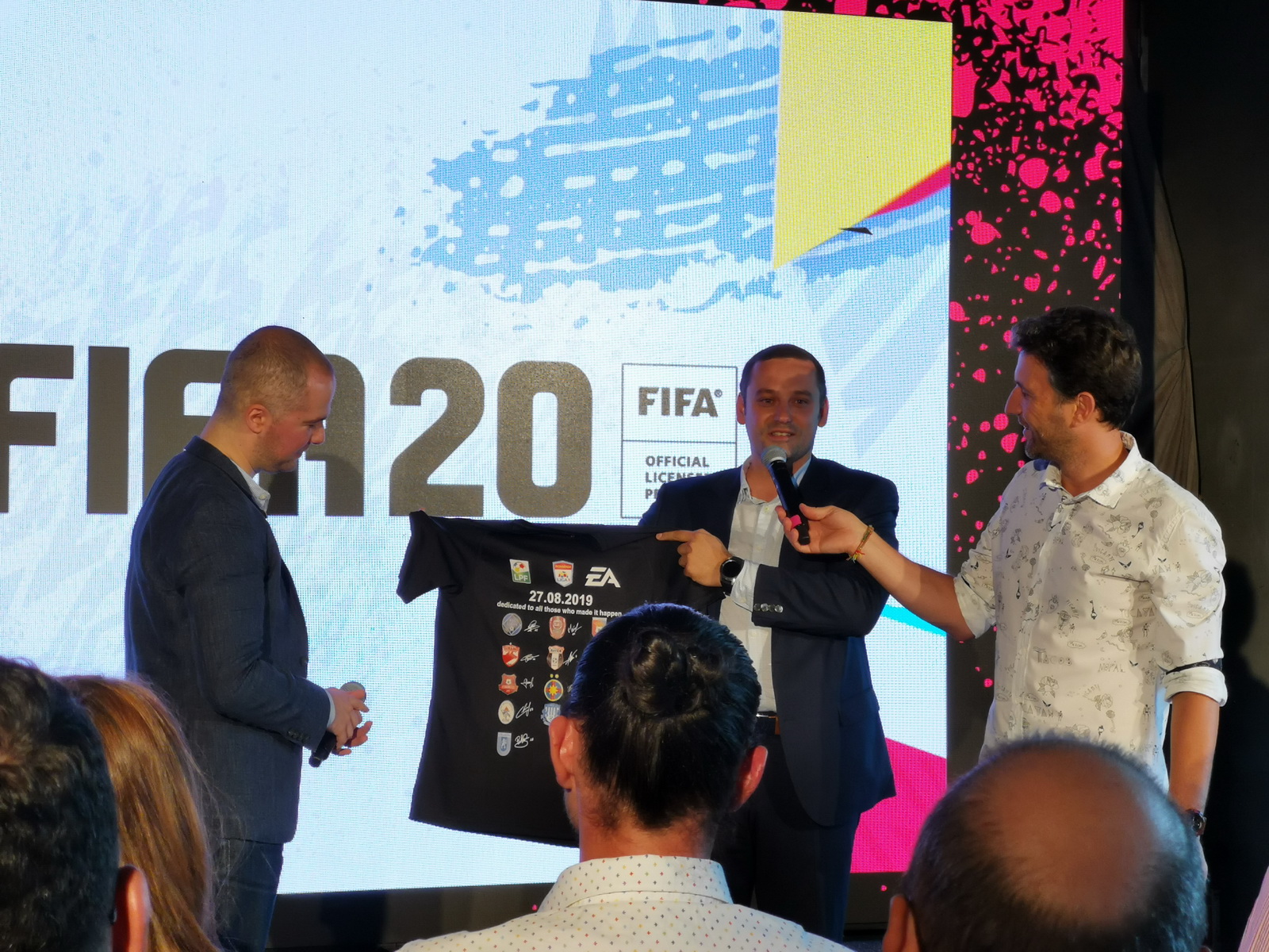 Andi Moisescu a fost gazda evenimentului şi ne-a vorbit despre nopţile lungi pierdute jucând FIFA, dar şi despre nopţile lungi pierdute de programatorii de la EA România, care contribuie decisiv la dezvoltarea seriei FIFA. De altfel FIFA 20 e realizat în bună parte de EA România şi EA Vancouver. Pe scenă a urcat şi Andrei Lăzărescu, EA SPORTS FIFA 20 Senior Producer, EA România, care a făcut marele anunţ: cele 14 echipe din Liga 1 sunt acum în FIFA 20. Cu tot cu tricouri oficiale, blazoane, mingi de meci şi jucători la zi.