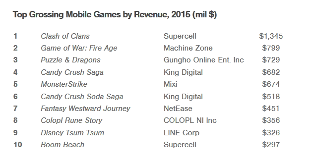 Ceea ce vedeţi mai sus sunt cifrele oficiale legate de veniturile aduse de jocurile pentru mobil anul trecut. Clash of Clans e pe primul loc, cu 1.345 miliarde de dolari, cu 300 de milioane de dolari sub League of Legends de pe PC totuşi. Pe 2 se afla Game of War, care a folosit-o pe Kate Upton pentru imagine într-o reclamă de la Super Bowl. Game of War a înregistrat 799 milioane de dolari venituri, iar pe 3 se afla Puzzle & Dragons, cu 729 milioane de dolari.