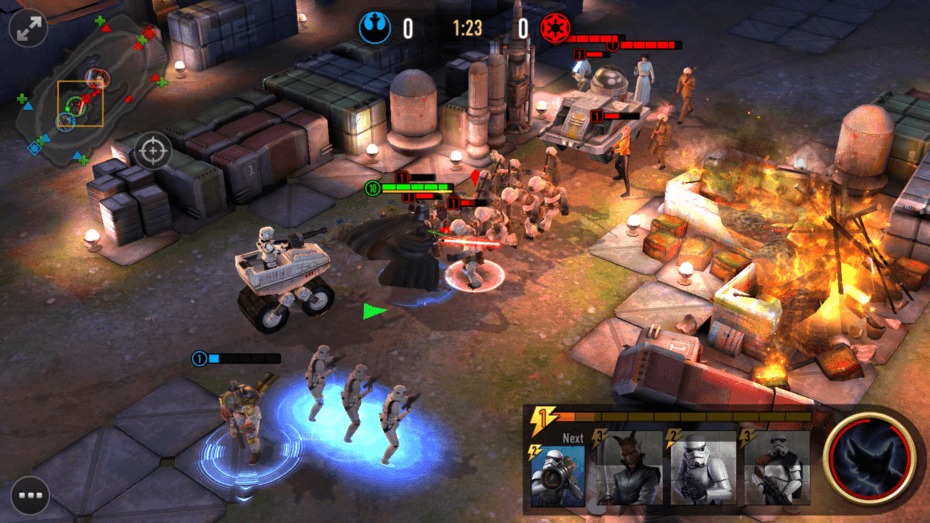 Subliniez din nou că grafica arată bine şi toţi fanii Star Wars vor fi mulţumiţi de acest lucru. Hărţile sunt extrem de mici, iar comparaţia cu Vainglory jigneşte acel joc sincer să fiu. Primim 10 eroi principali pentru fiecare tabără, Dark şi Light, plus câte 20 de personaje de suport. Distracţia e garantată, dar există şi un risc al plictiselii în lipsa altei strategii decât "momeşte adversarul la tureta ta, omoară-i eroul şi apoi distruge pe rând turetele sale".