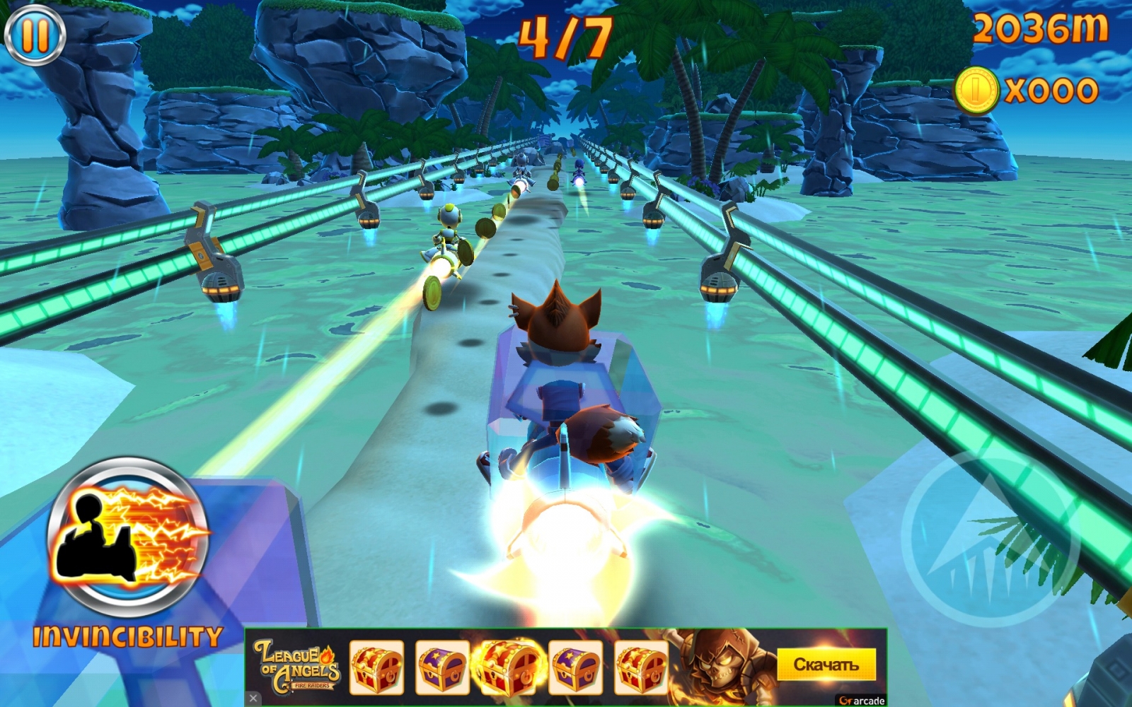 Trebuie să avem grijă să nu lovim copaci sau pietre în drumul nostru şi să terminăm în primii 3 piloţi pentru a accesa următorul circuit. In cale se mai afla si roboti care ne distrug la prima atingere. Controlul e extrem de simplu şi implică doar să ţinem apăsat un buton virtual pe ecran şi să apăsăm pe powerupurile din stânga ecranului, când apar. Ele includ rachete, magneţi, încetinire a timpului şi altele.